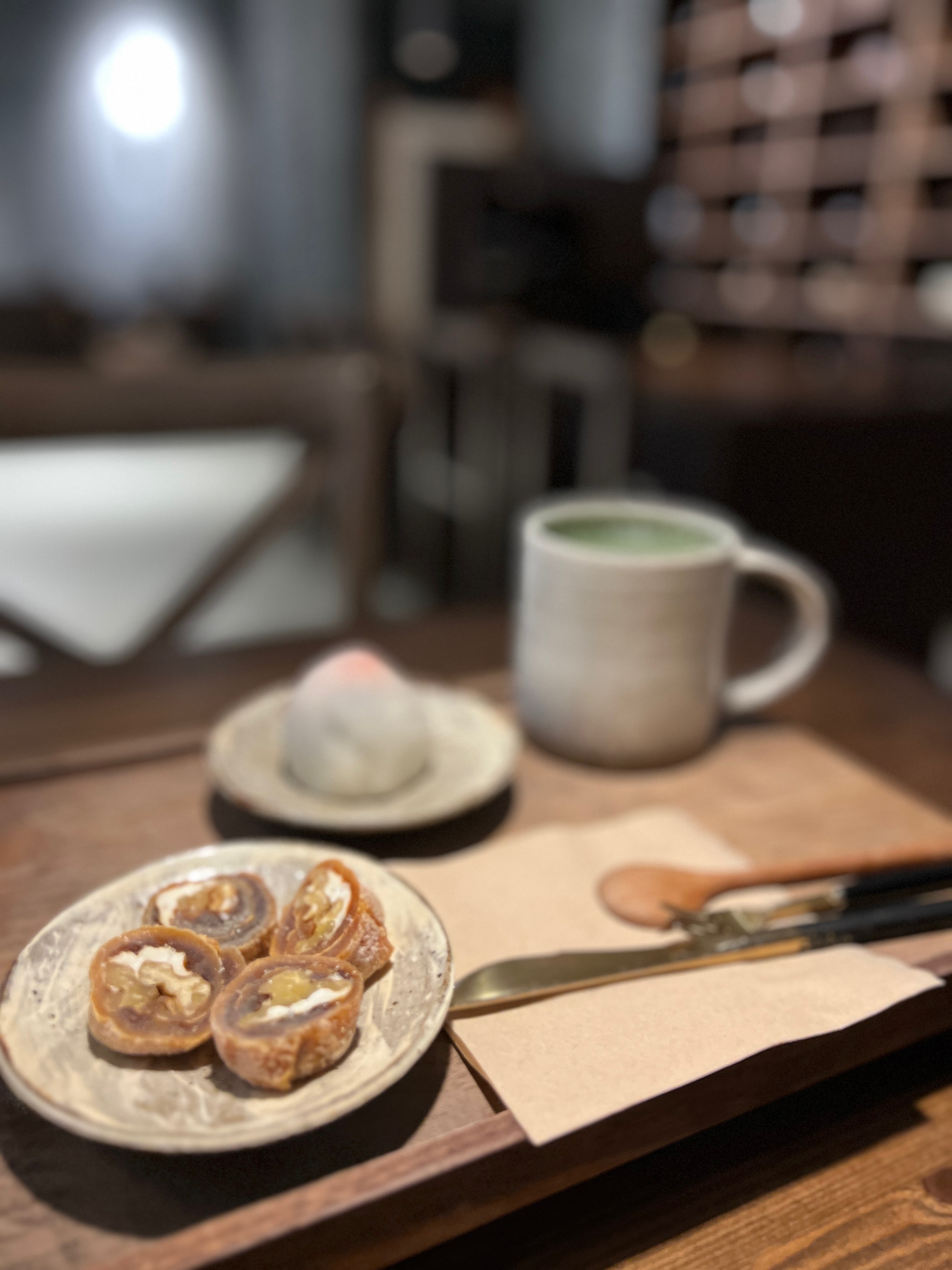 쑥라떼 하나, 딸기모찌, 그리고 곶감말이를 시켰다.