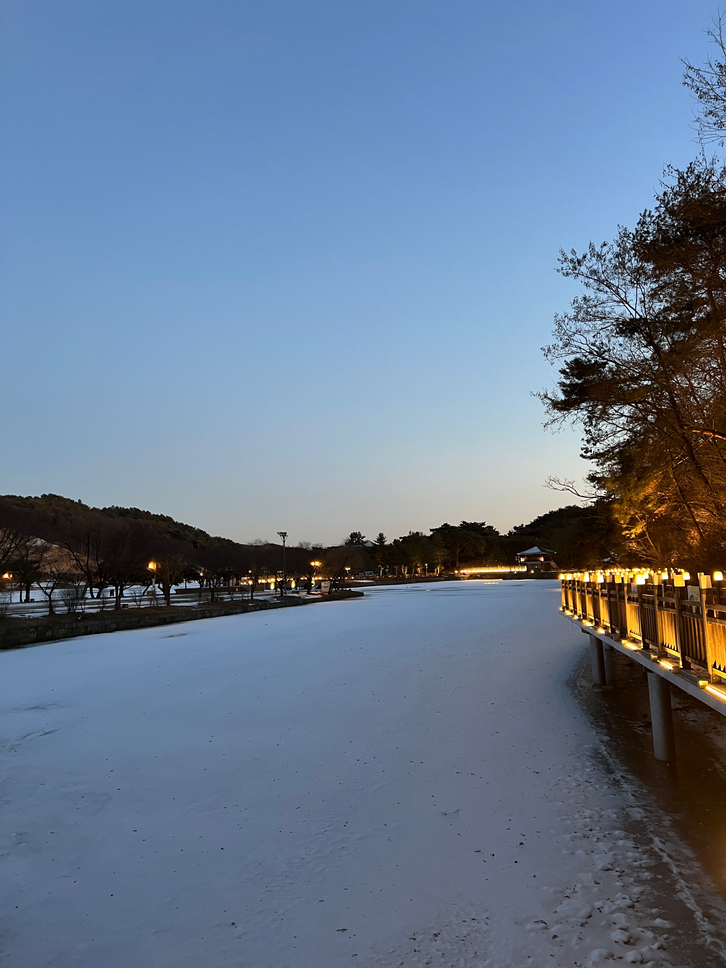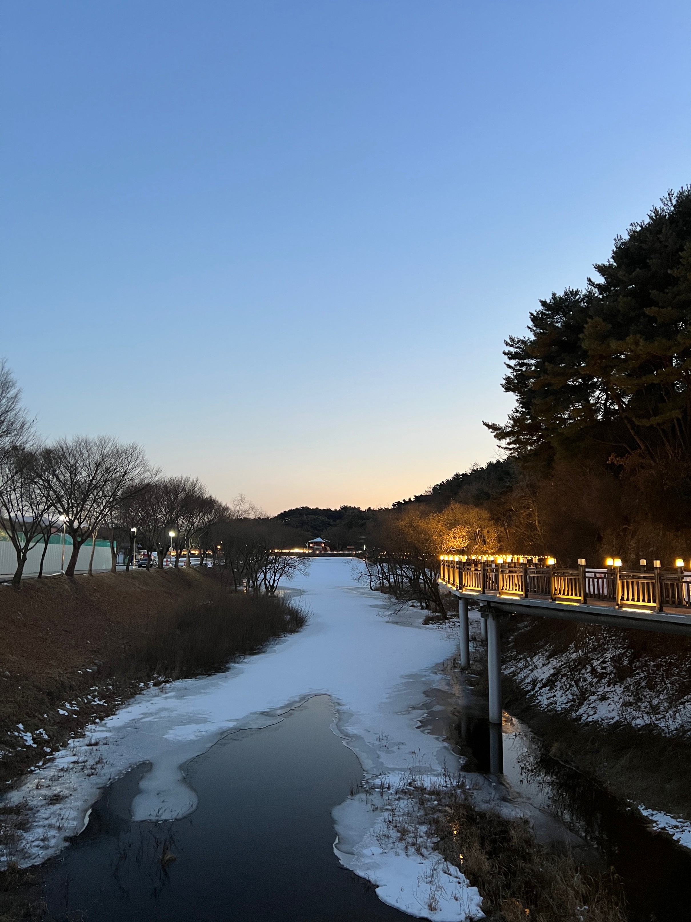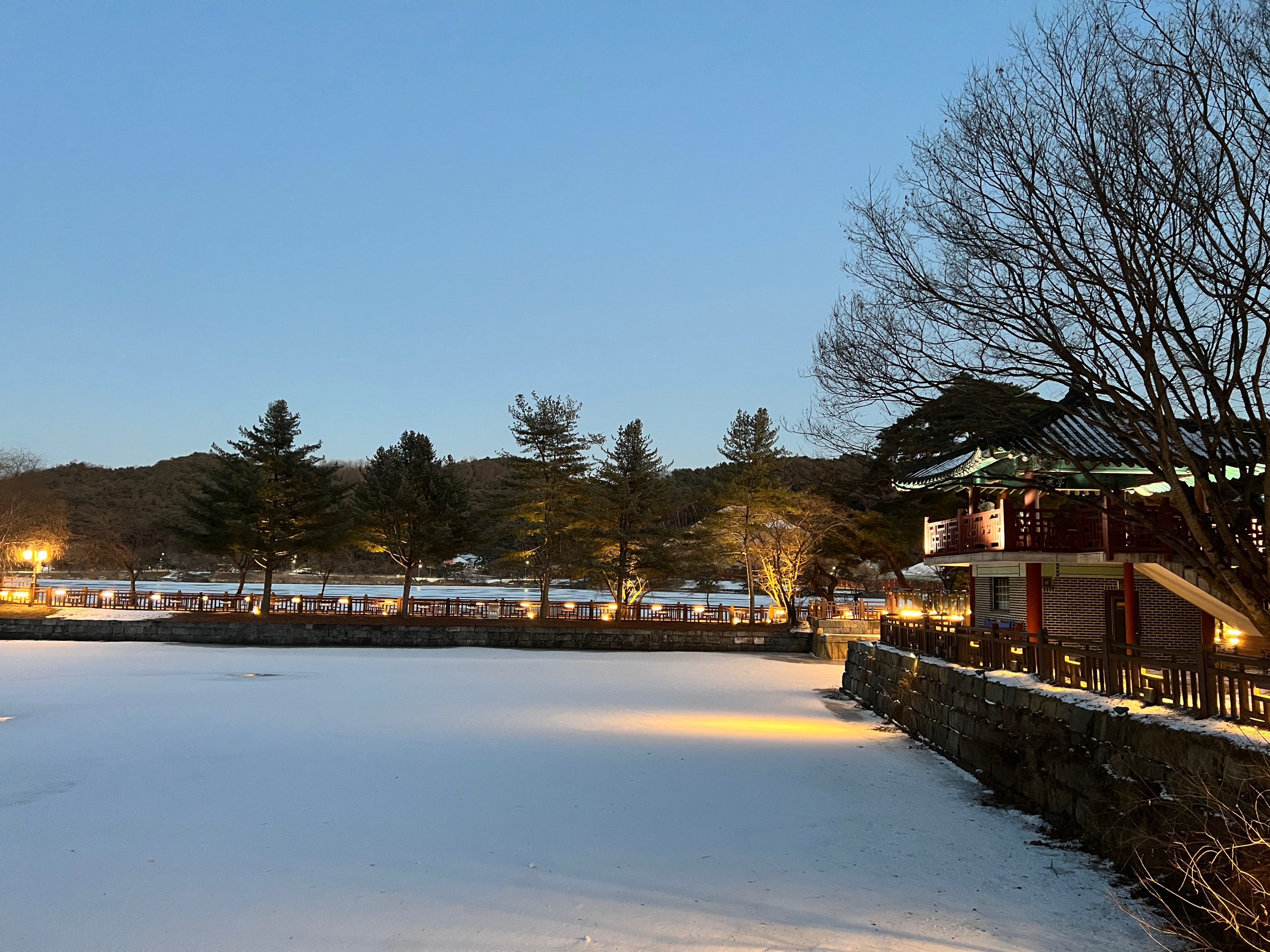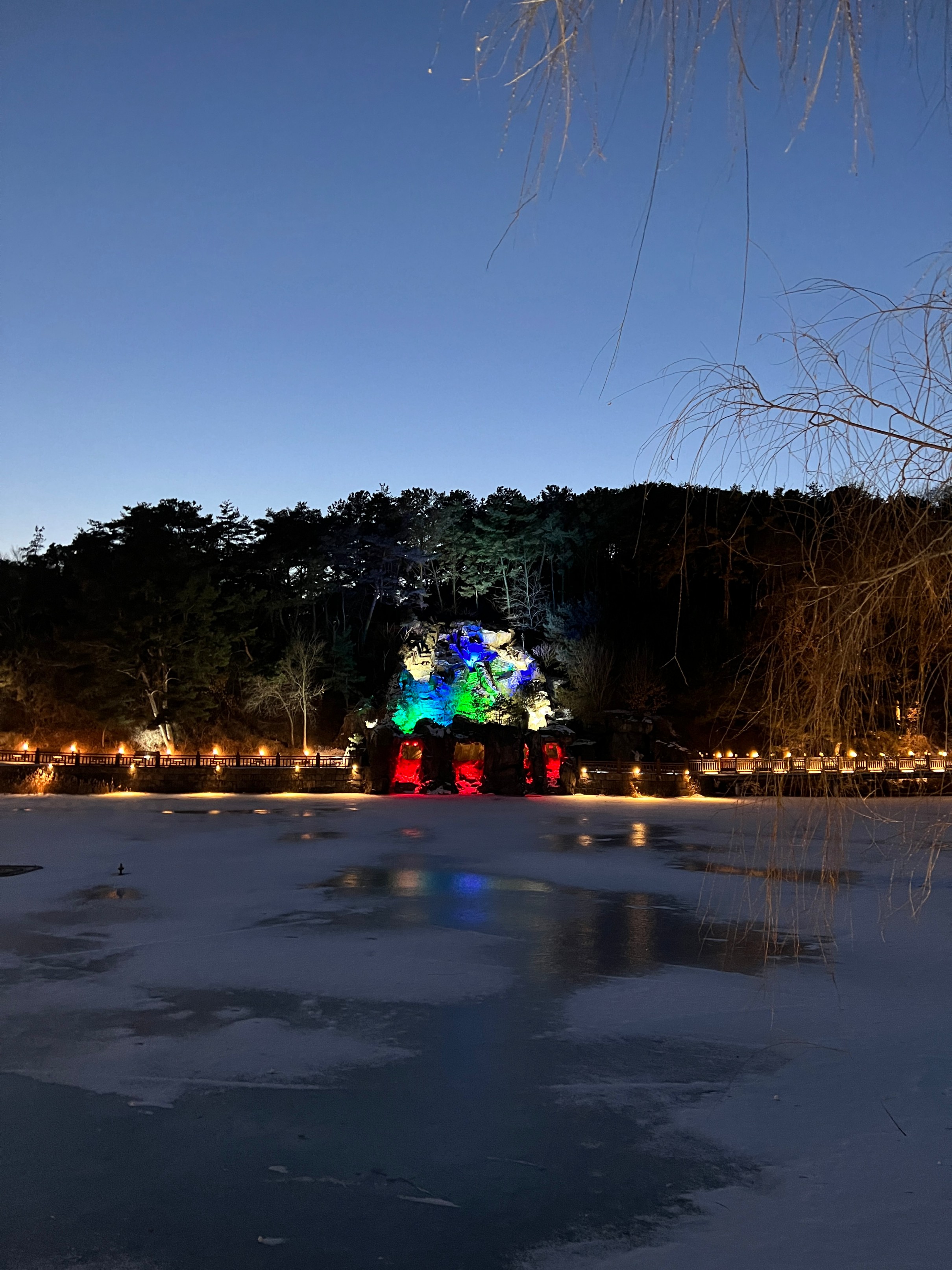 나름 물이 얼어서 그대로 눈이 쌓이고, 주황색 불빛으로 밝히니 야경이 꽤 괜찮았다.
