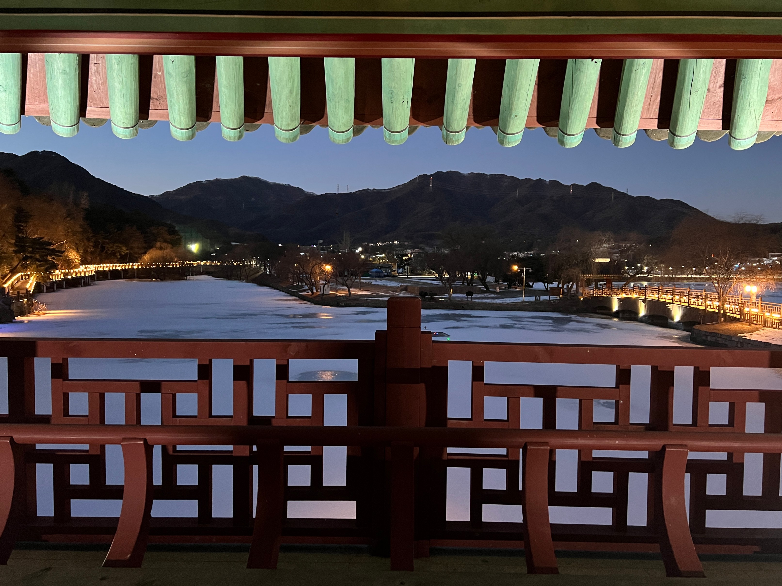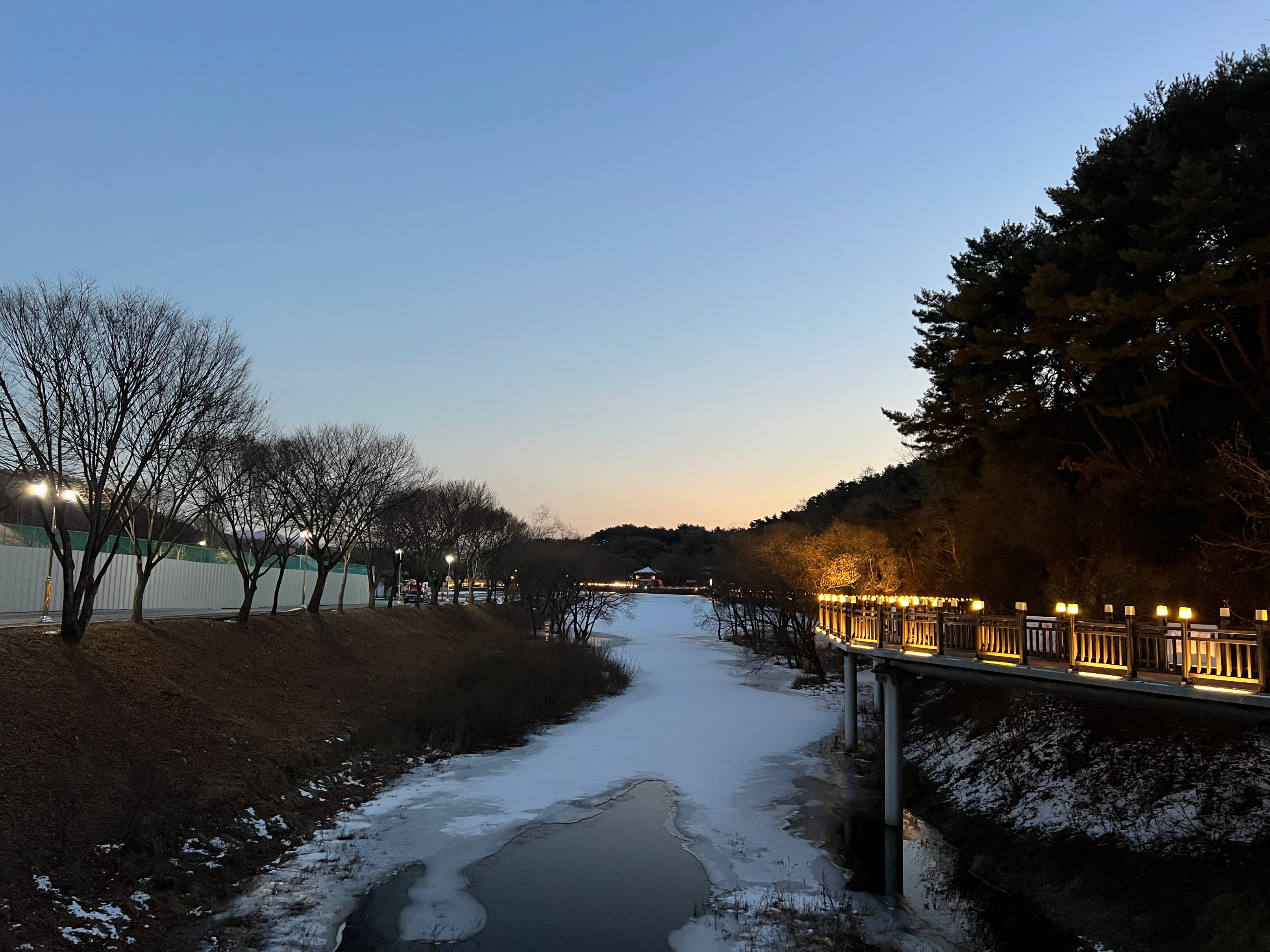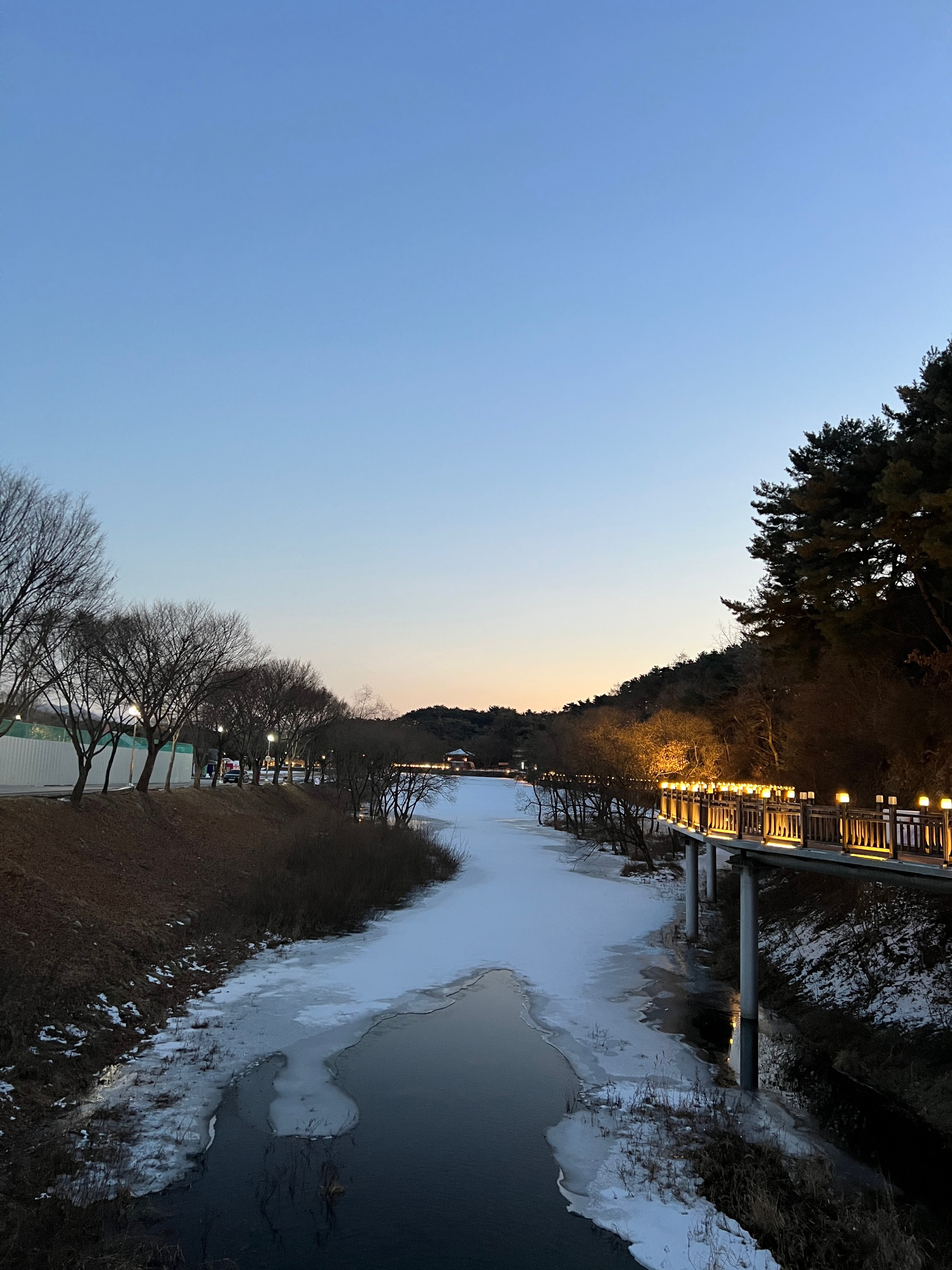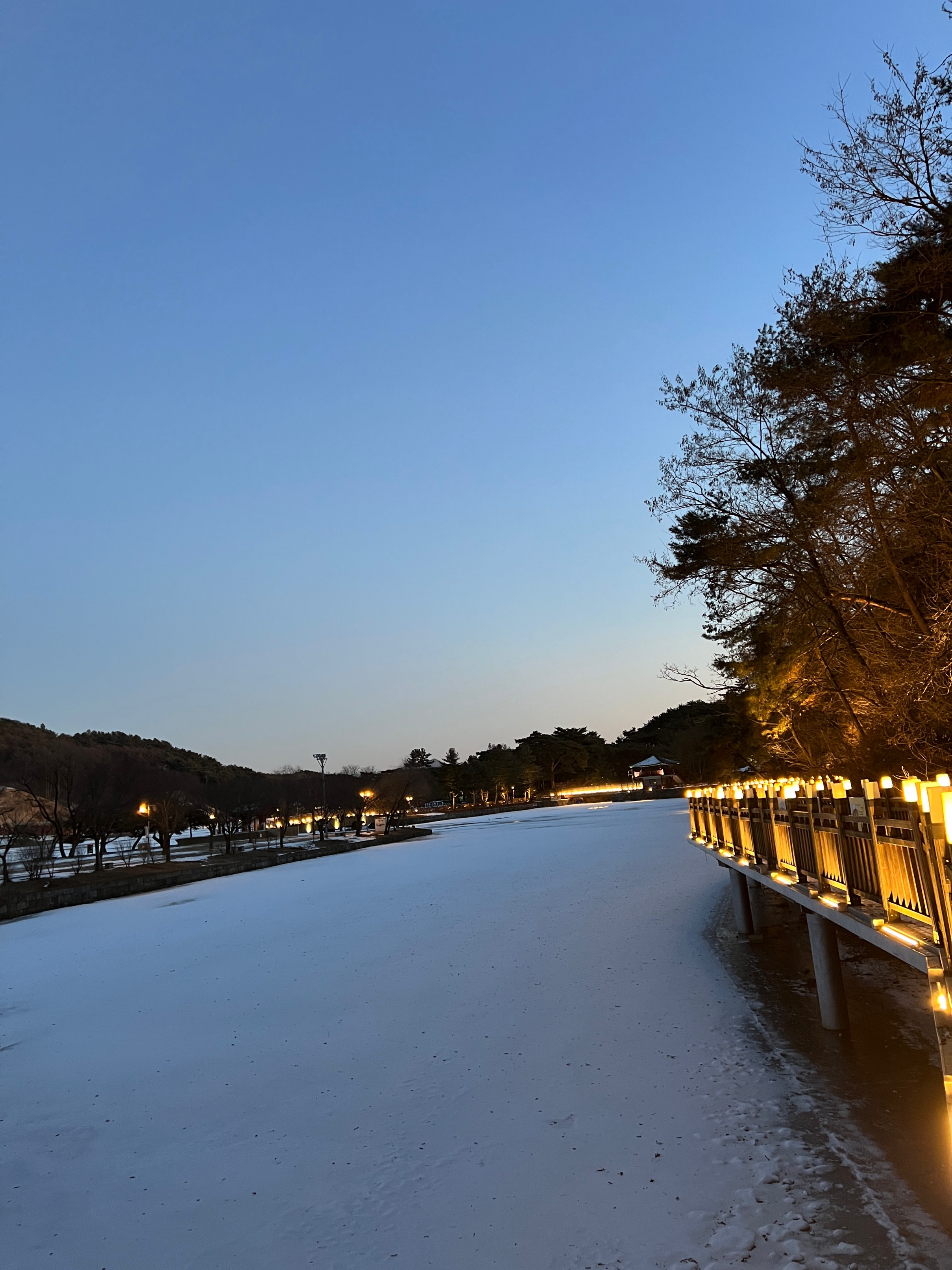 나름 물이 얼어서 그대로 눈이 쌓이고, 주황색 불빛으로 밝히니 야경이 꽤 괜찮았다.