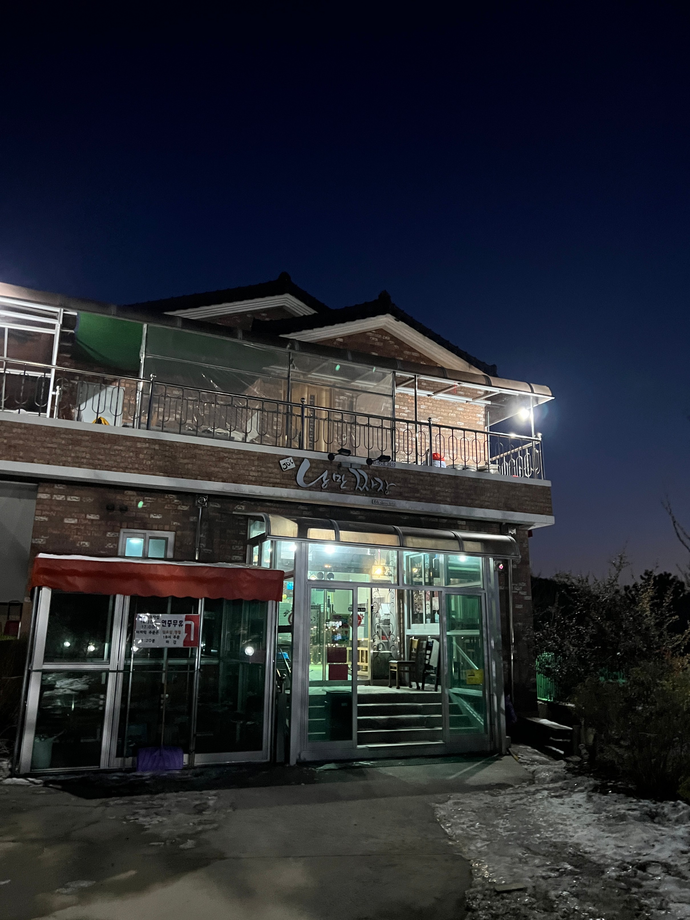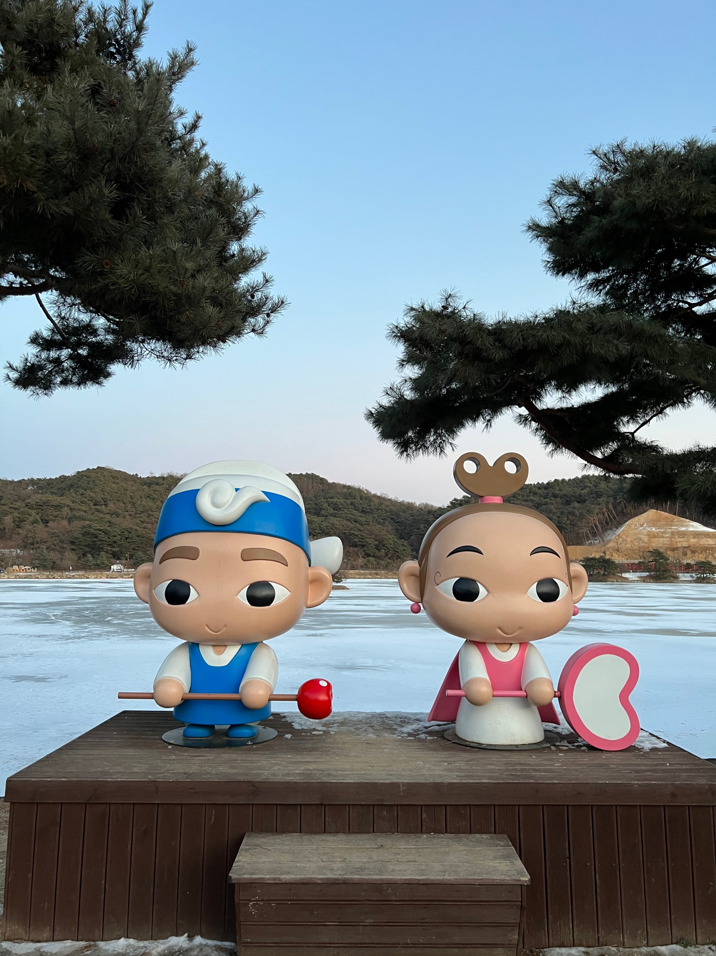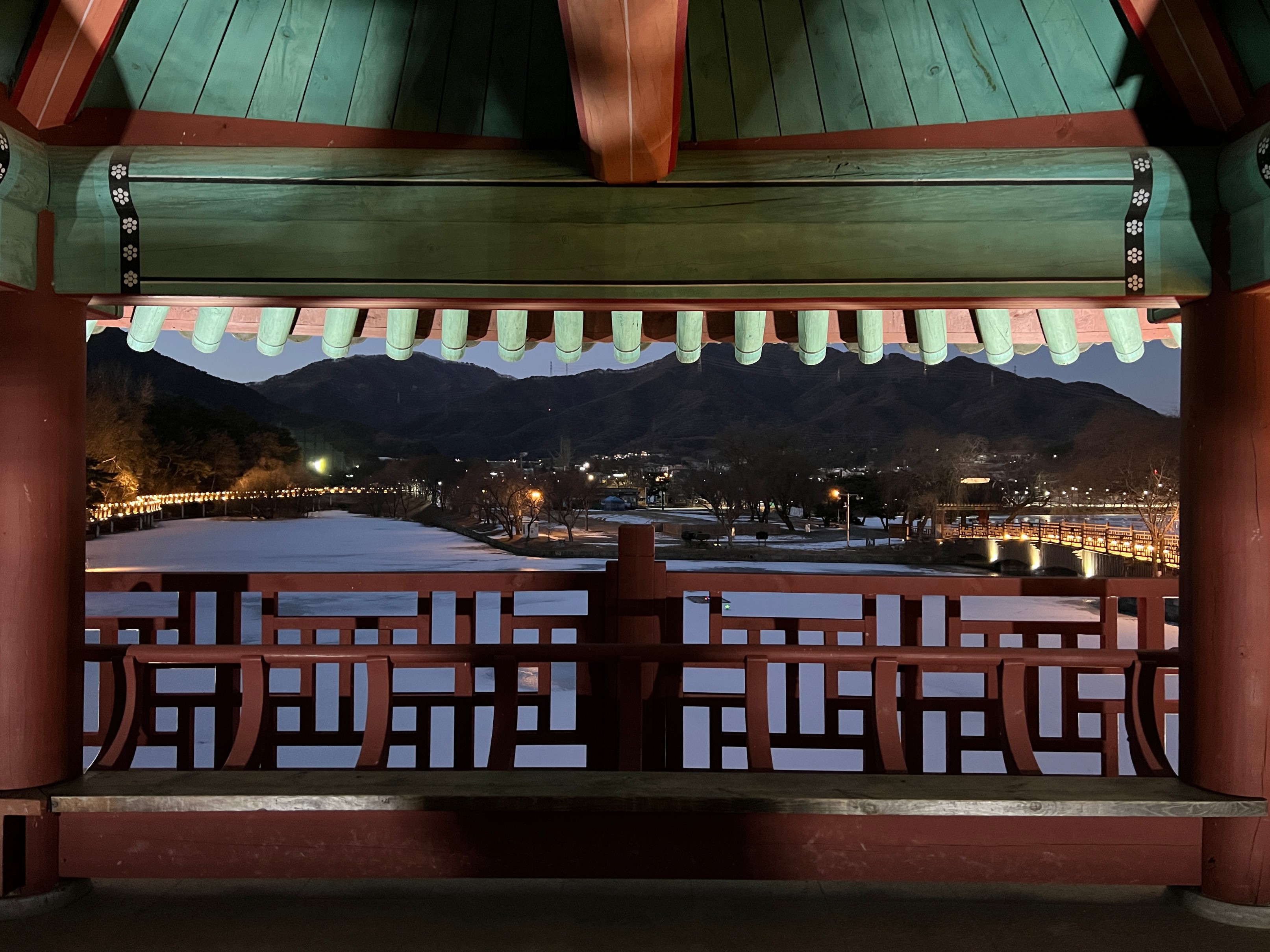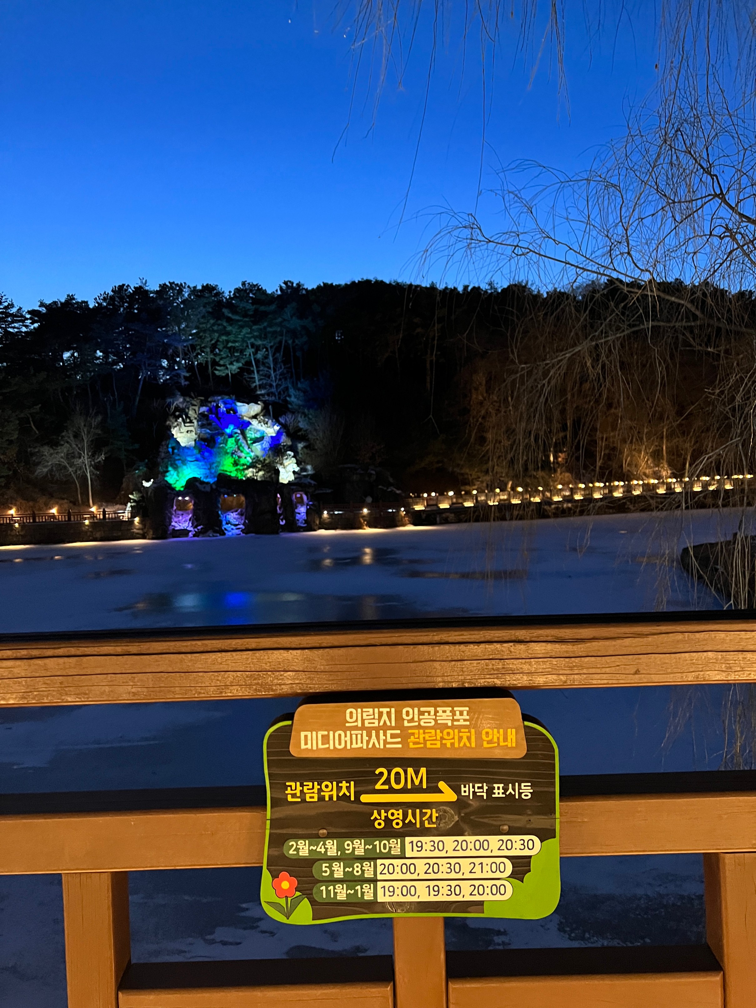 나름 물이 얼어서 그대로 눈이 쌓이고, 주황색 불빛으로 밝히니 야경이 꽤 괜찮았다.