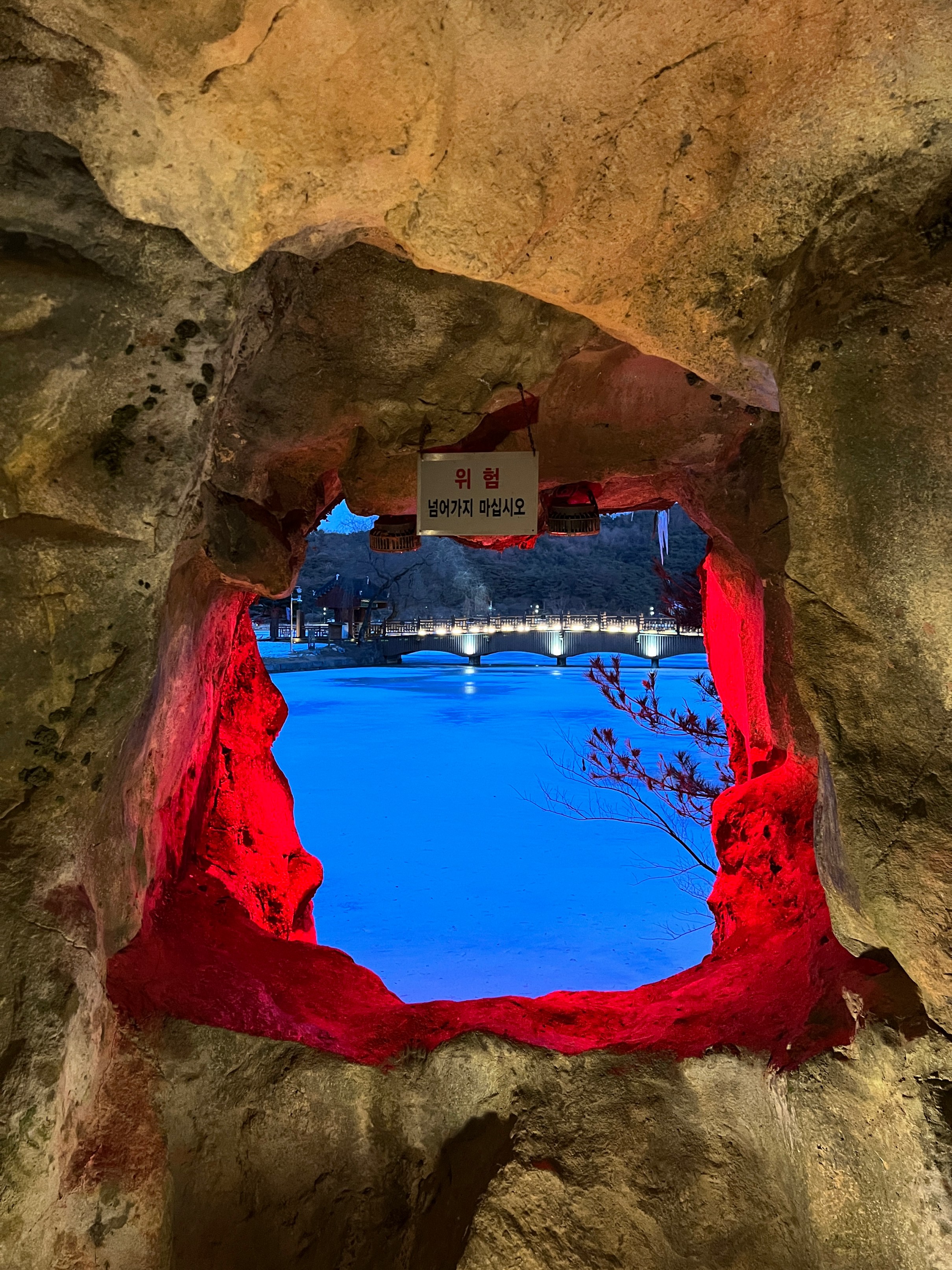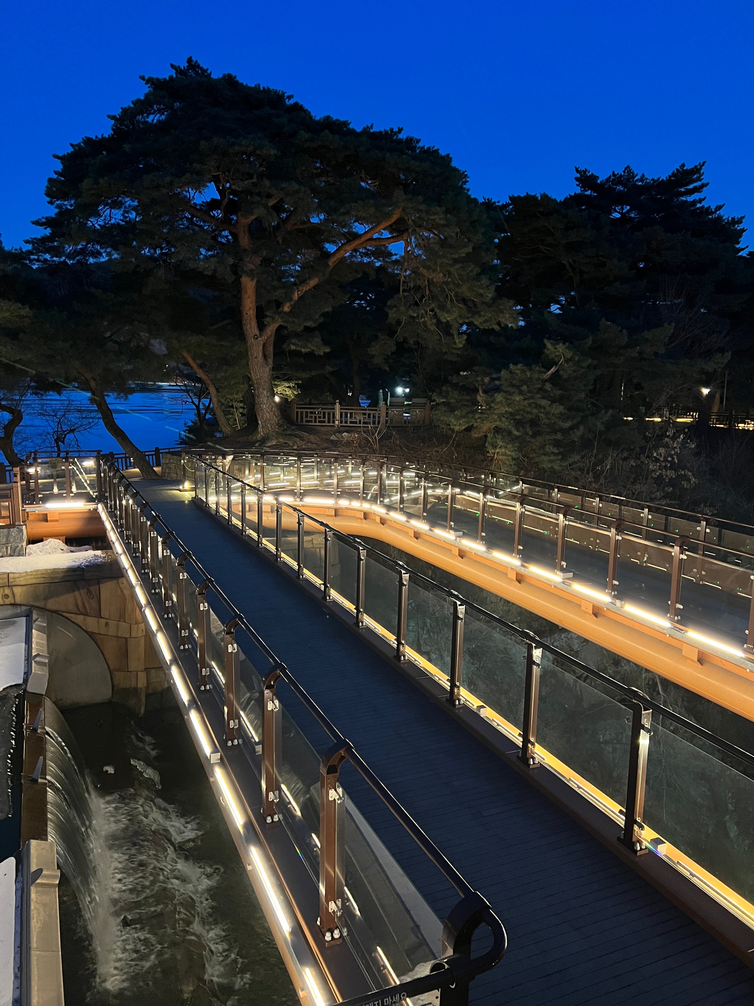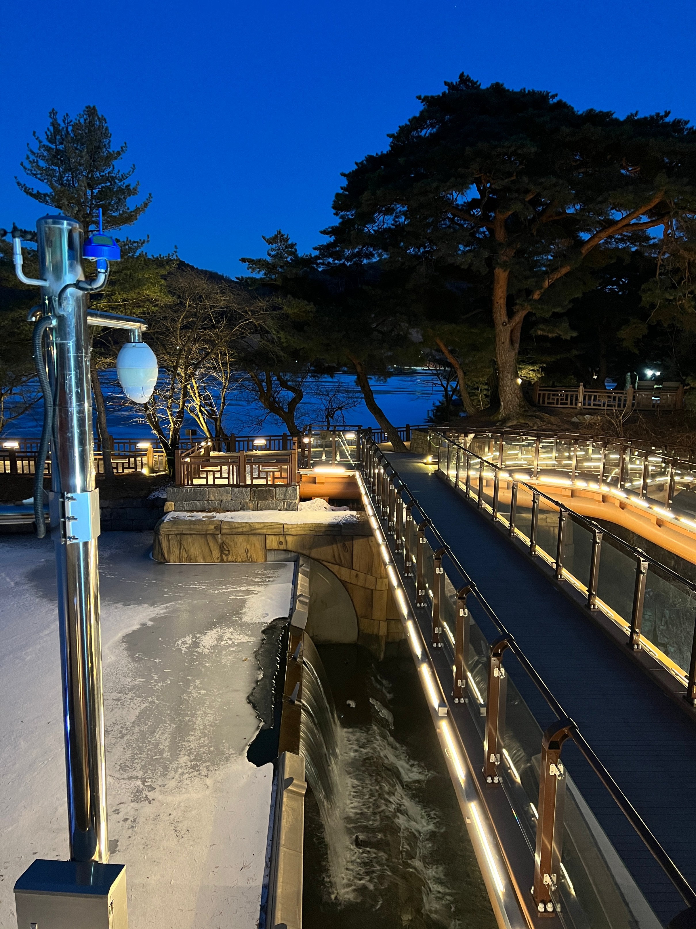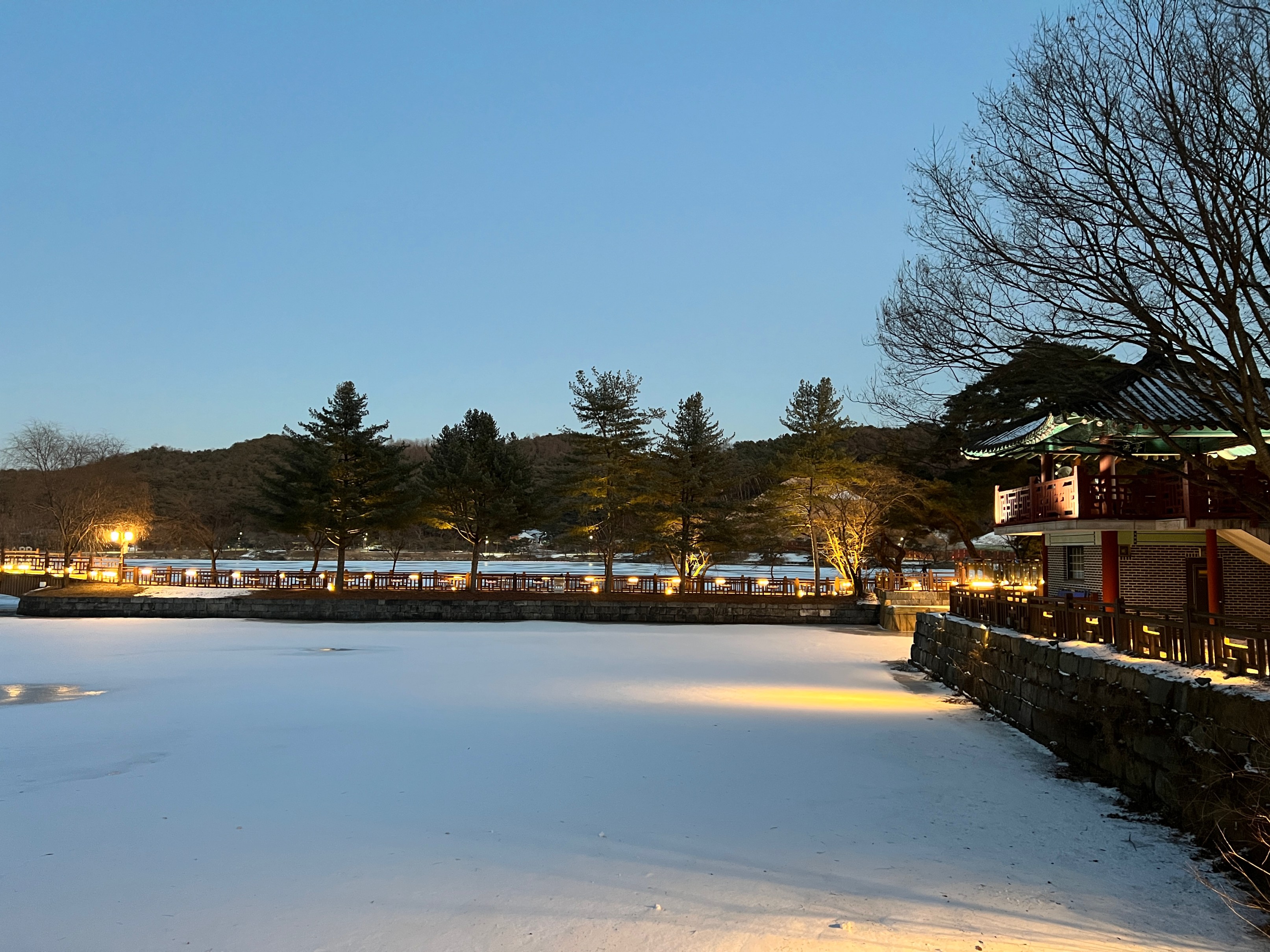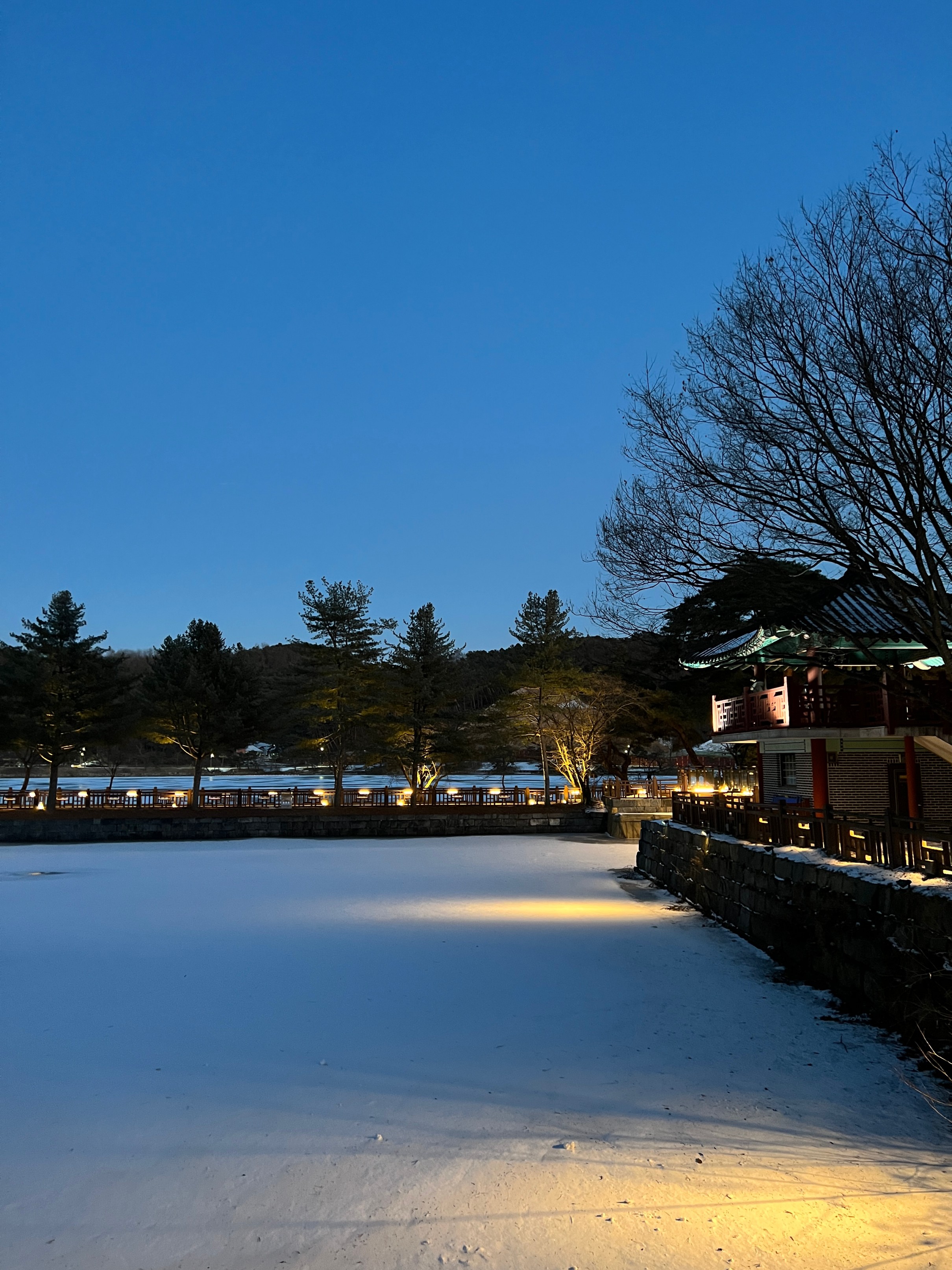 나름 물이 얼어서 그대로 눈이 쌓이고, 주황색 불빛으로 밝히니 야경이 꽤 괜찮았다.