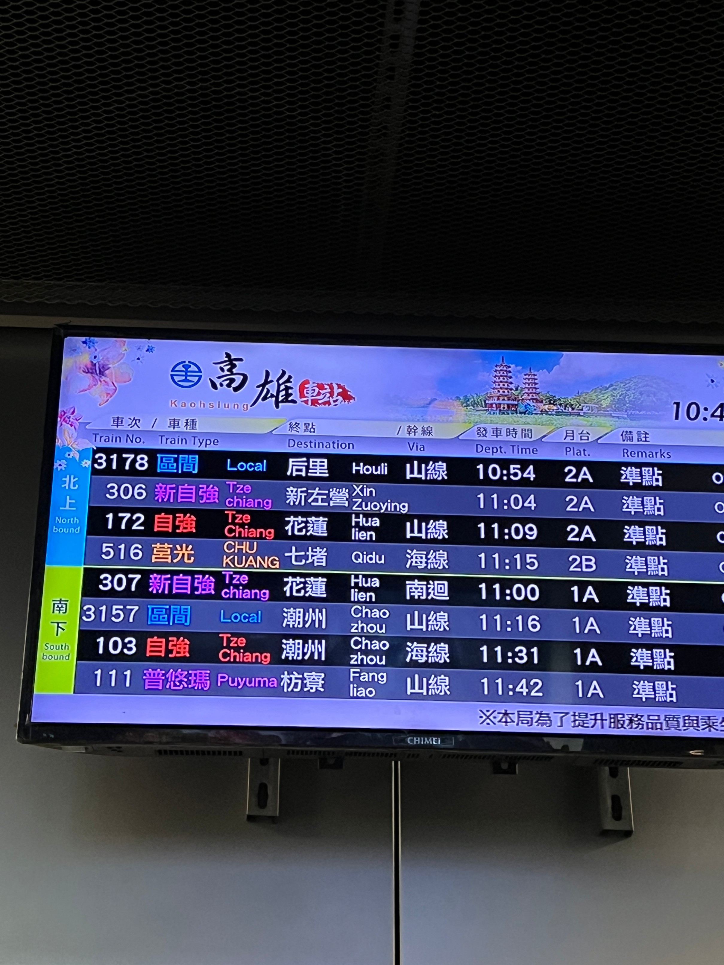 가오슝에서 타이난으로 가기 위해서는 열차를 타야 하는데, 가오슝 기차역으로 가면 된다. 쭤잉역에서도 간다고 하는데 굳이 쭤잉역으로 갈 필요는 없고 미려도역 바로 위에 있는 가오슝 종합터미널로 가면 된다.