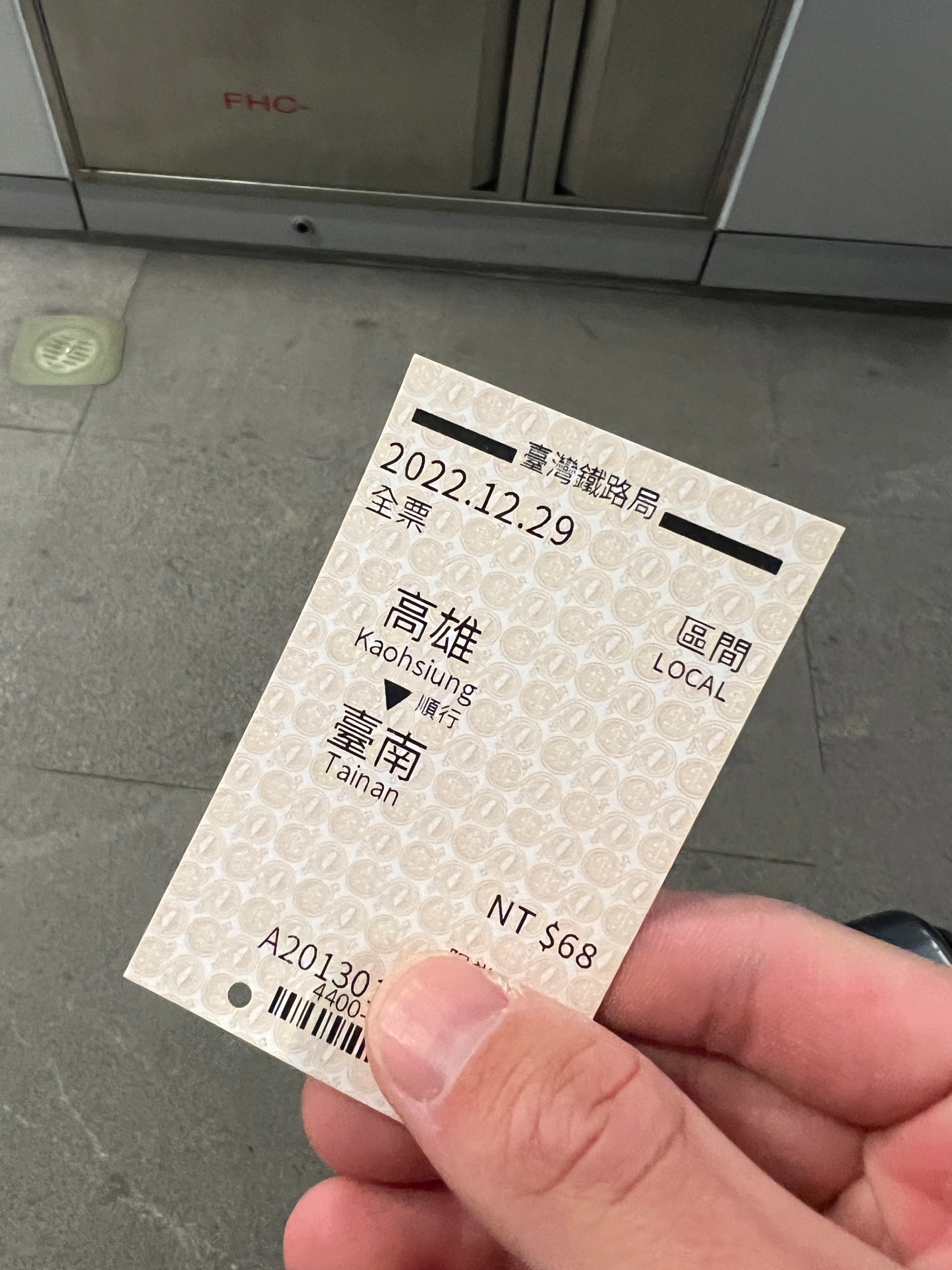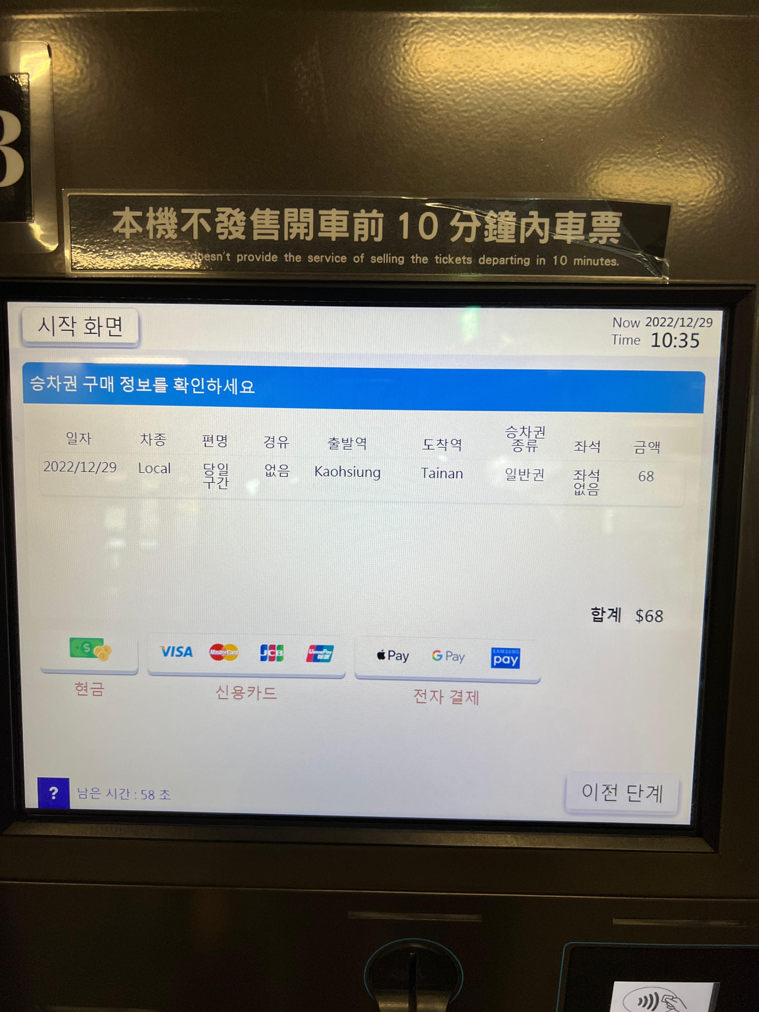 저기 보다시피 68TWD인데 이건 비지정 열차라서 그렇고 지정 열차는 좀 더 비싸다. 지정으로 타야 한다.