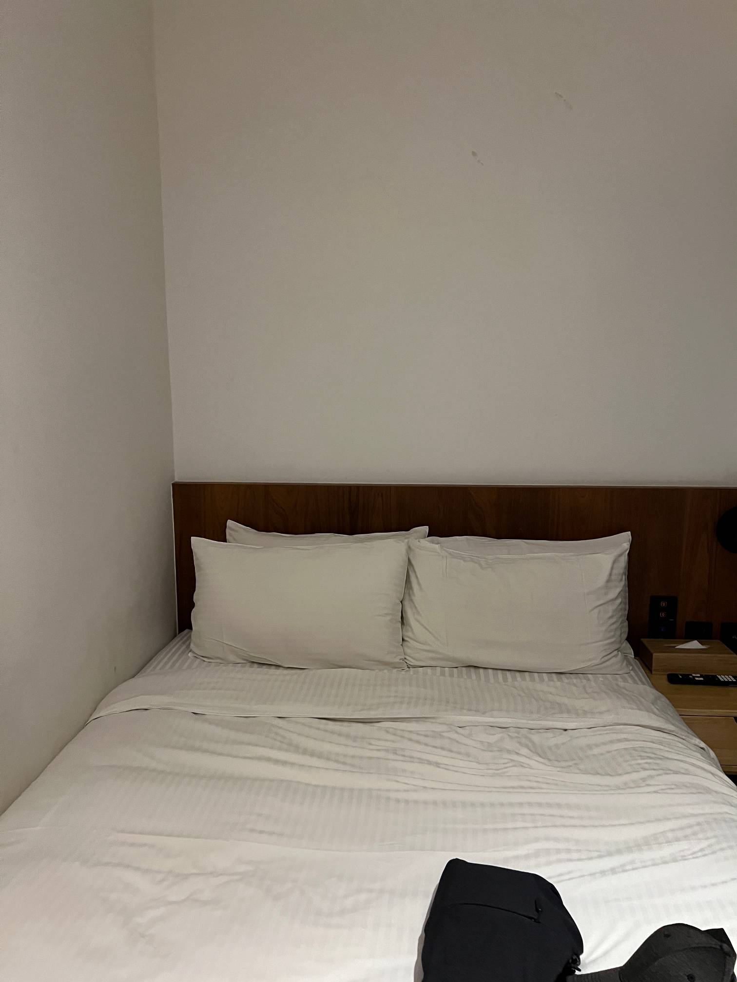 이 퀸사이즈 침대 하나에 바로 오른쪽에 화장실이 있고, 그 외에 여유 공간은 거의 없는 수준이었다.