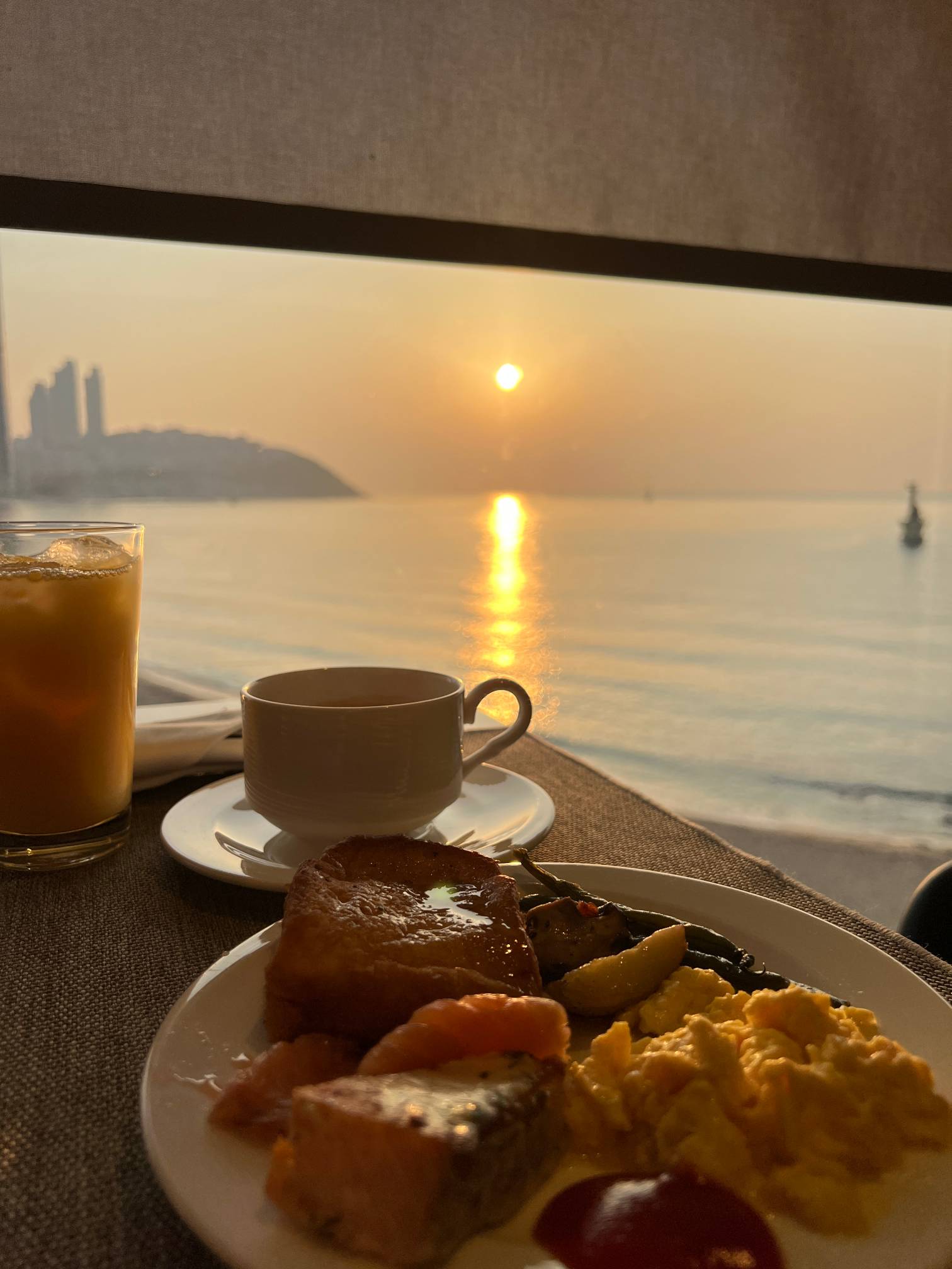 조식당에 가서 보이는 뷰인데 석양이 아니라 해가 뜨고 있는 중이다.