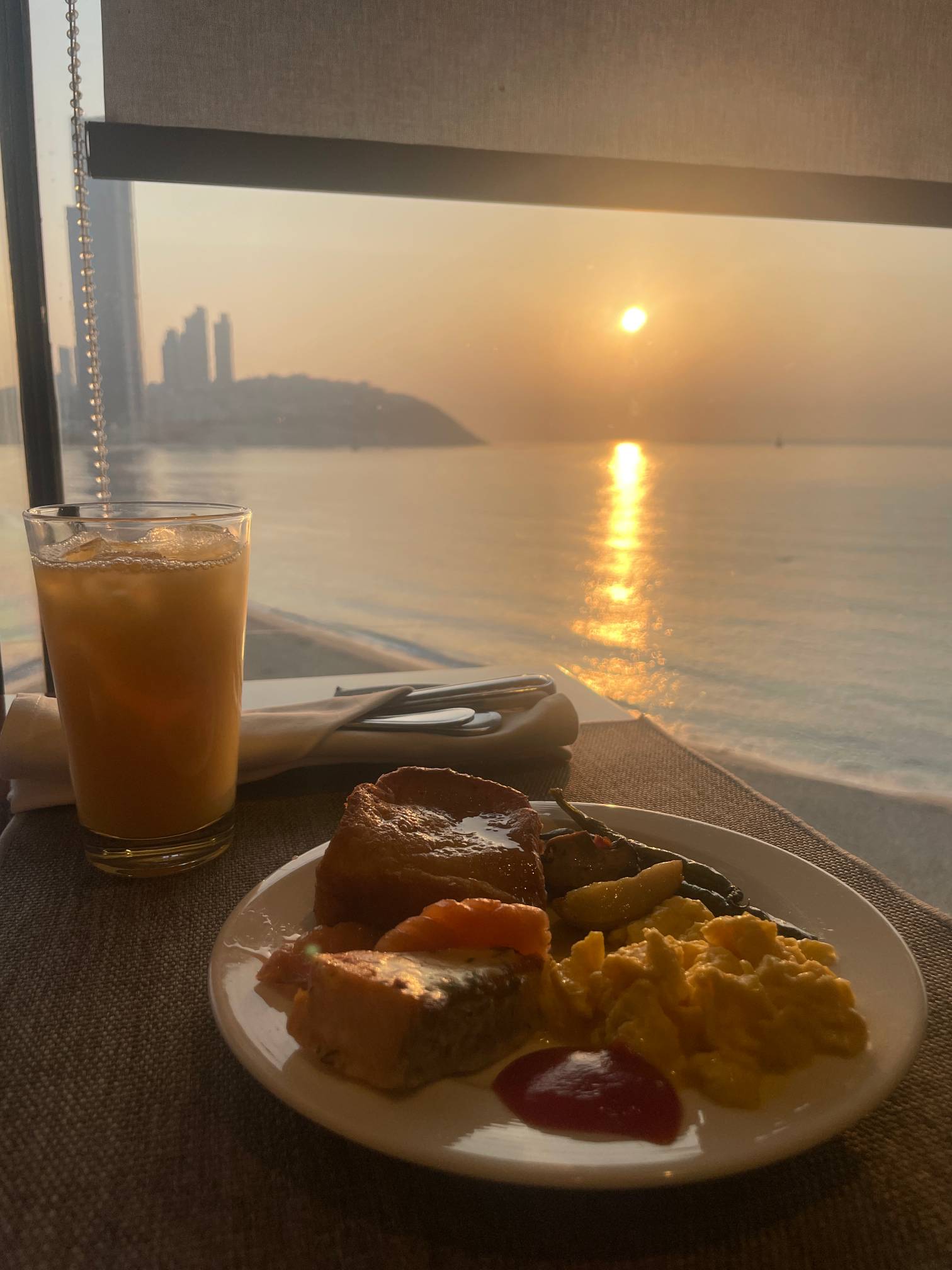 뭐 햇빛 때문에 어쩔 수 없는 거기는 한데, 차라리 전날 오후에 탁 트인 오션뷰 보기를 잘한 듯.