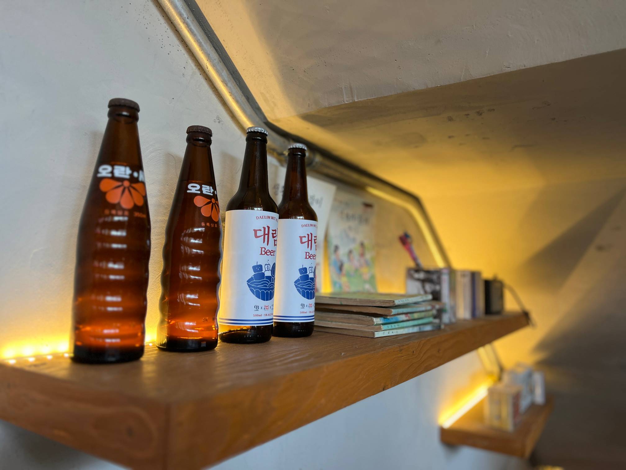 벽에 장식된 옛날 음료수랑 맥주병. 나름 레트로한 인테리어를 추구하는 곳인 것 같다.