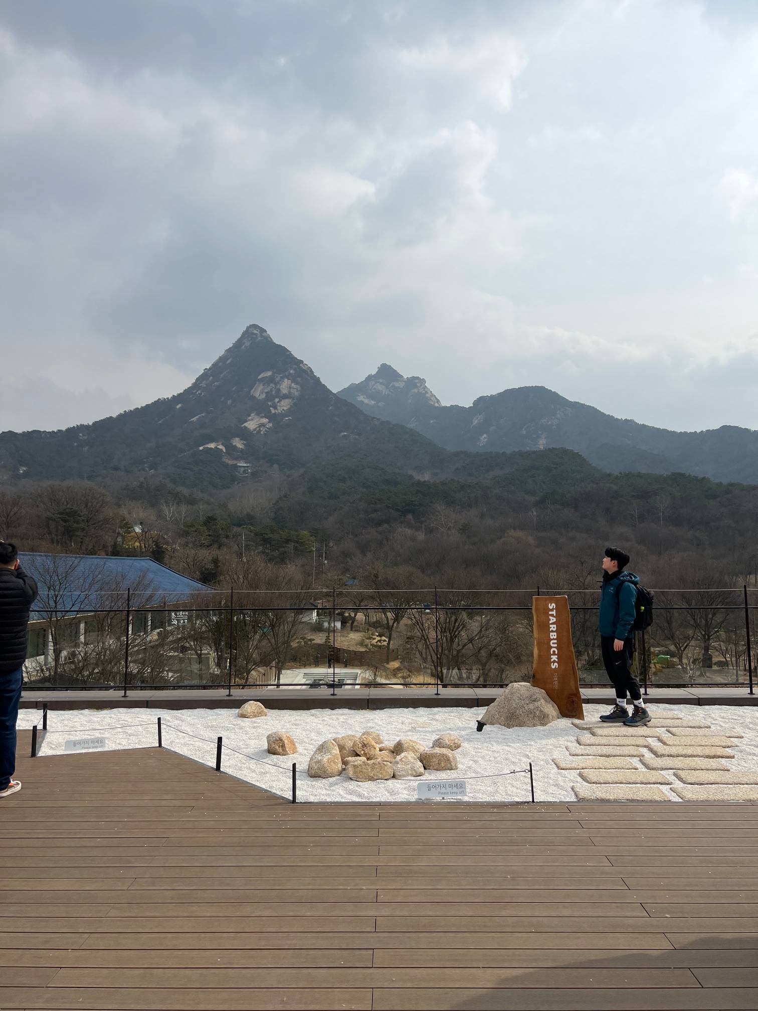 저기 무슨 산 정상에 올라온 것처럼 스타벅스 이름이 새겨진 팻말 같은 게 있다.