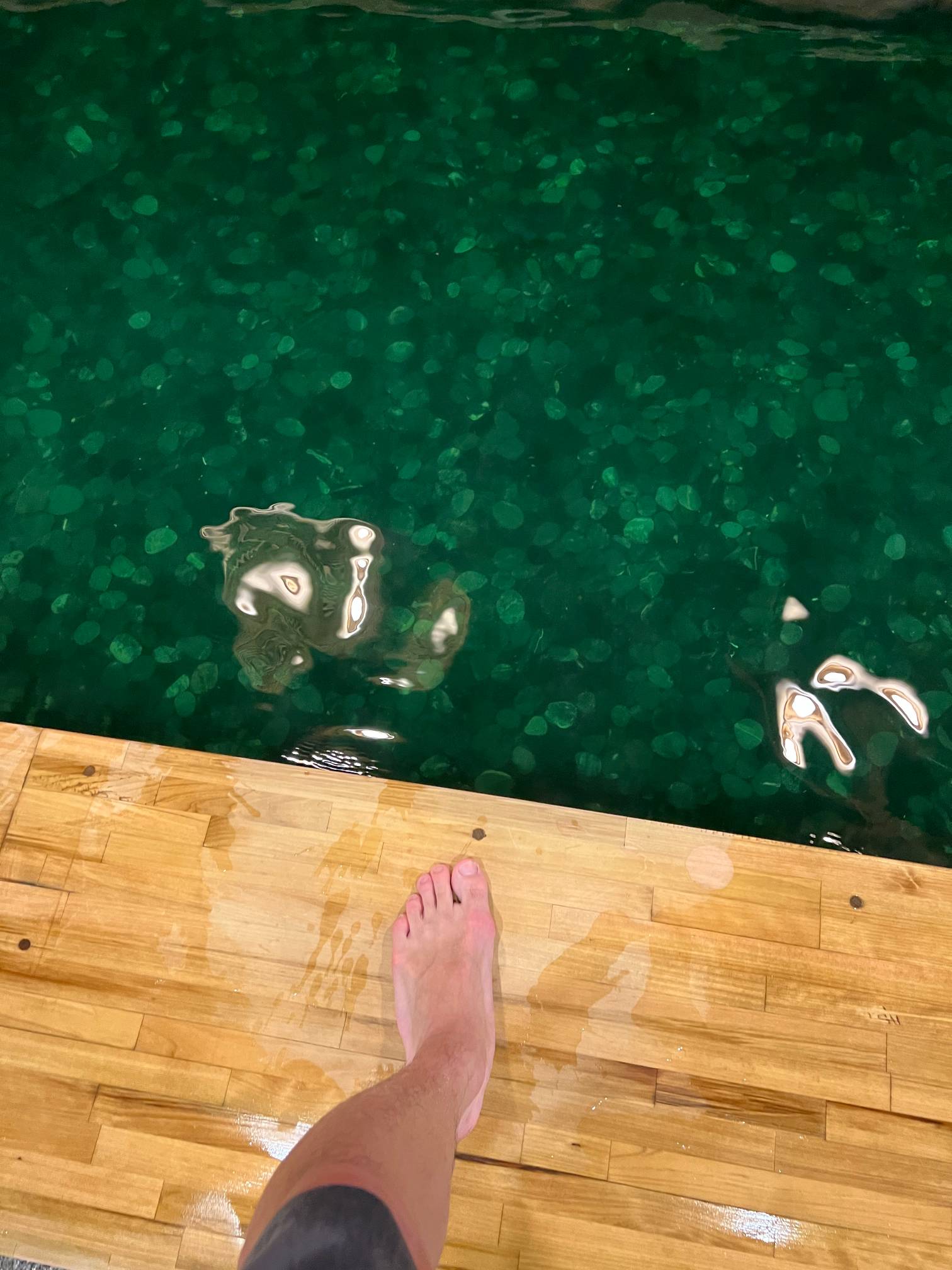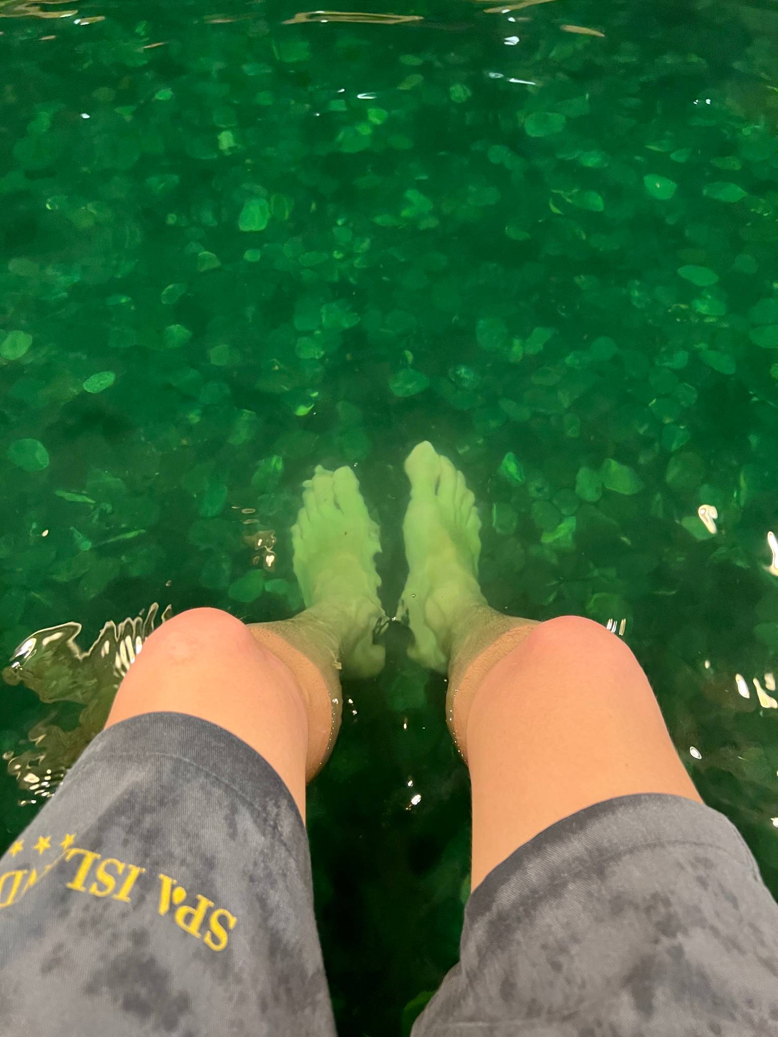 족욕하는 곳 물에는 뭔가를 탔는지 초록빛을 띄고 있다.
