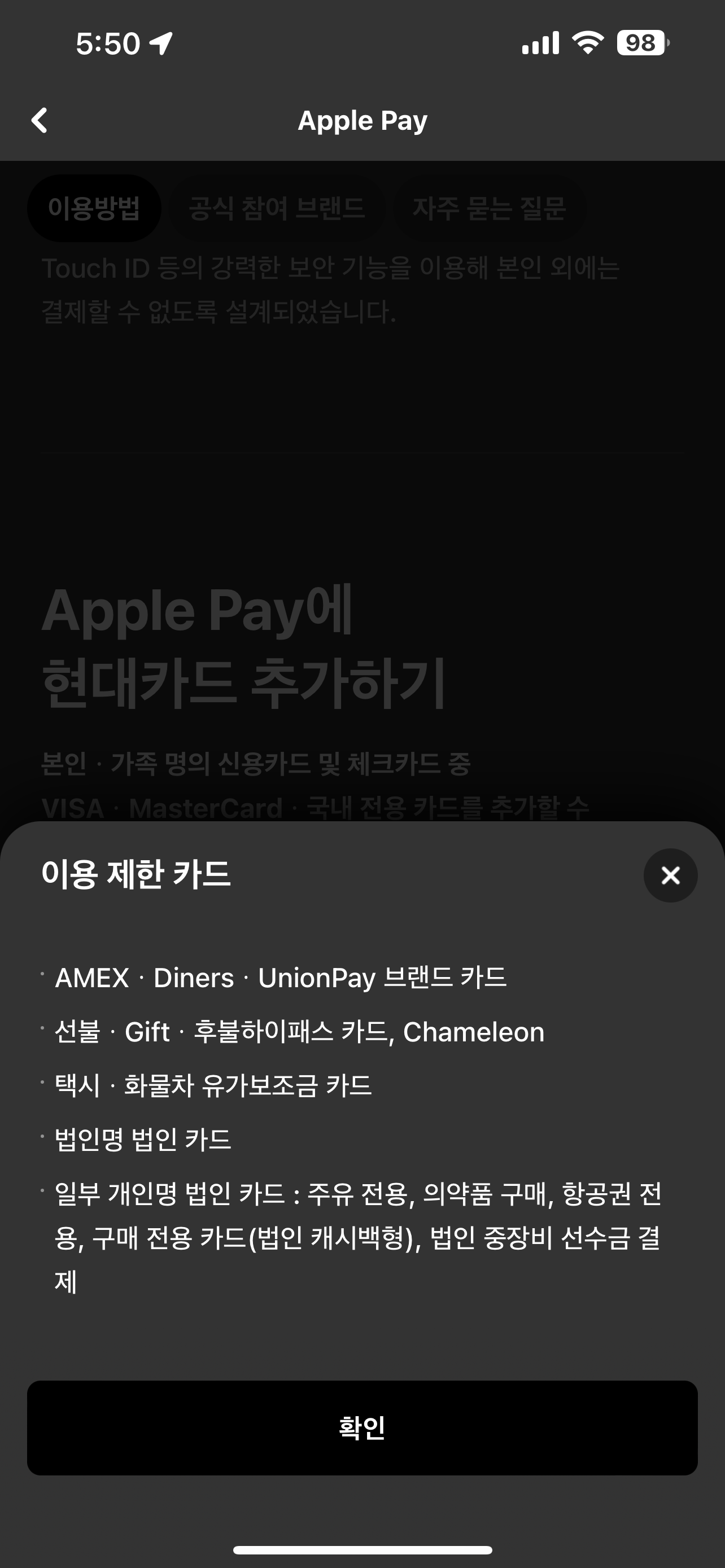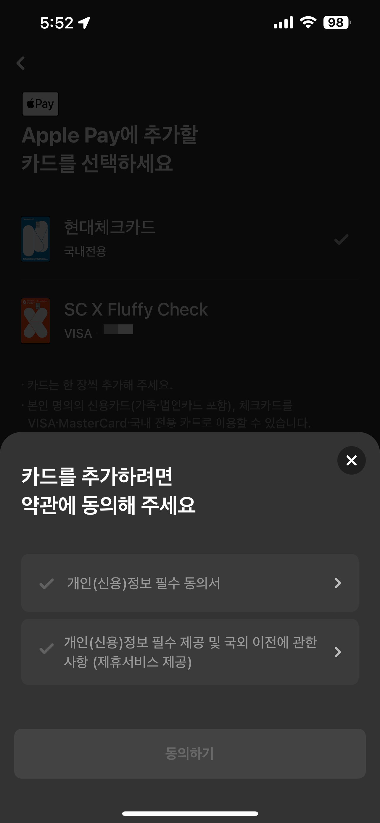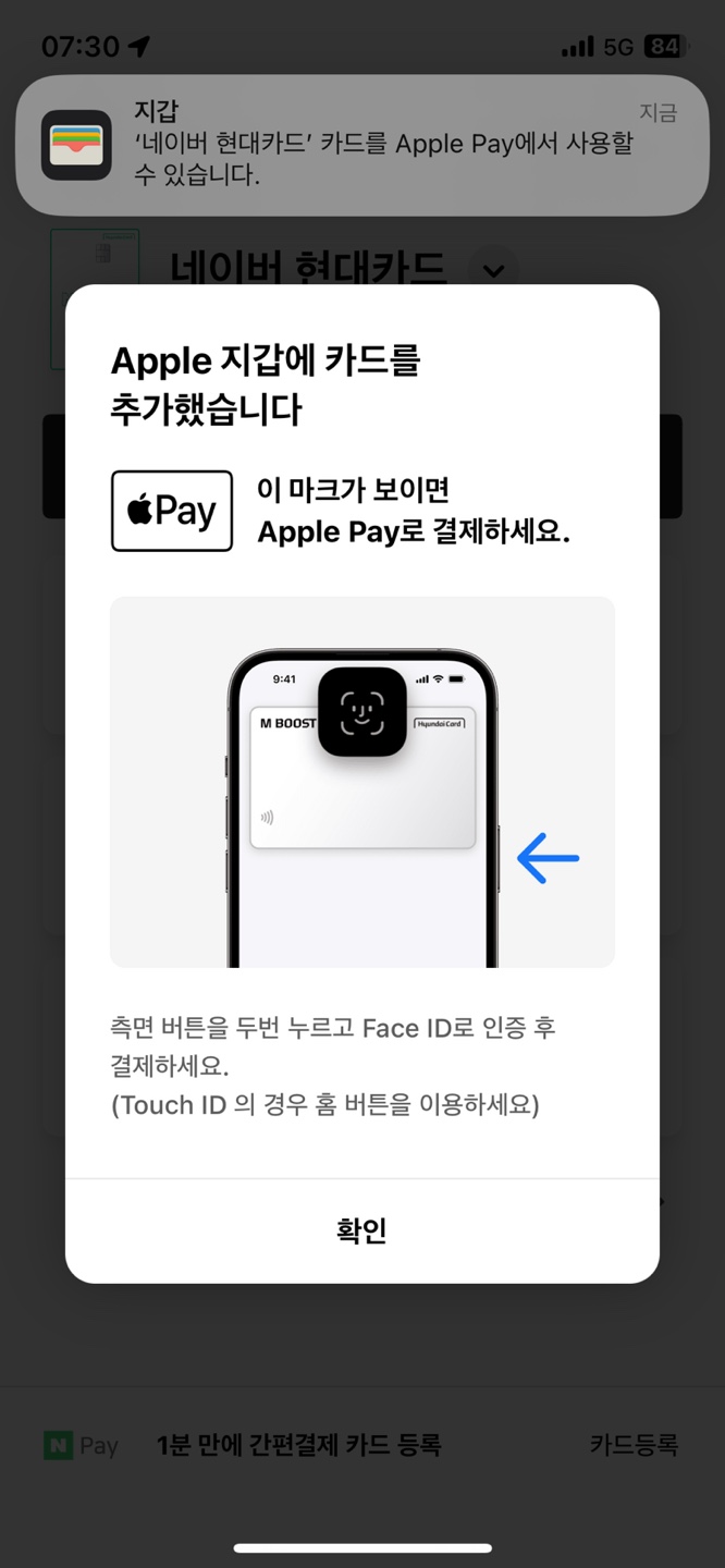 새벽에 문득 잠이 깨서 현대카드 앱을 열어보니 애플페이를 등록할 수 있는 메뉴가 생겼다.