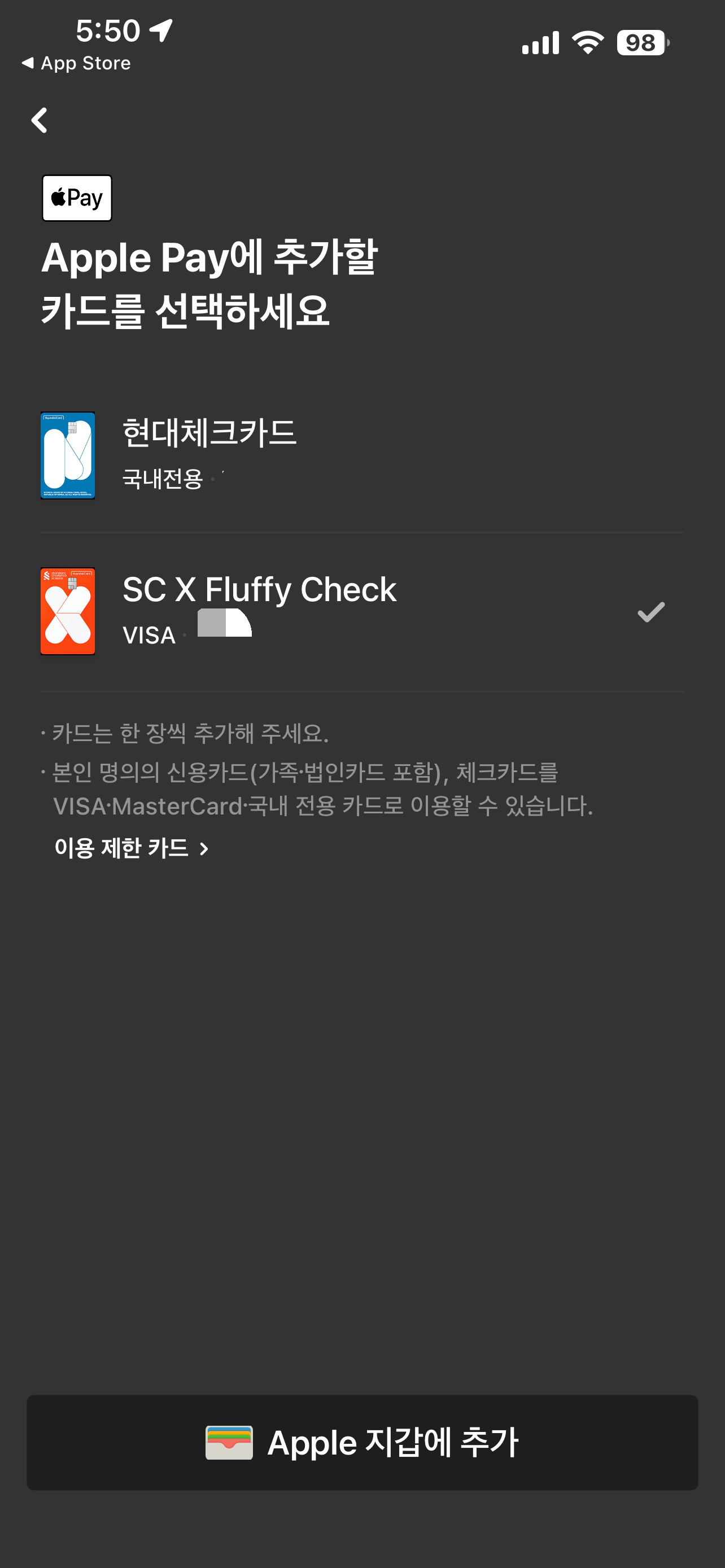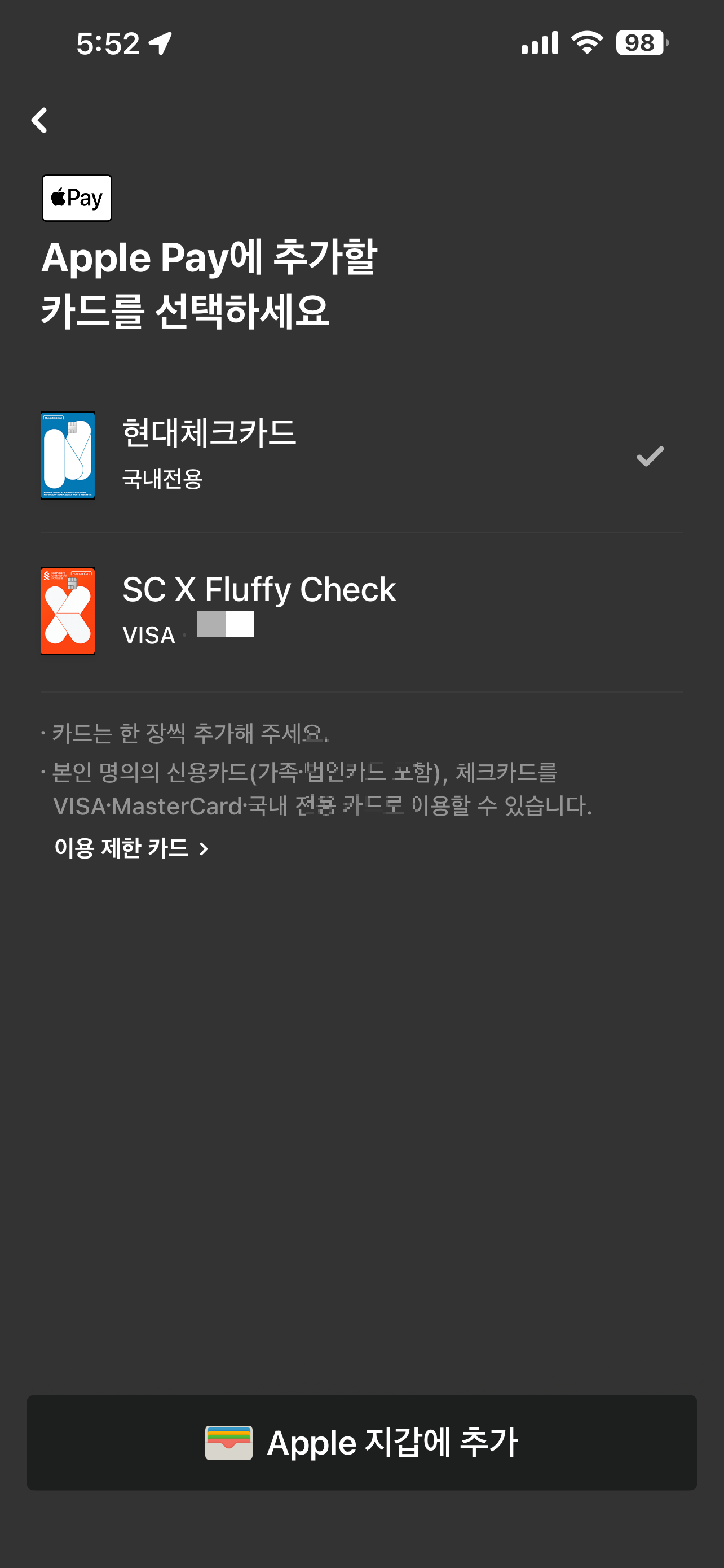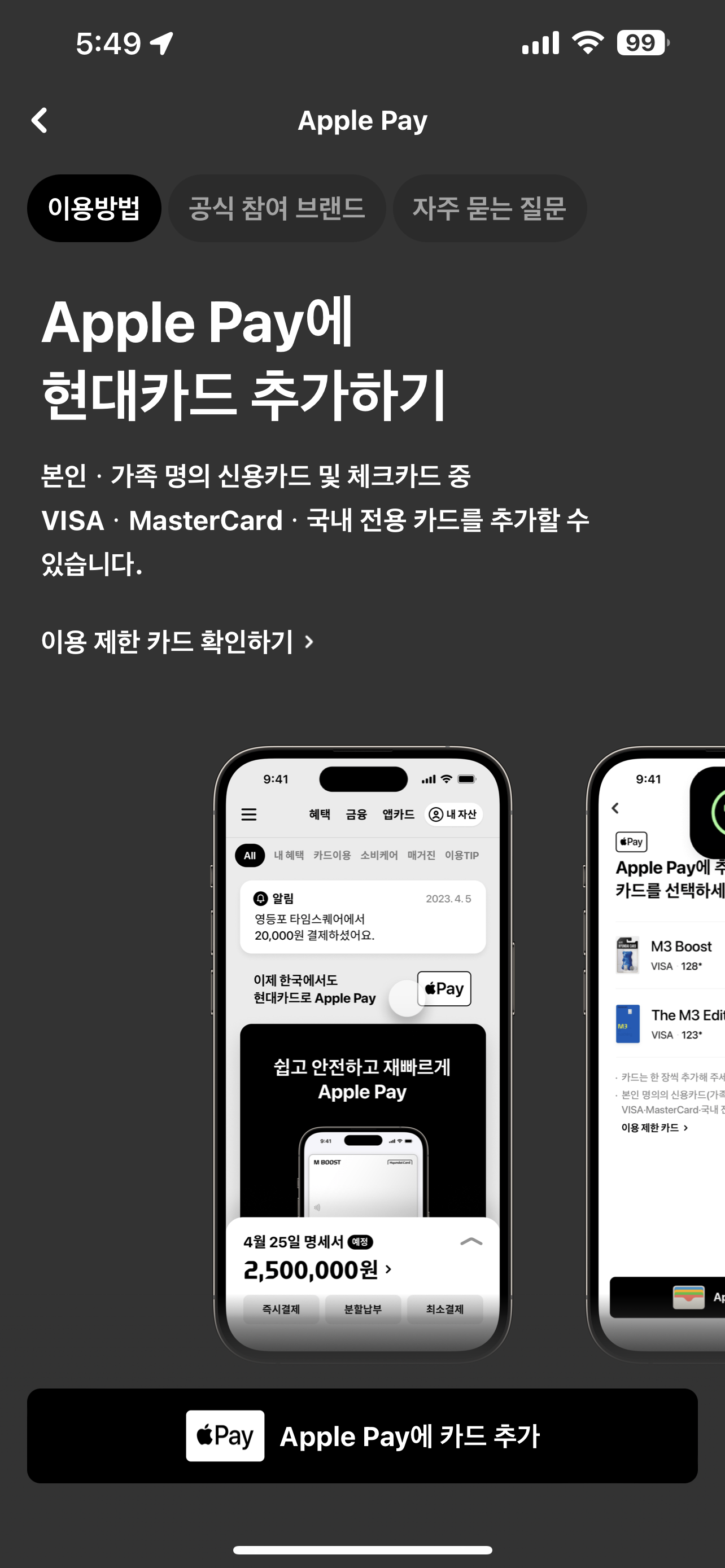 이용 방법이 나오는데 하단에 있는 '애플페이에 카드 추가' 버튼을 누르면