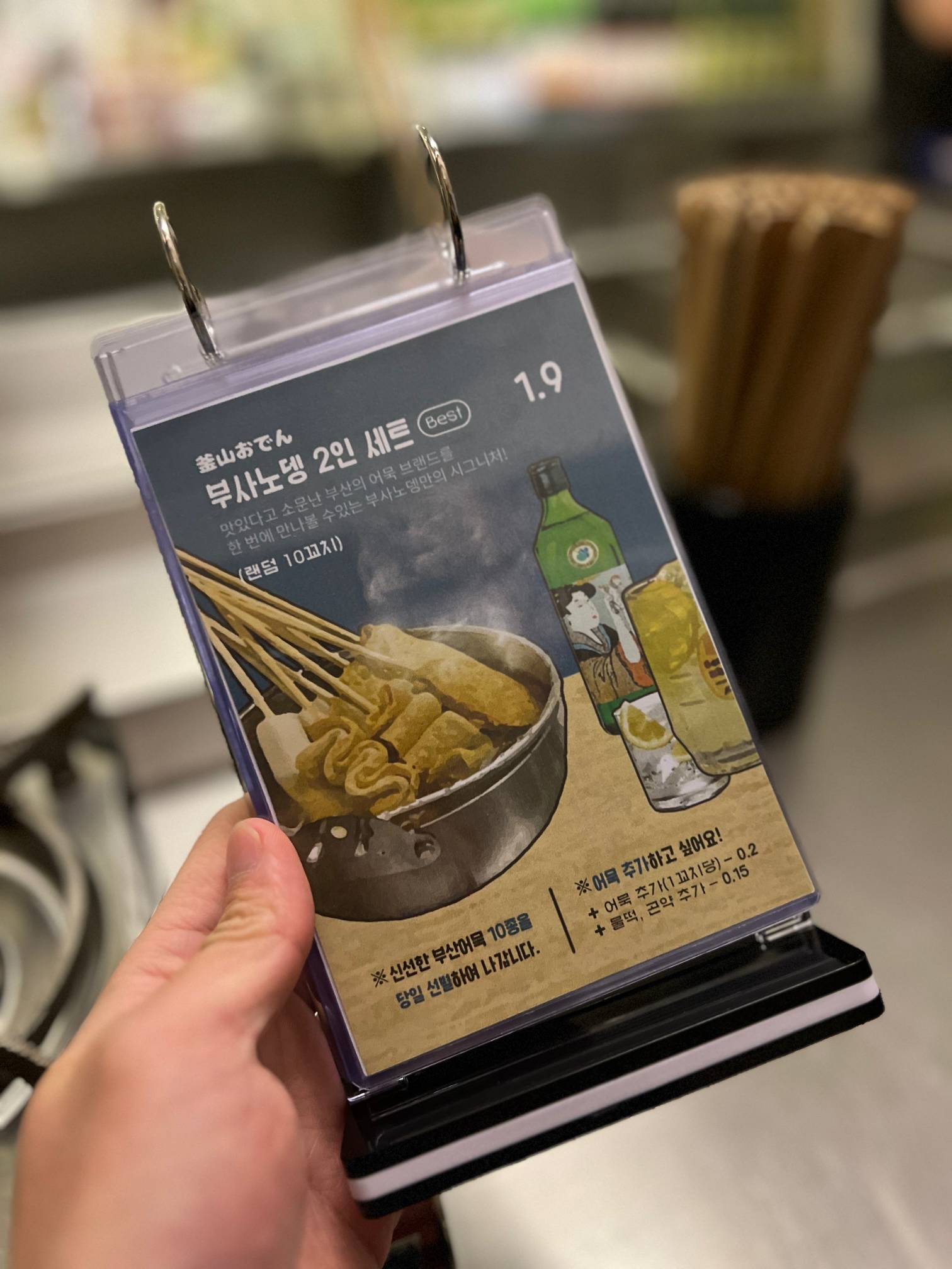 이게 모듬오뎅 메뉴. 2인 세트가 19,000원이니 가성비는 괜찮은 편이다. 뭐 요새 어디 포장마차에서 어묵 하나 먹어도 하나에 700원에서 1000원 정도 하니까 ...