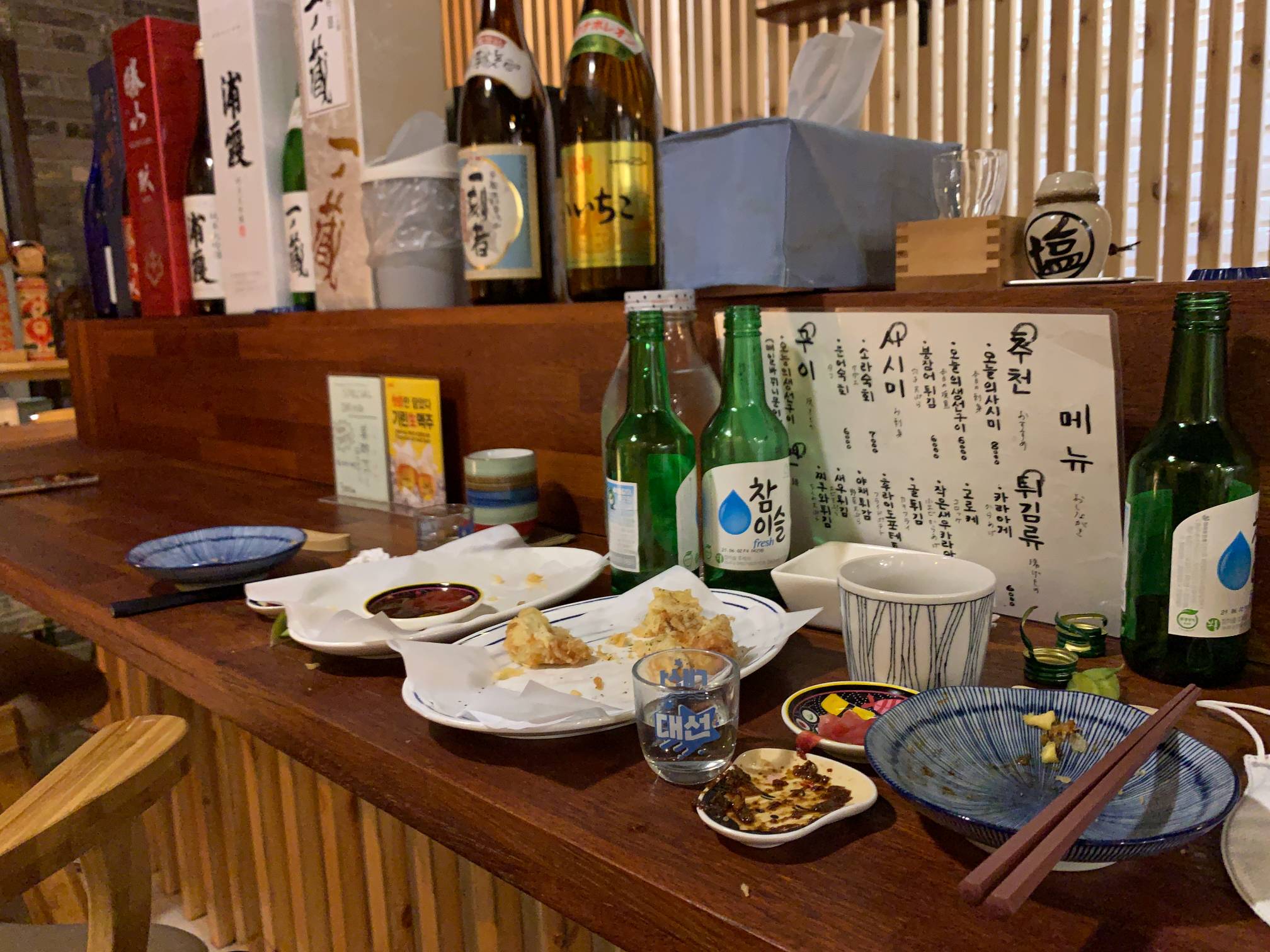 사케를 시켜 먹어도 되는데 그냥 이날은 소주가 땡겨서 소주로.