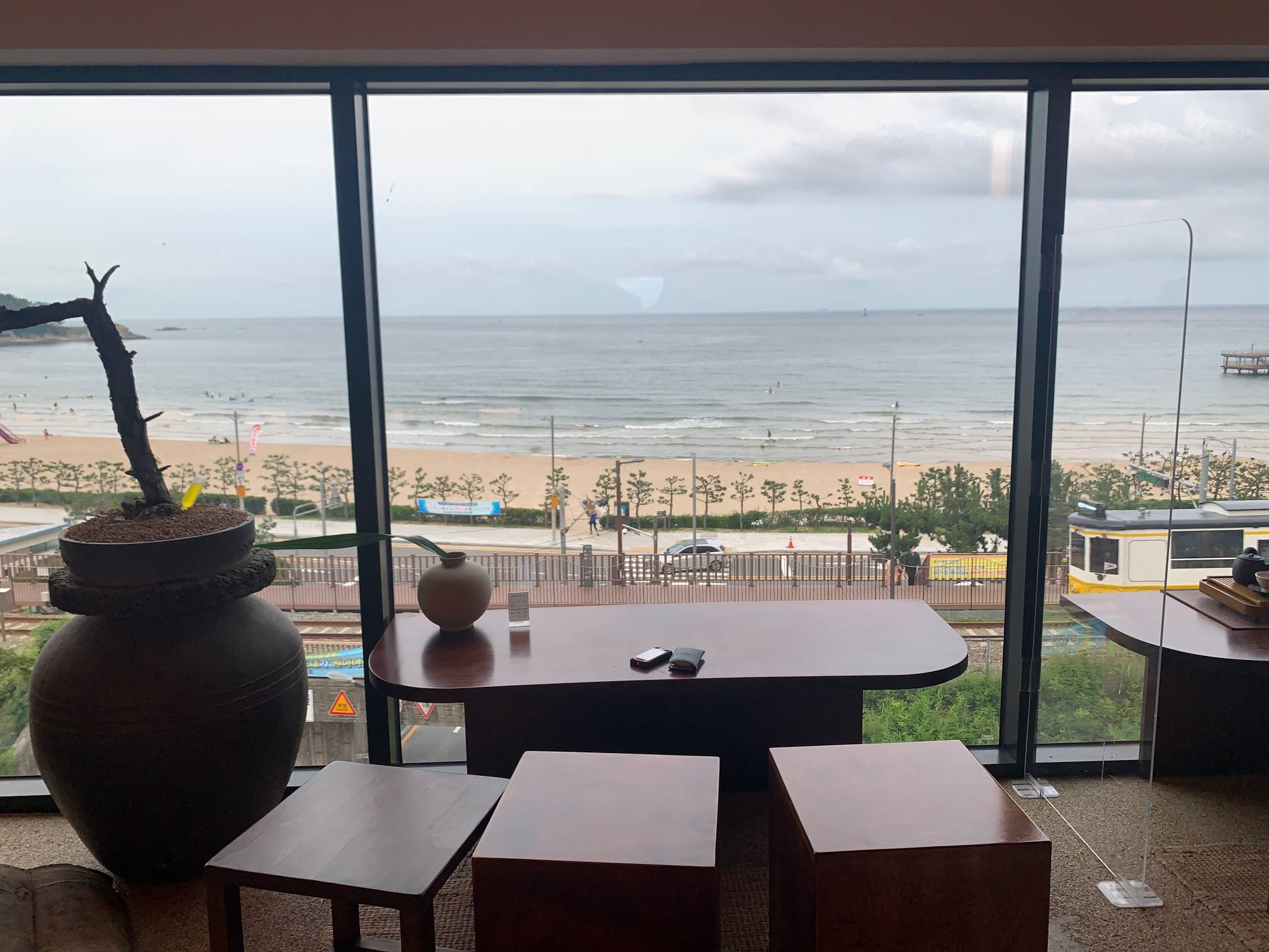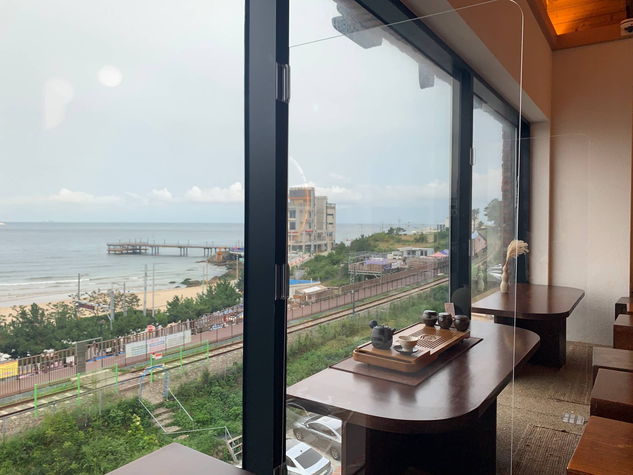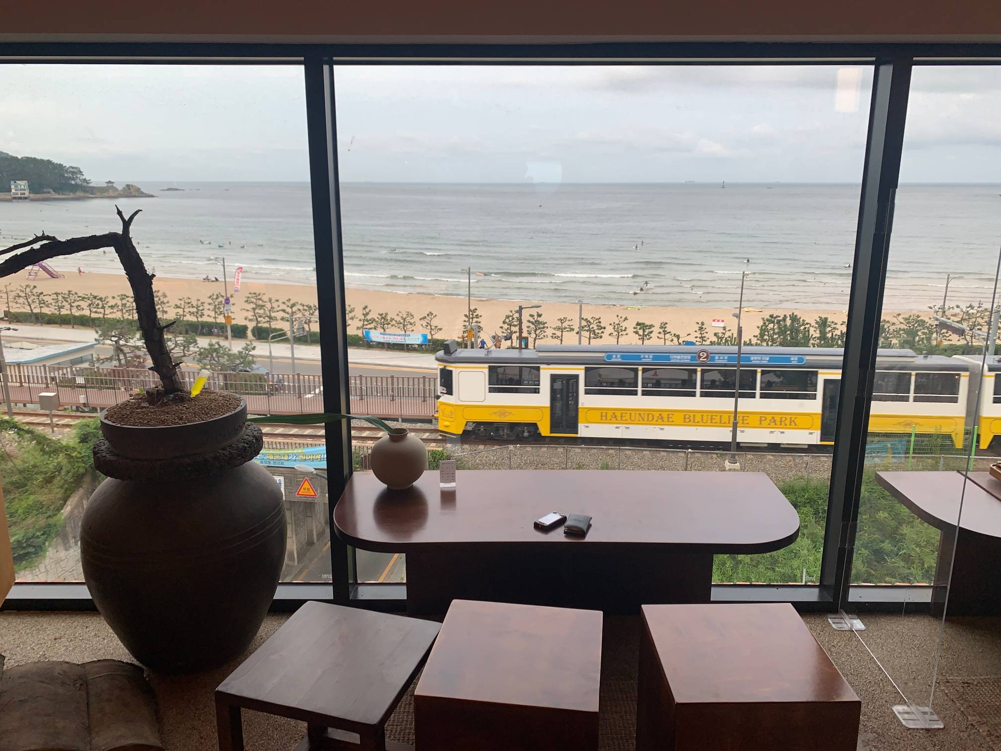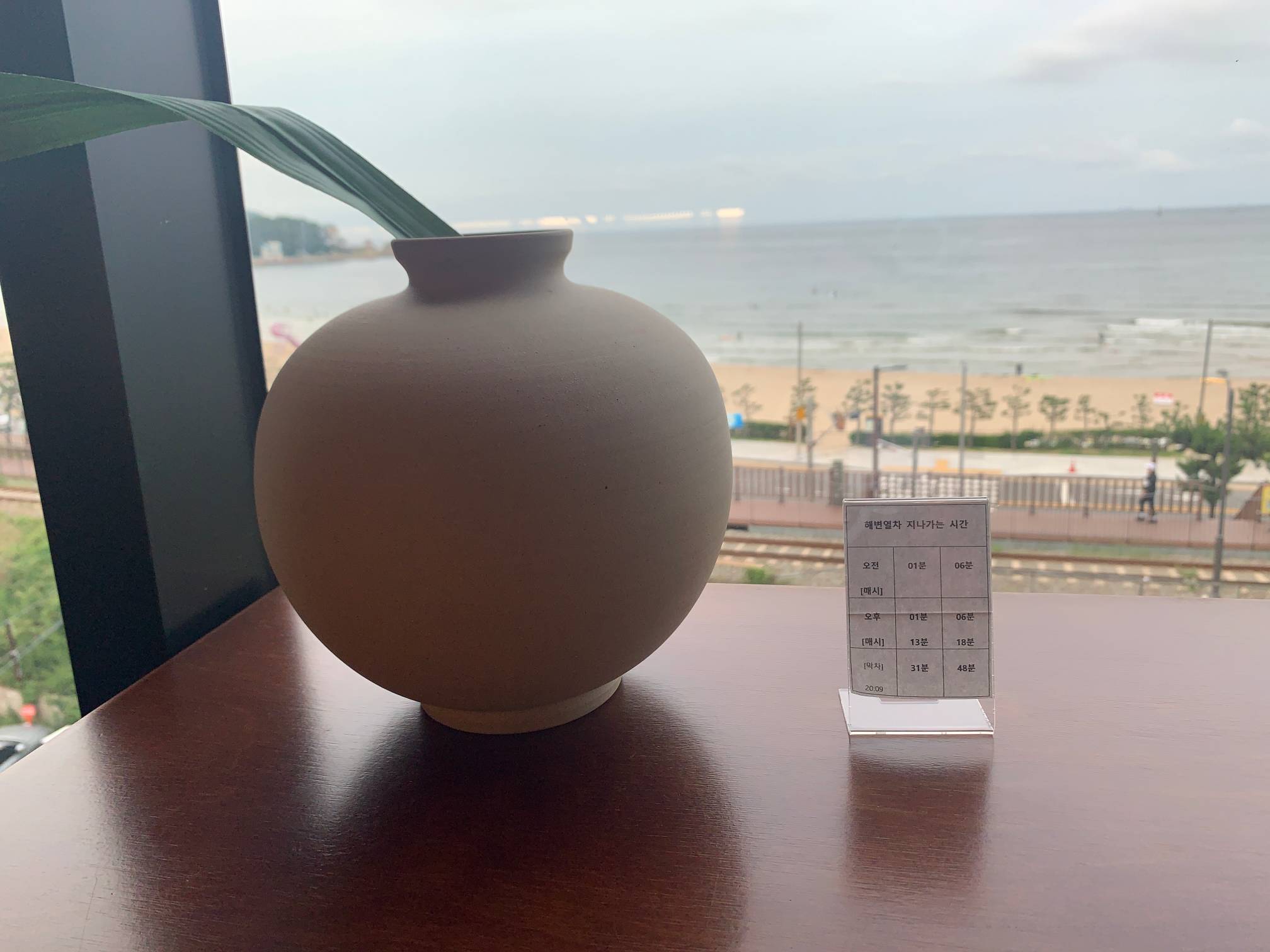 송정 해수욕장을 바로 바라보는 위치이기 때문에 오션뷰가 굉장히 좋고 특히 바로 앞으로 해운대 해변 열차가 지나가기 때문에 해변 열차가 지나갈 때 사진 찍기도 굉장히 좋은 곳이다.