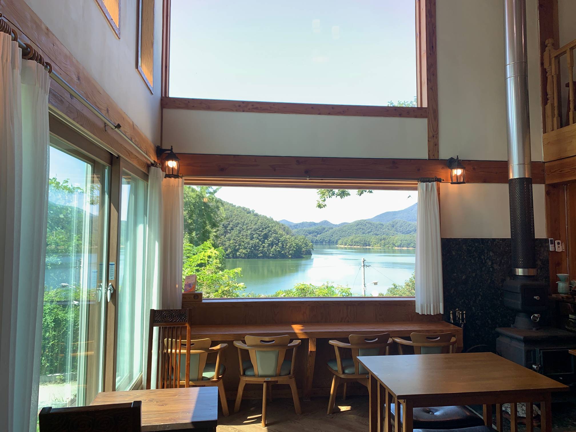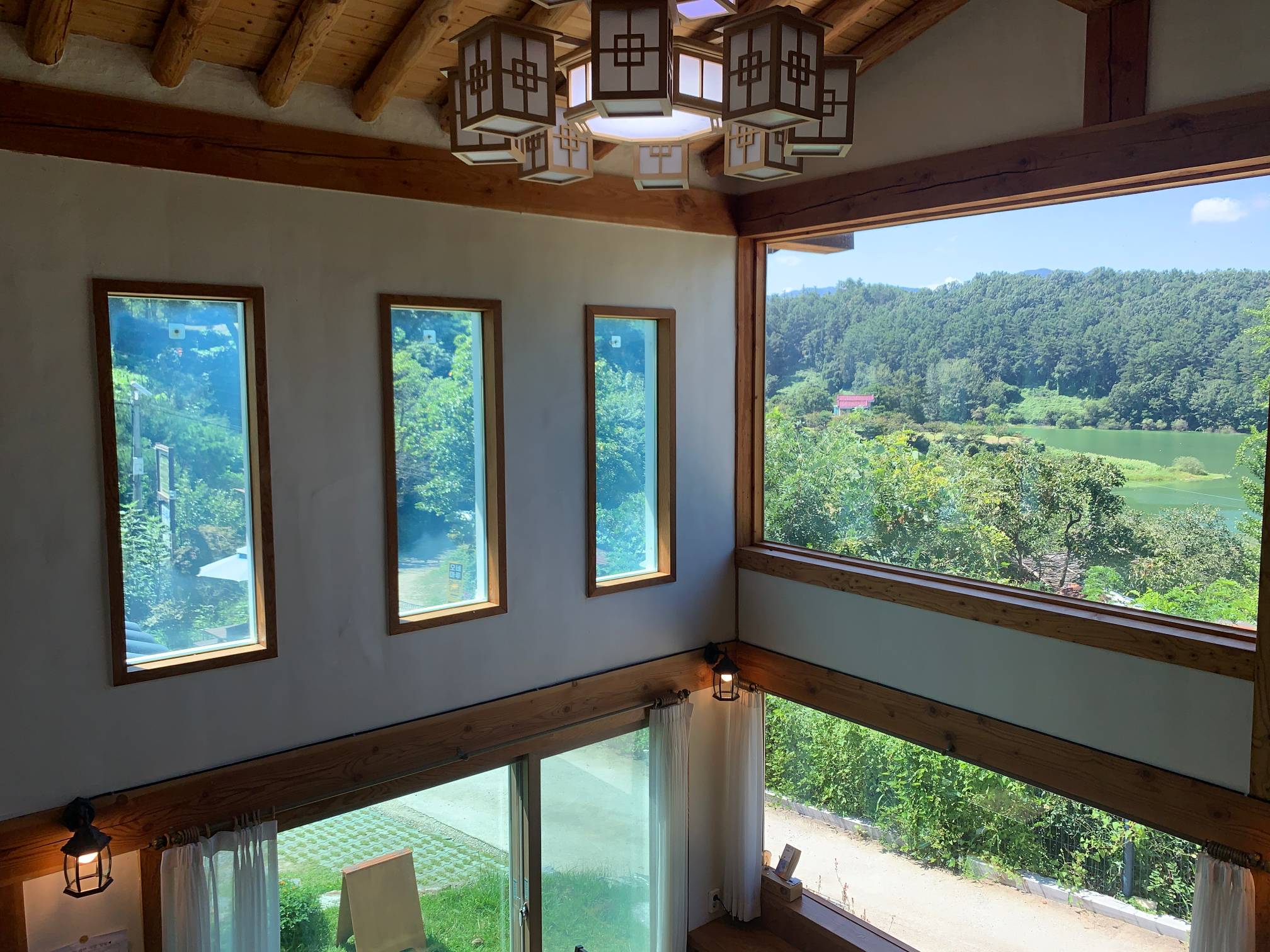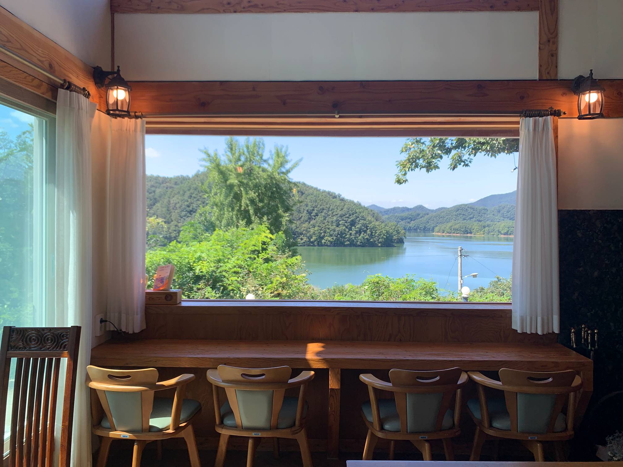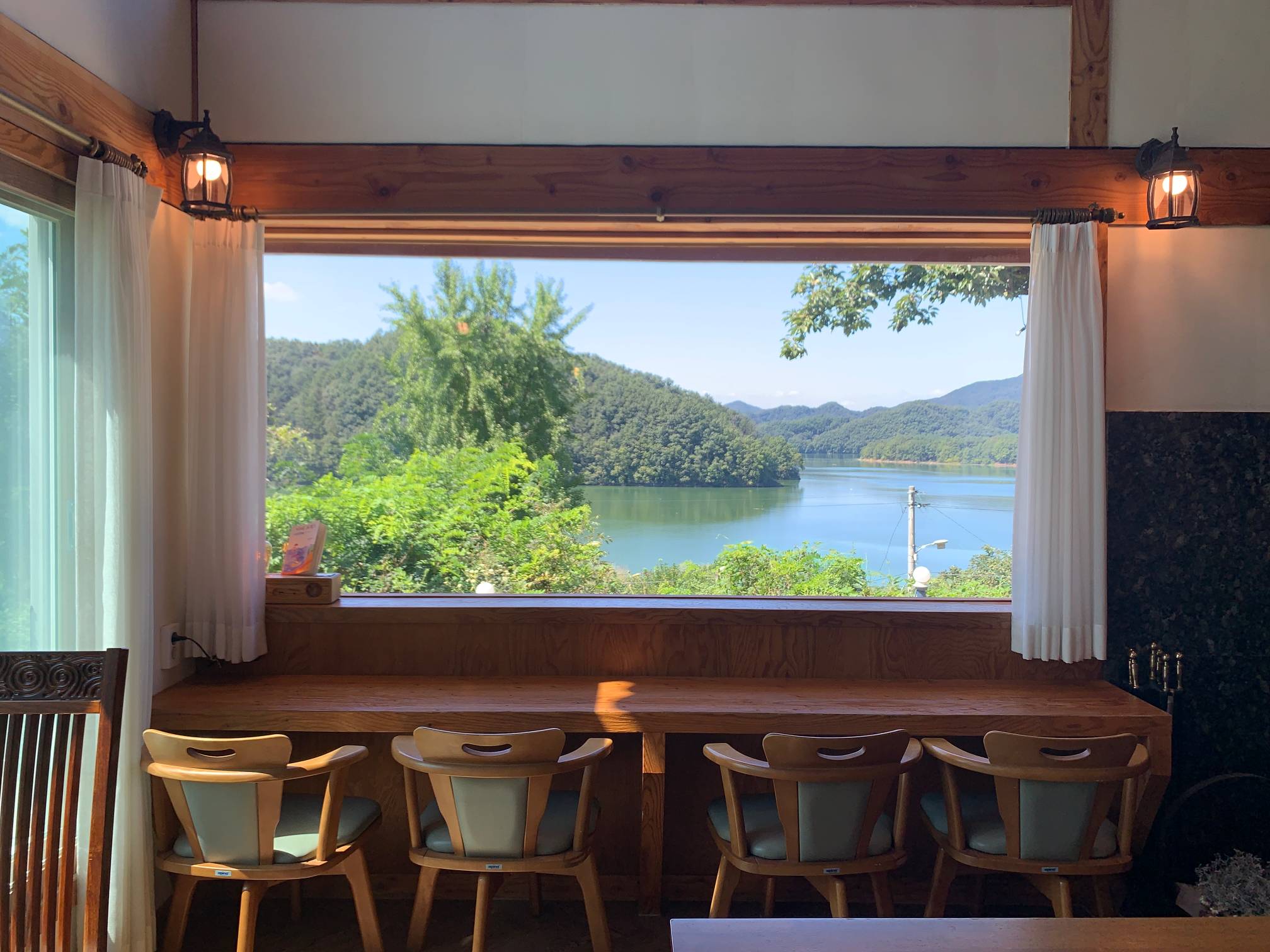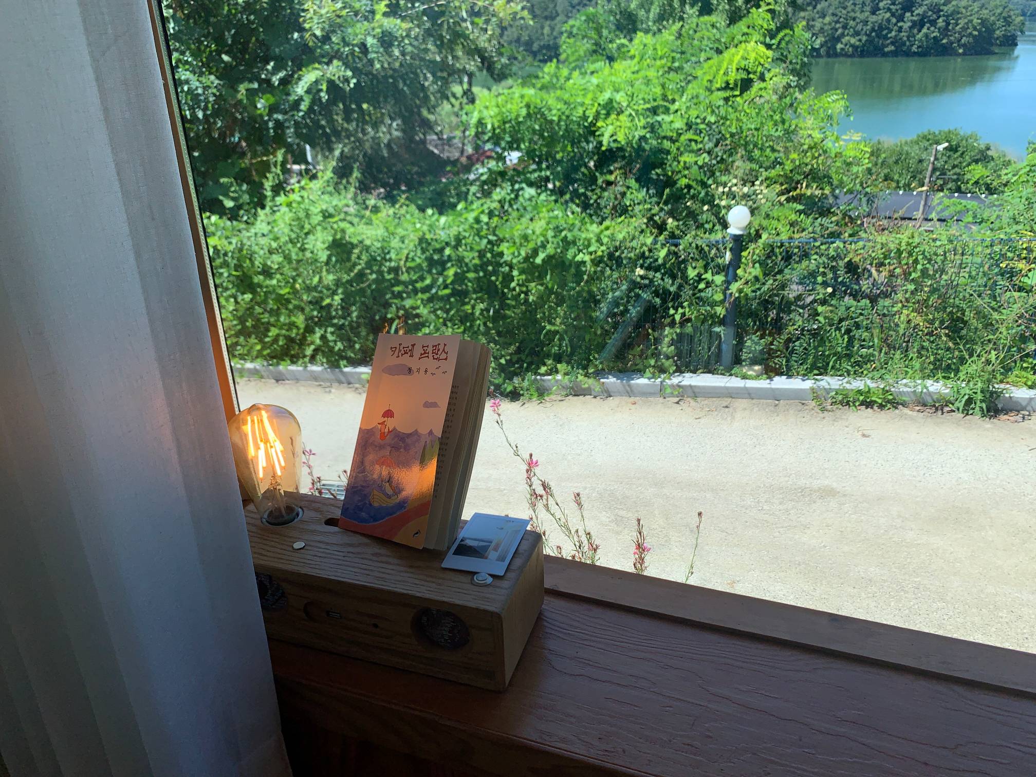 이 네모난 창문 프레임으로 보이는 바깥 호수 풍경이 정말 이쁘다