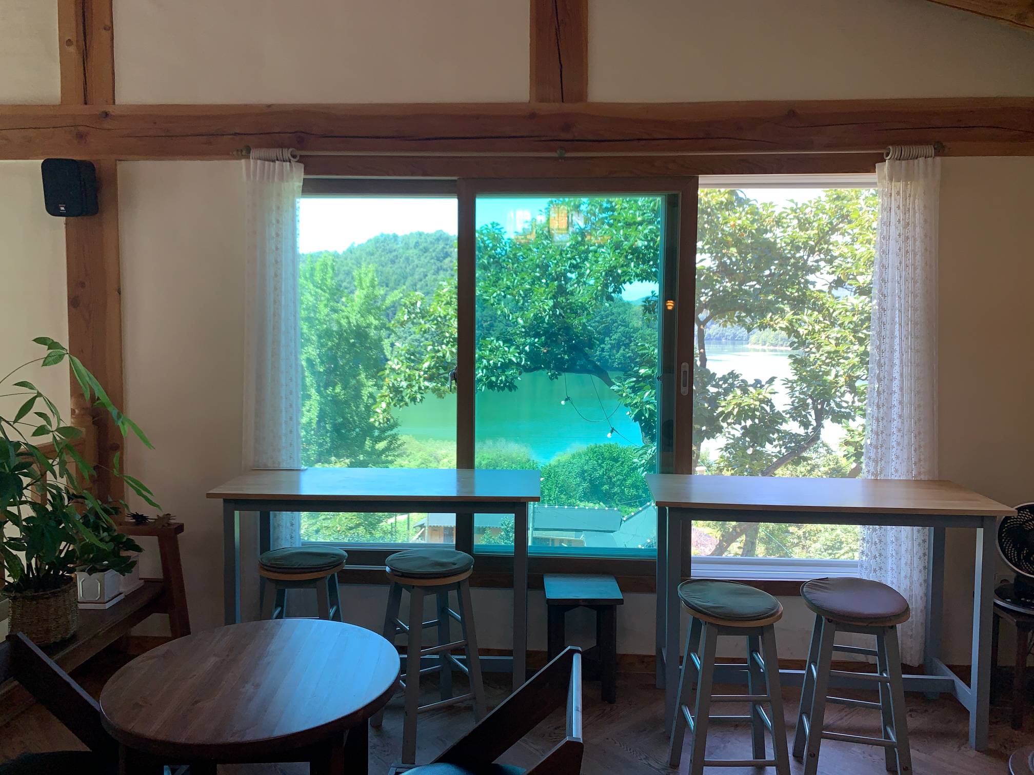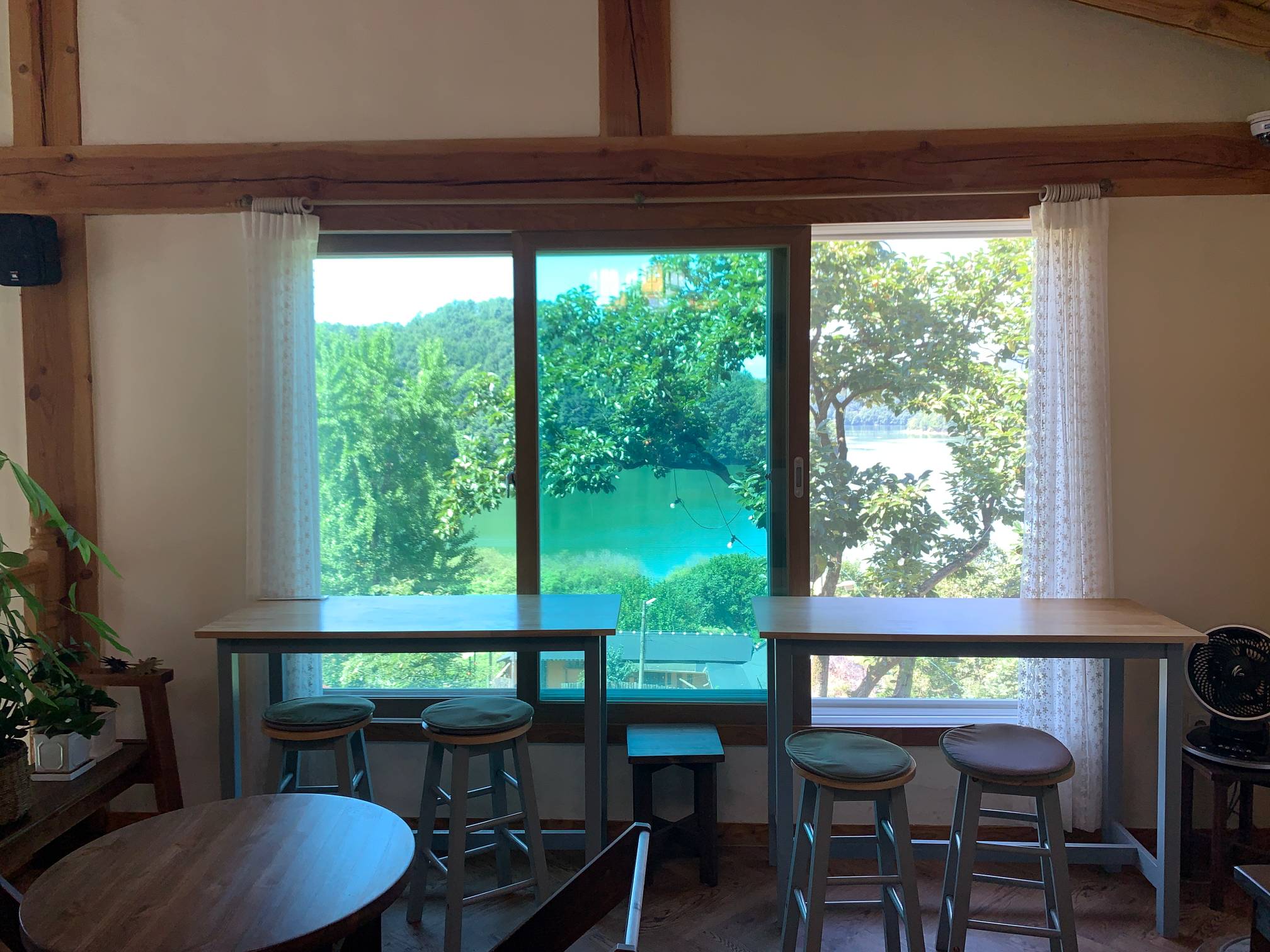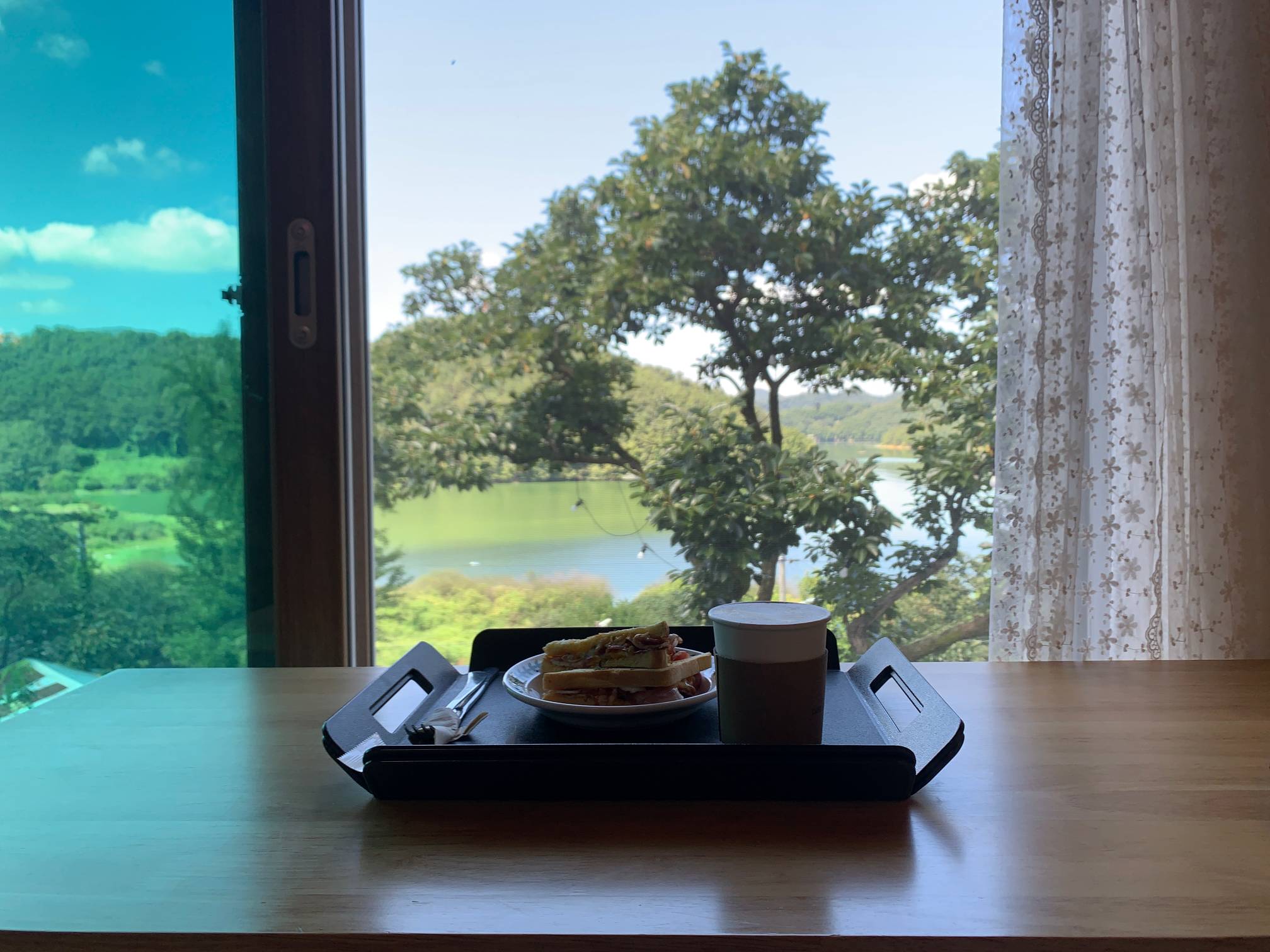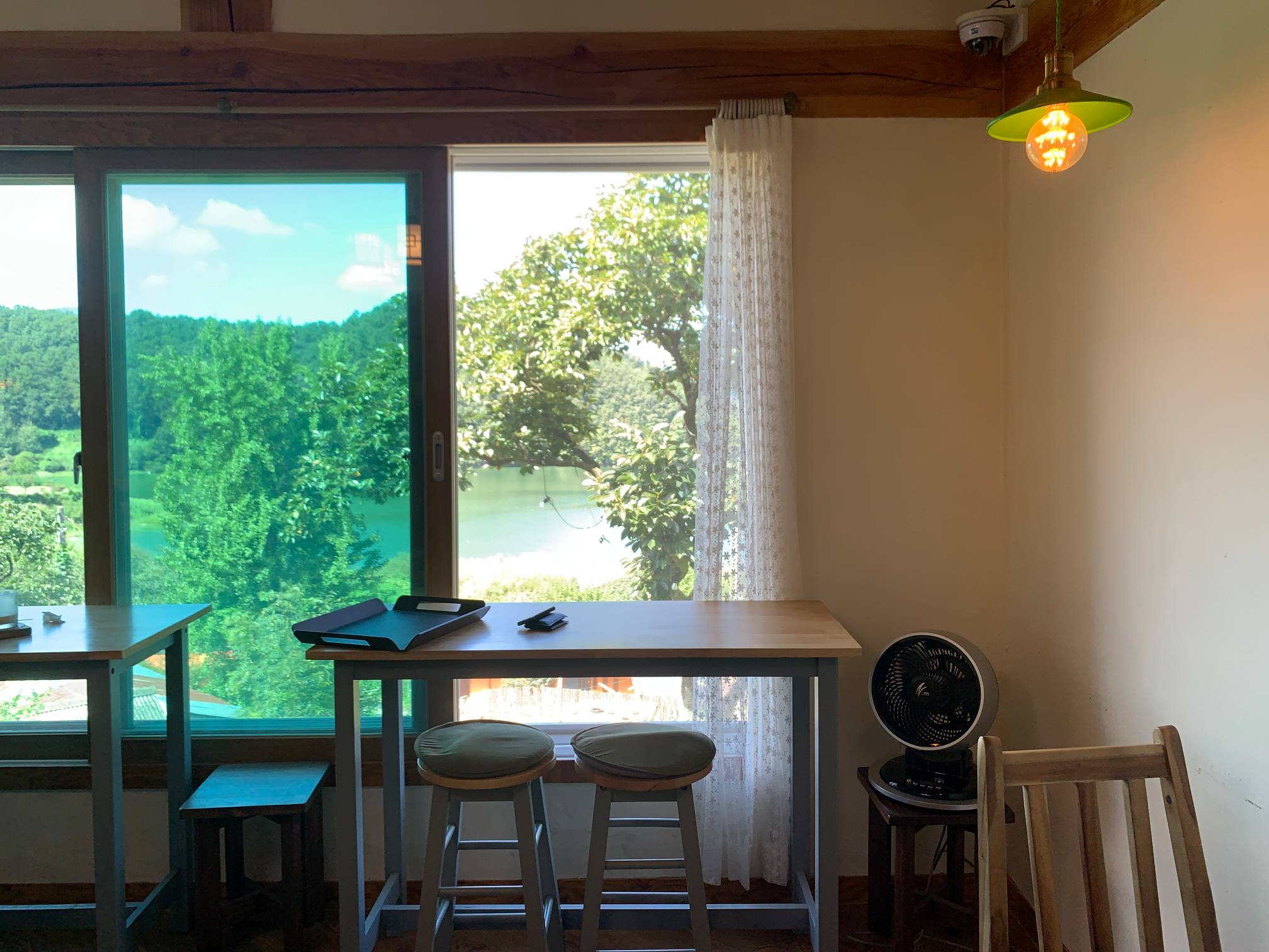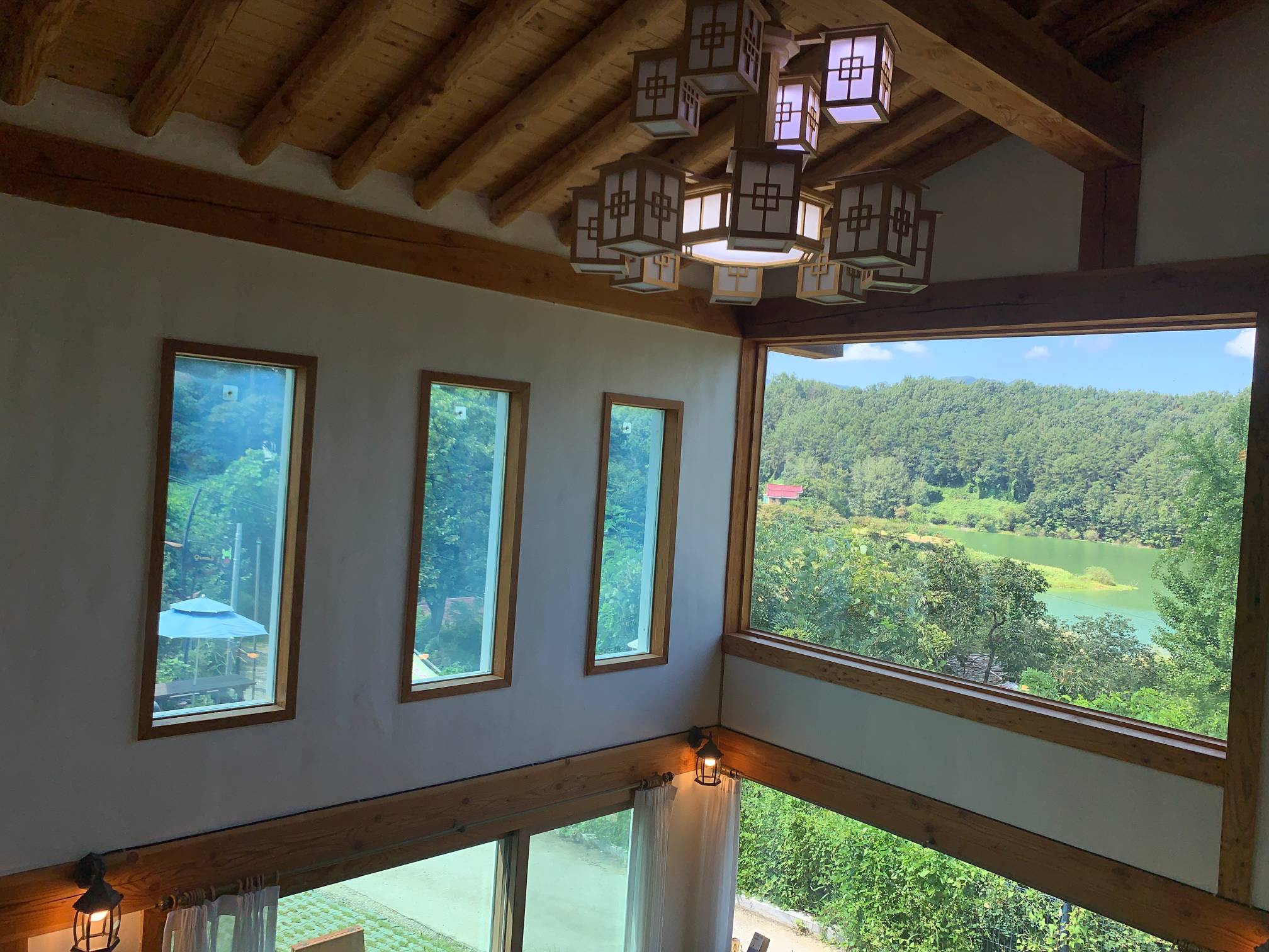 이 네모난 창문 프레임으로 보이는 바깥 호수 풍경이 정말 이쁘다