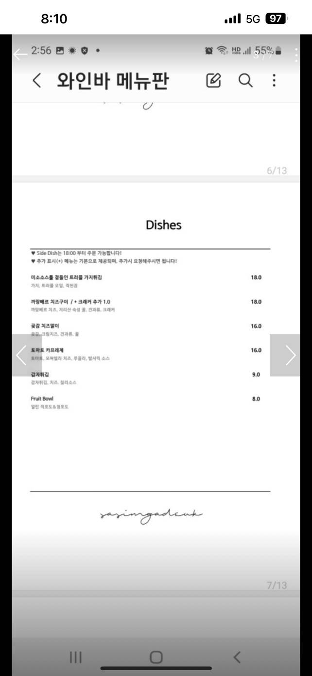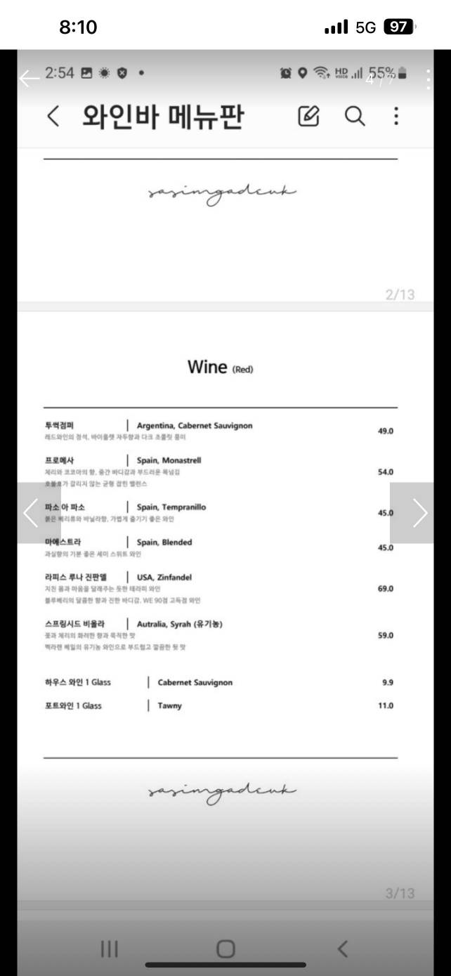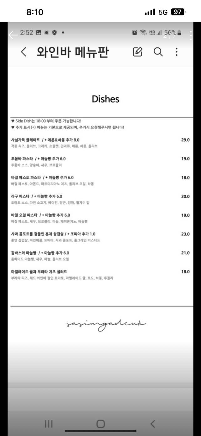 와인 안주로 플레이트와 파스타 피자 같은 것들이 있는데 개인적으로는 그냥 간단한 안주를 시켜서 한 바틀 시켜서 와인 한병 마시는 게 괜찮은 것 같다.
