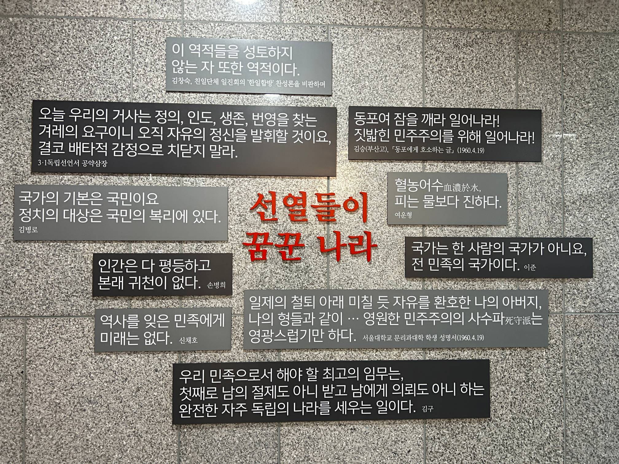 민주화를 위해 희생한 분들의 명언 같은 것들이 벽에 기재되어 있다.