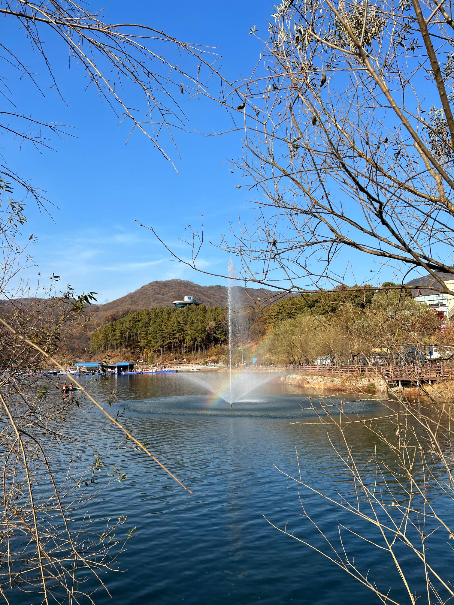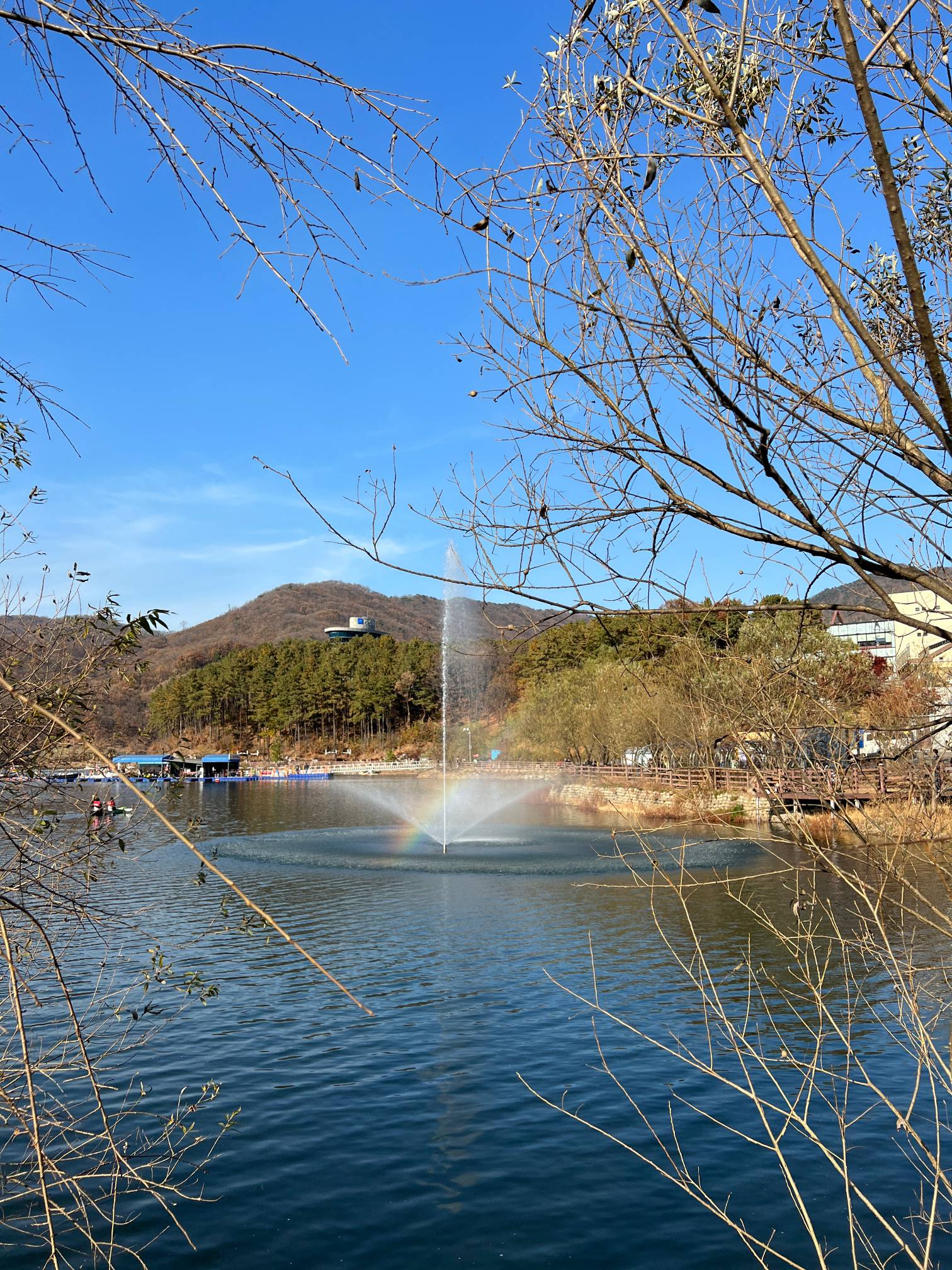 건너편에서 보니 분수에 무지개가 생겼다.