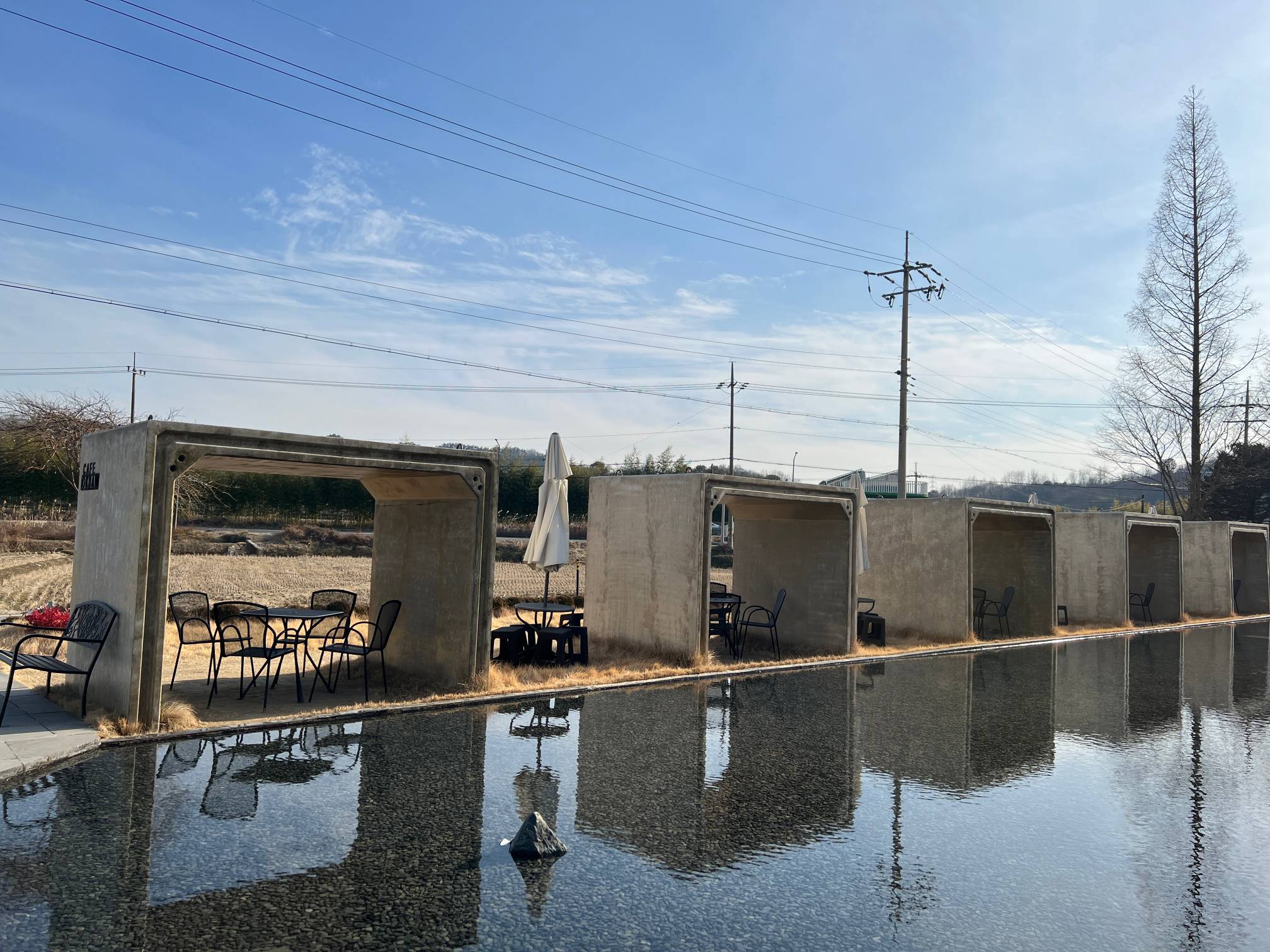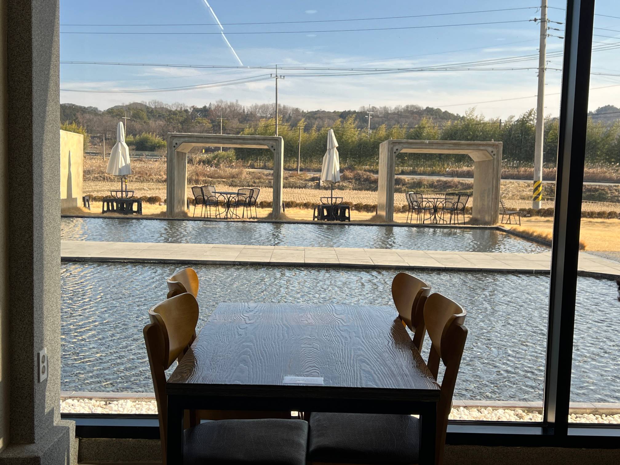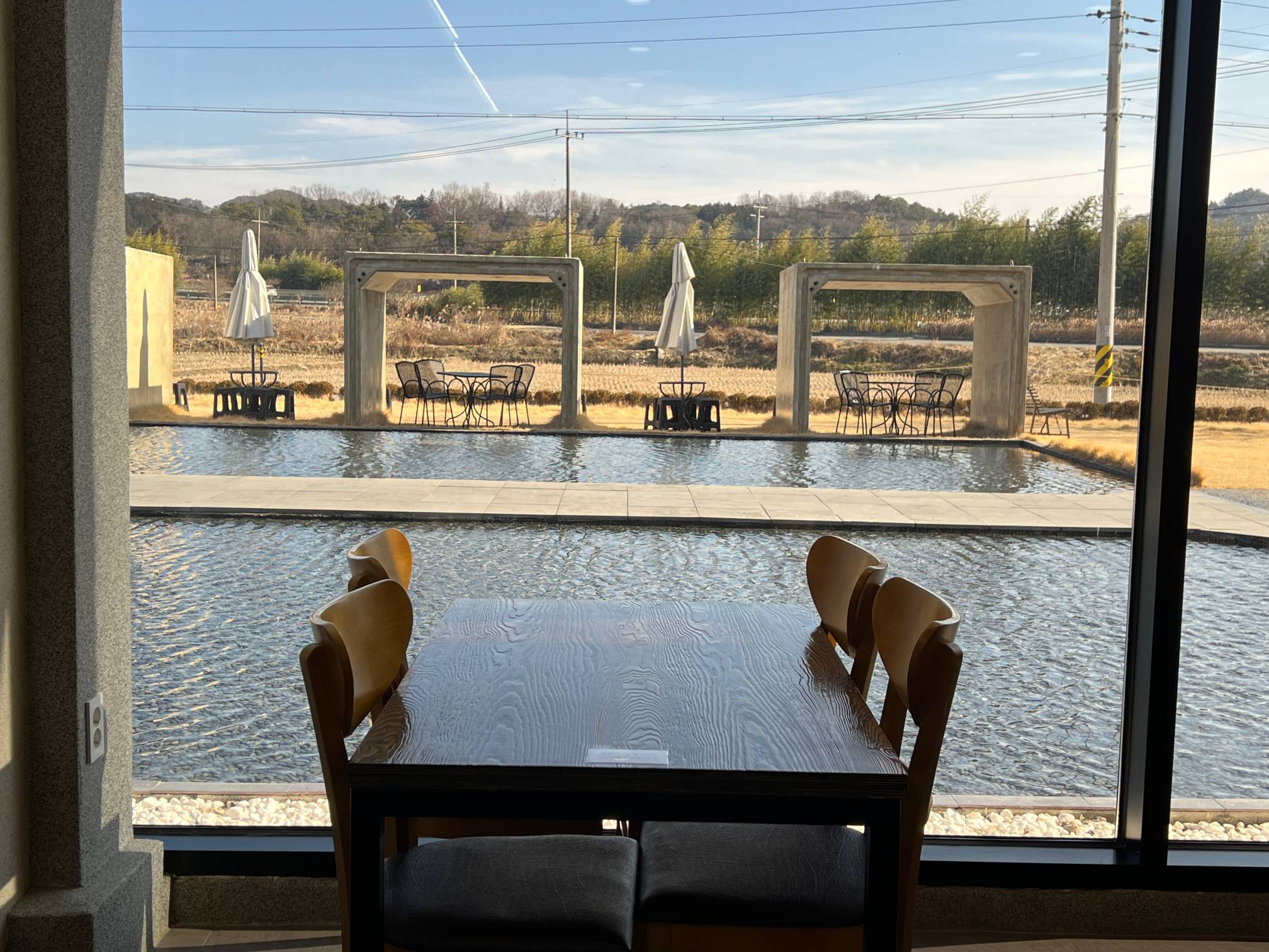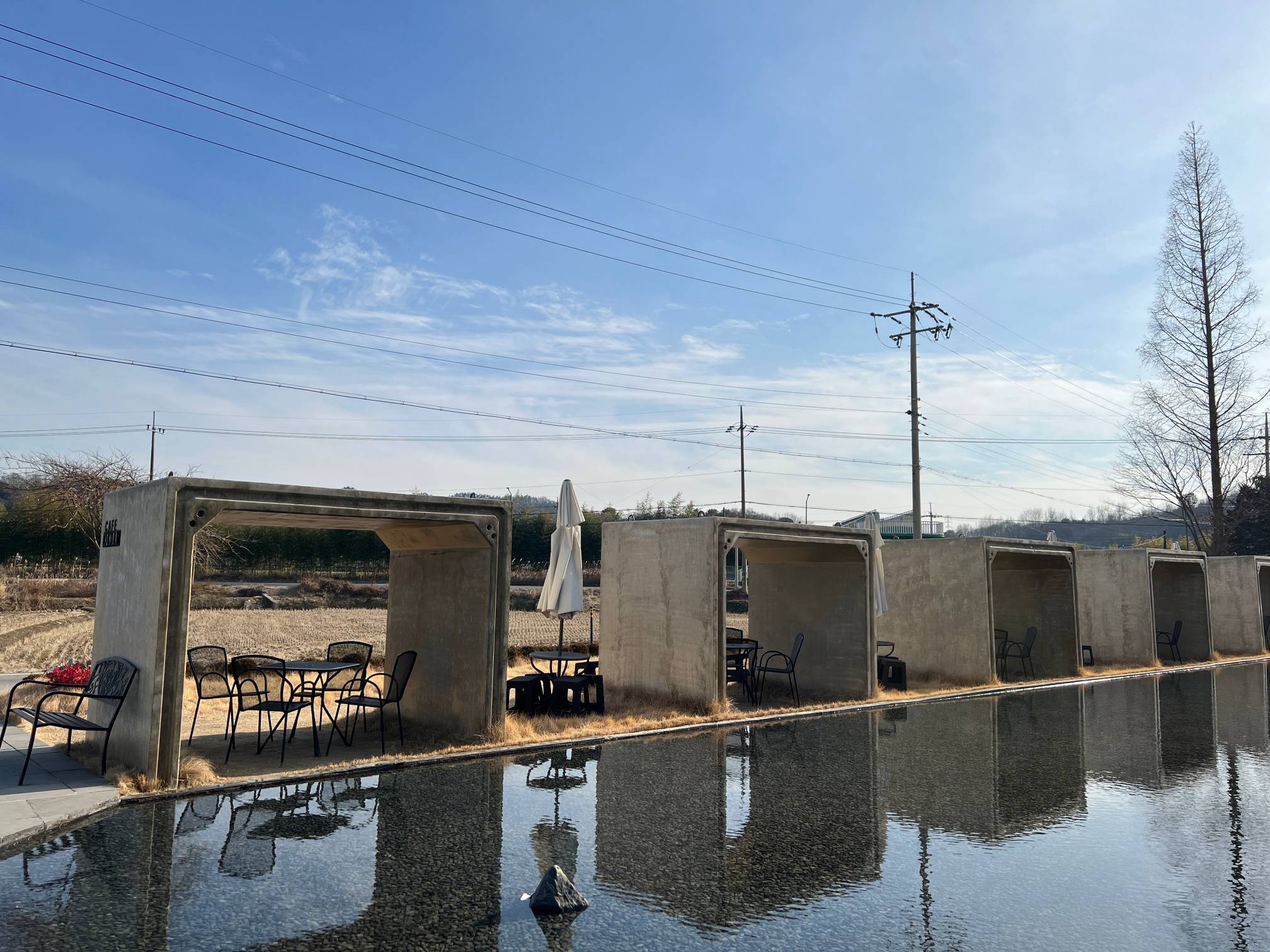 왼편에 카페 메인 건물이 있고, 가운데에는 물이, 그리고 오른편에는 야외 테라스 자리가 있다.