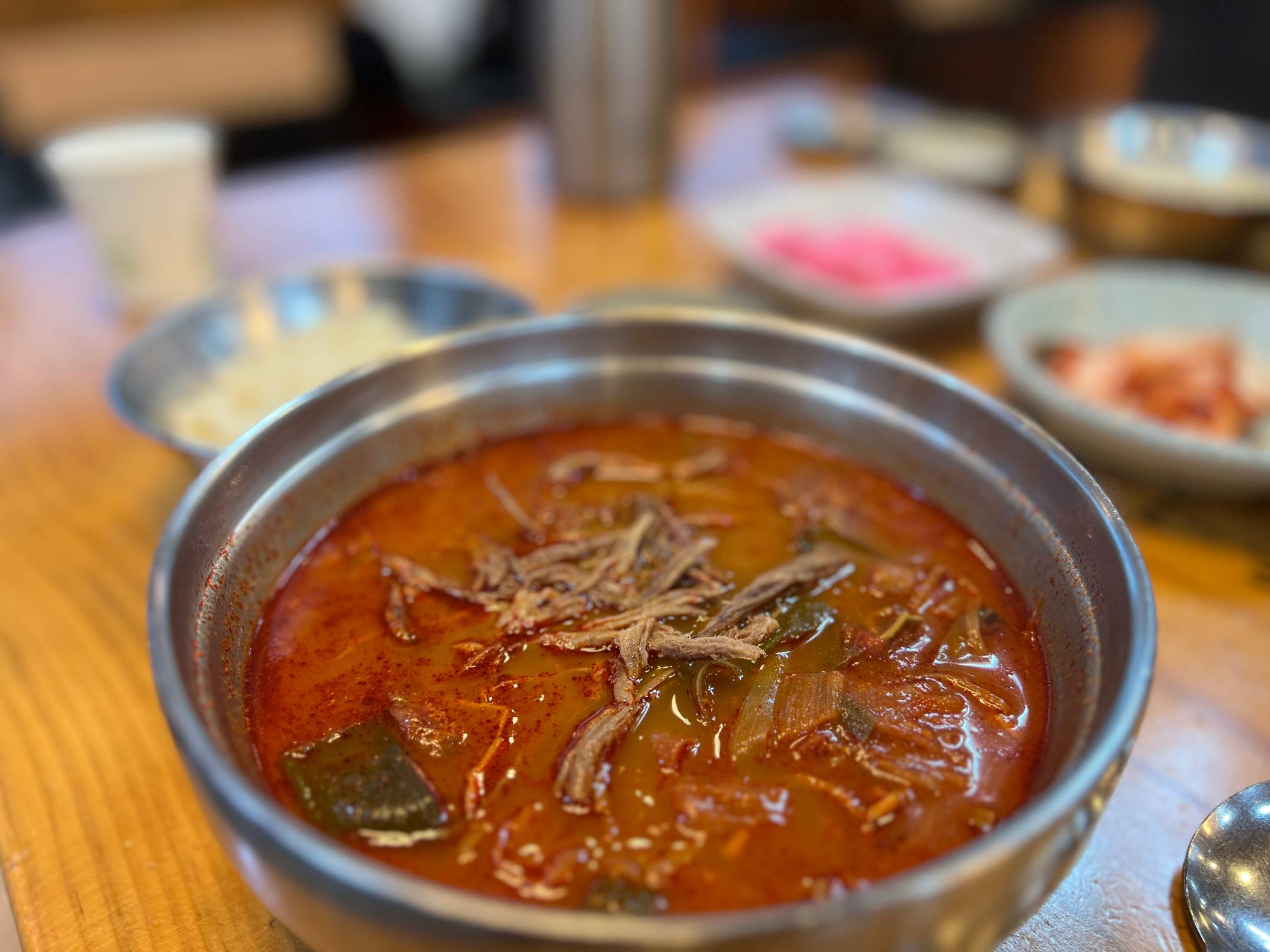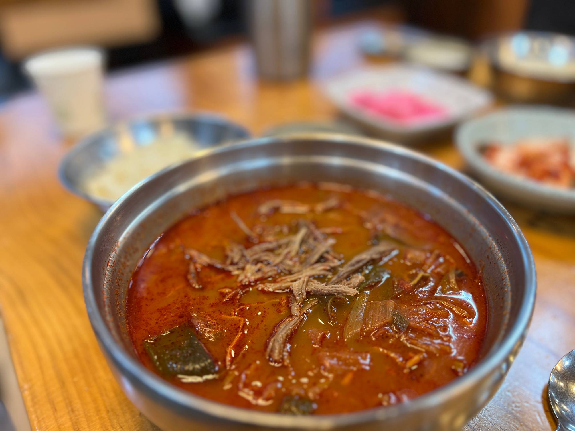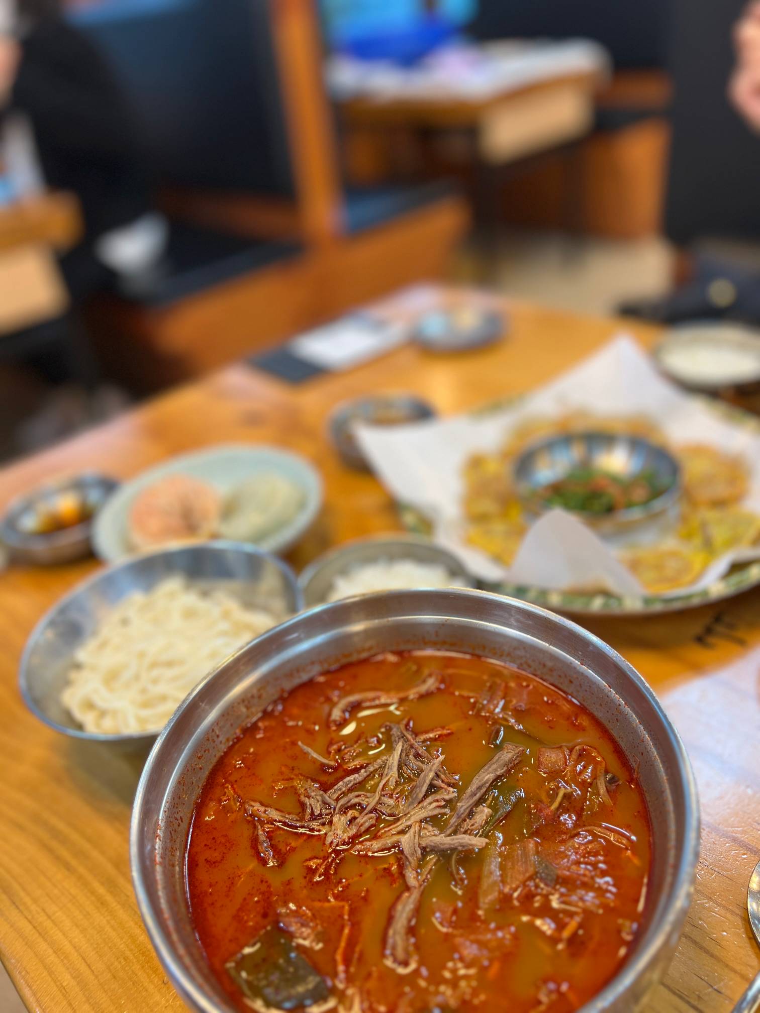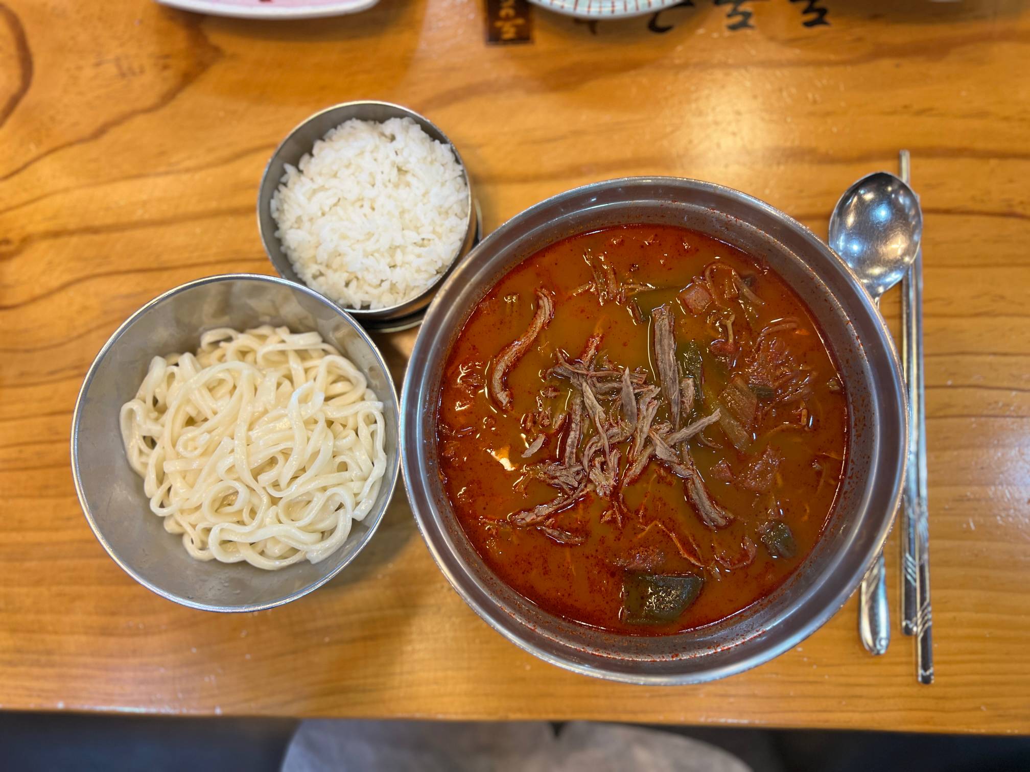 칼칼한 육개장 국물에 칼국수 면이 생각보다 잘 어울린다.