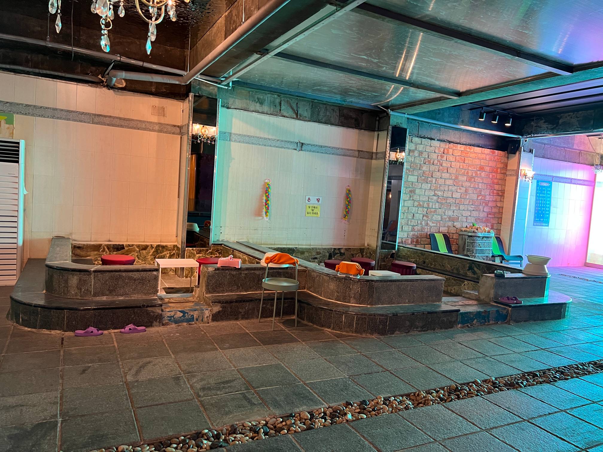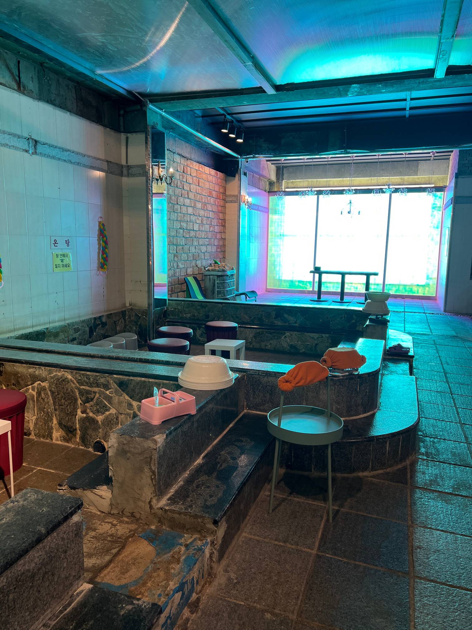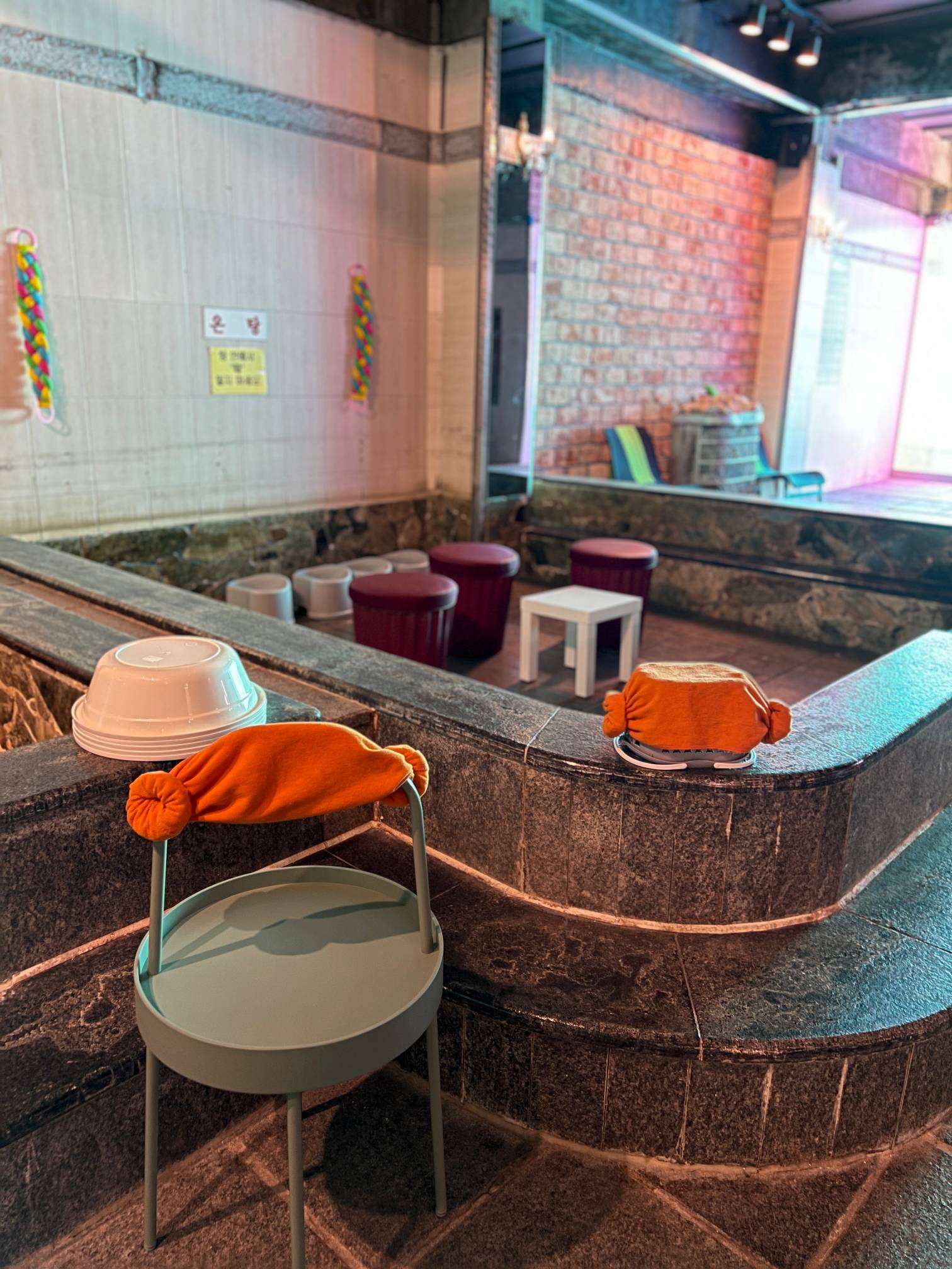 개인적인 생각으로는 입식 테이블을 두지 말고 그냥 과거 찜질방 느낌을 좀 더 살리기 위해