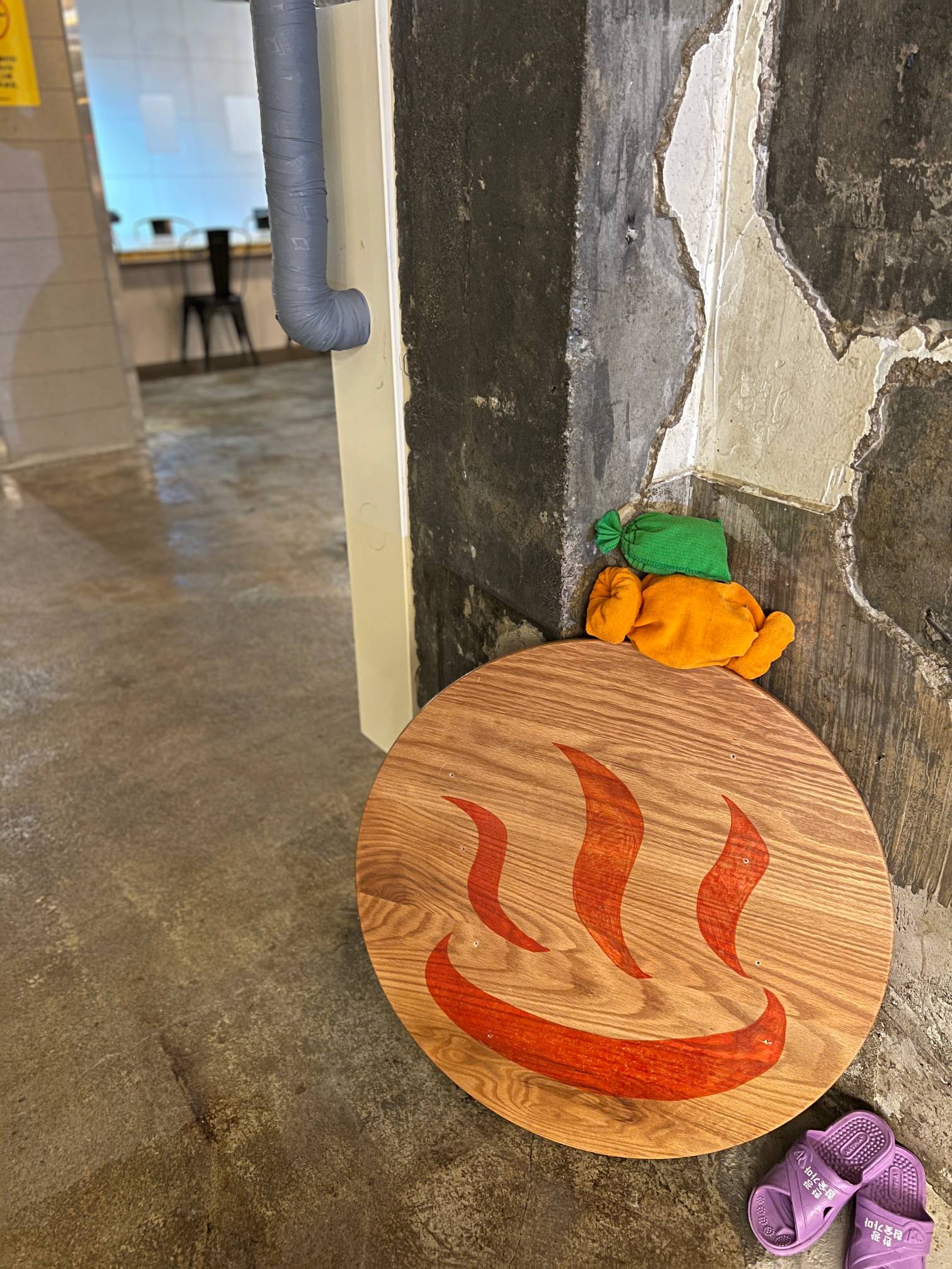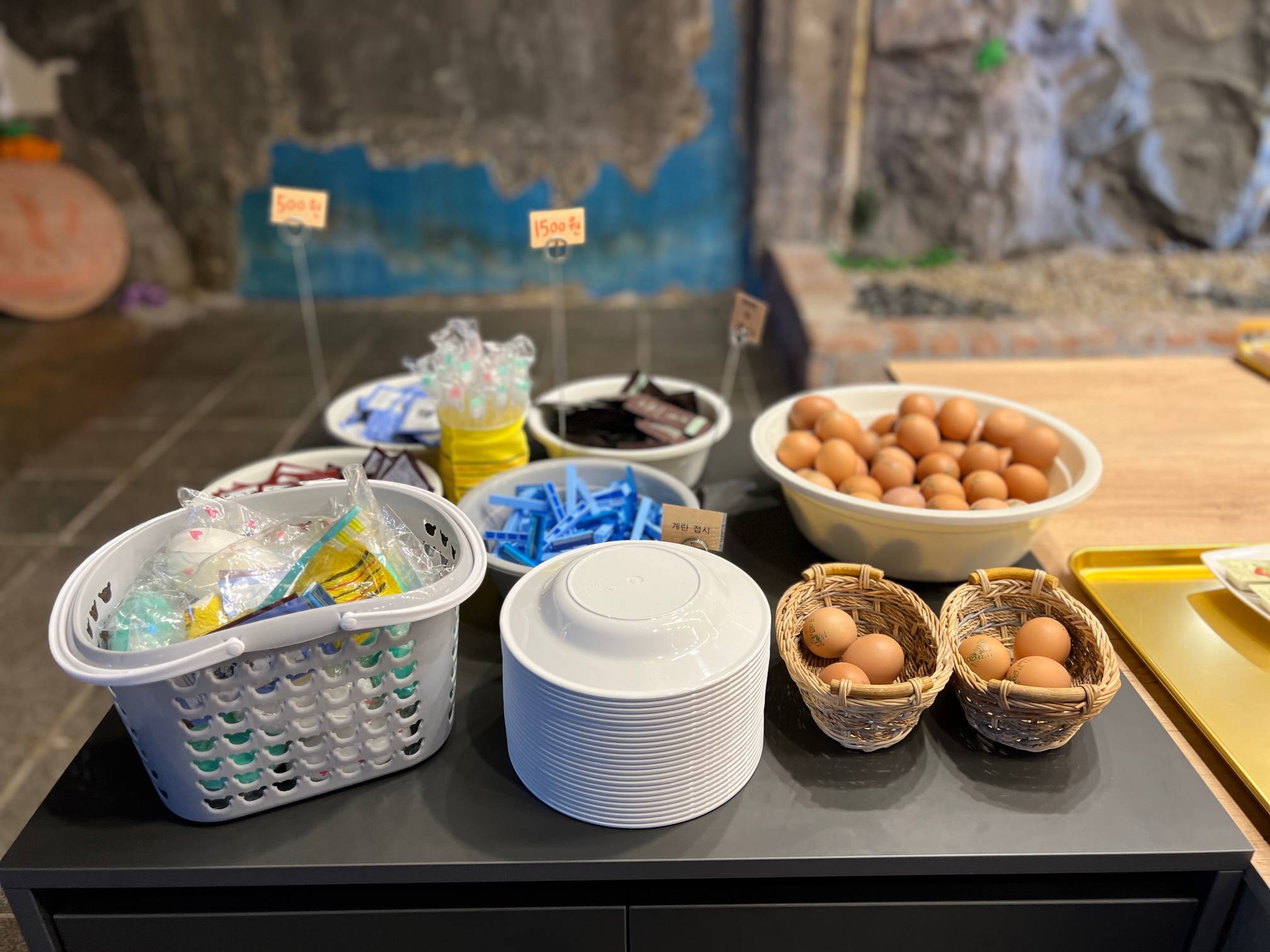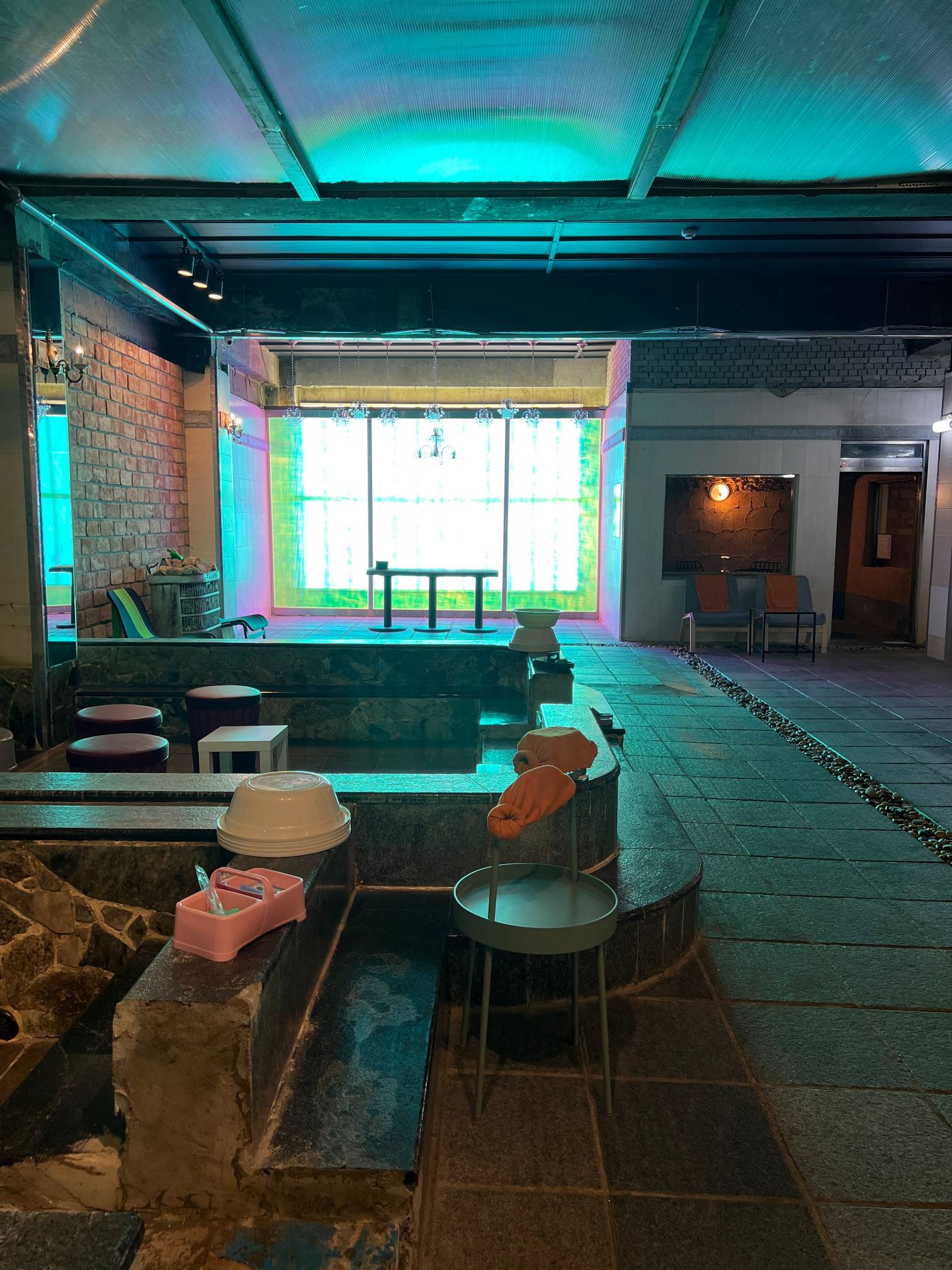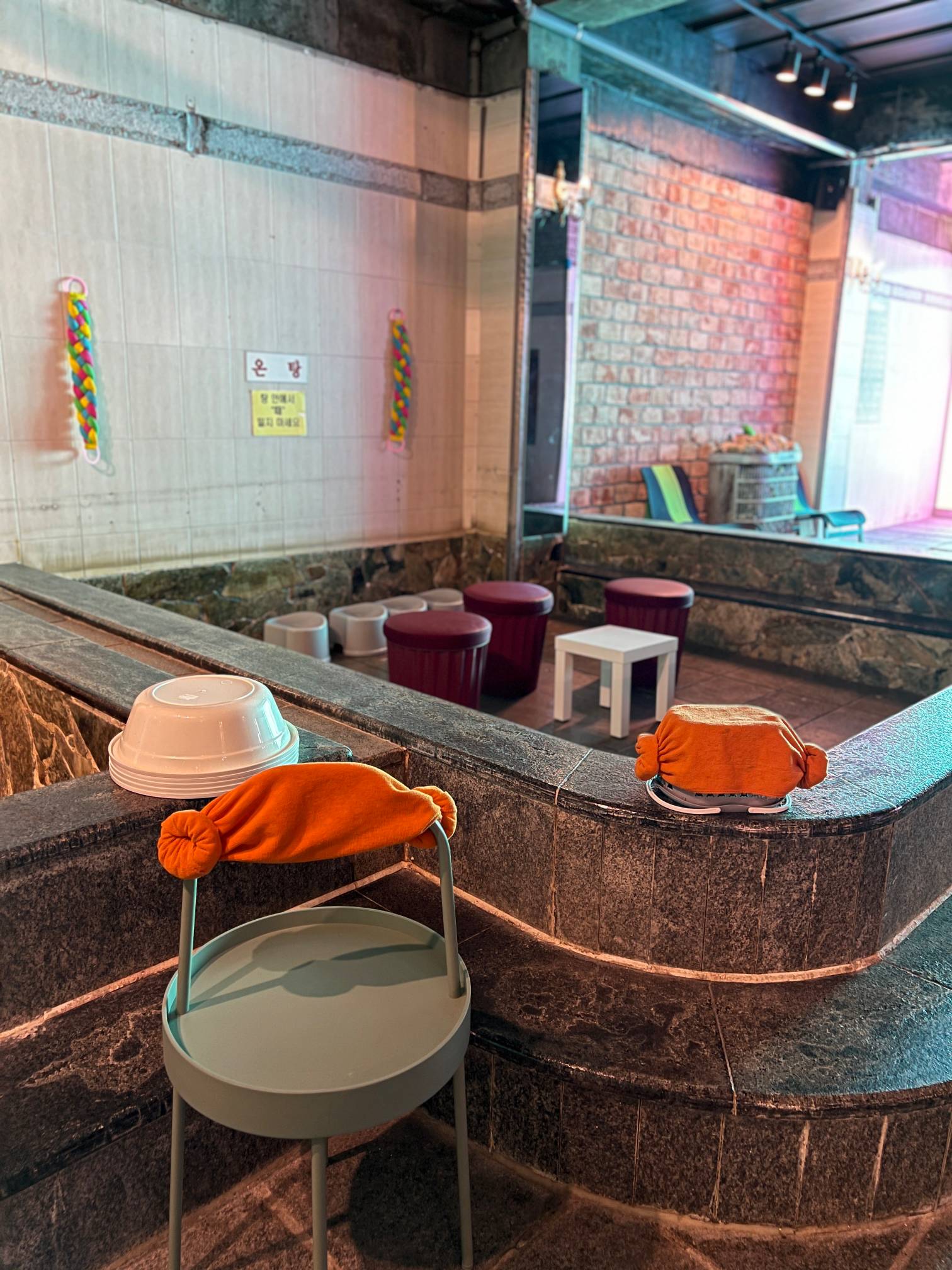 개인적인 생각으로는 입식 테이블을 두지 말고 그냥 과거 찜질방 느낌을 좀 더 살리기 위해