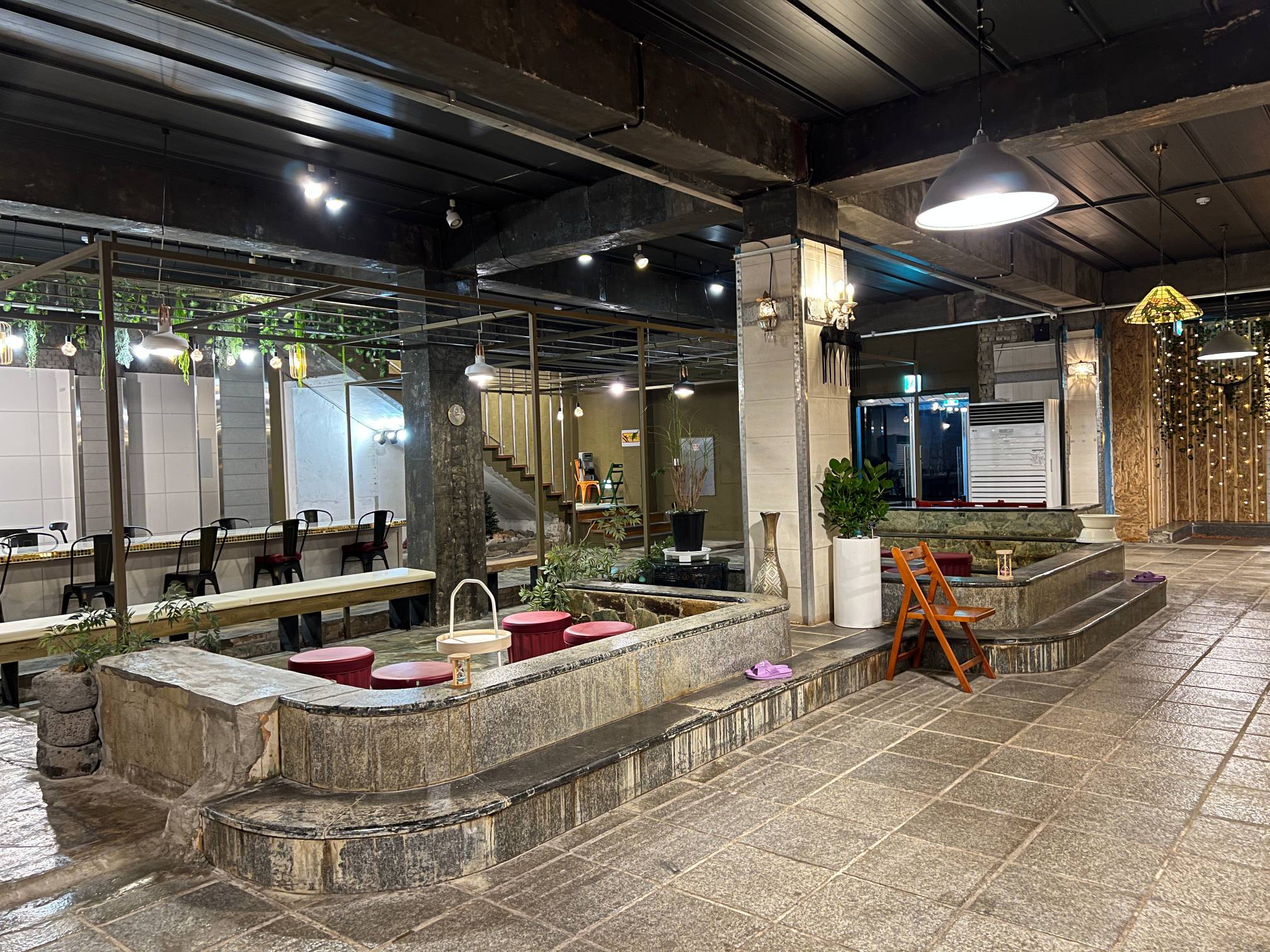 이런 식으로 탕이 있던 자리에도 테이블을 놔서 카페 자리로 재활용 하고 있다.