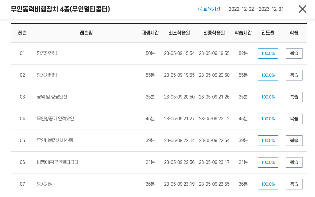 드론 조종 4종 자격증은 6시간 수업만 온라인으로 이수를 하고 간단한 테스트를 통과하면 수료증이 발급된다. 교육비용도 무료이다.