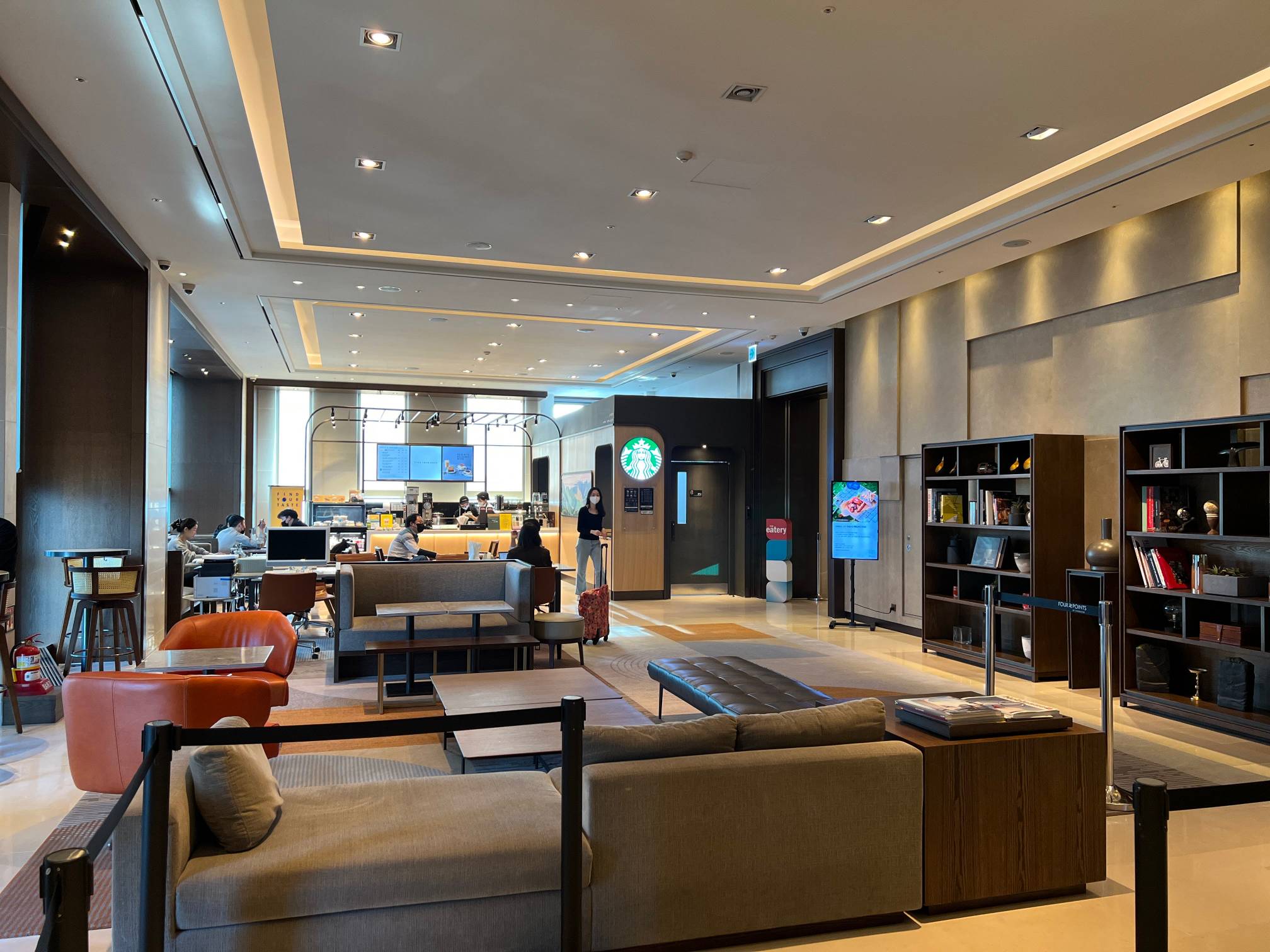 체크인 카운터가 고층에 위치하고 있고, 스타벅스가 있다.