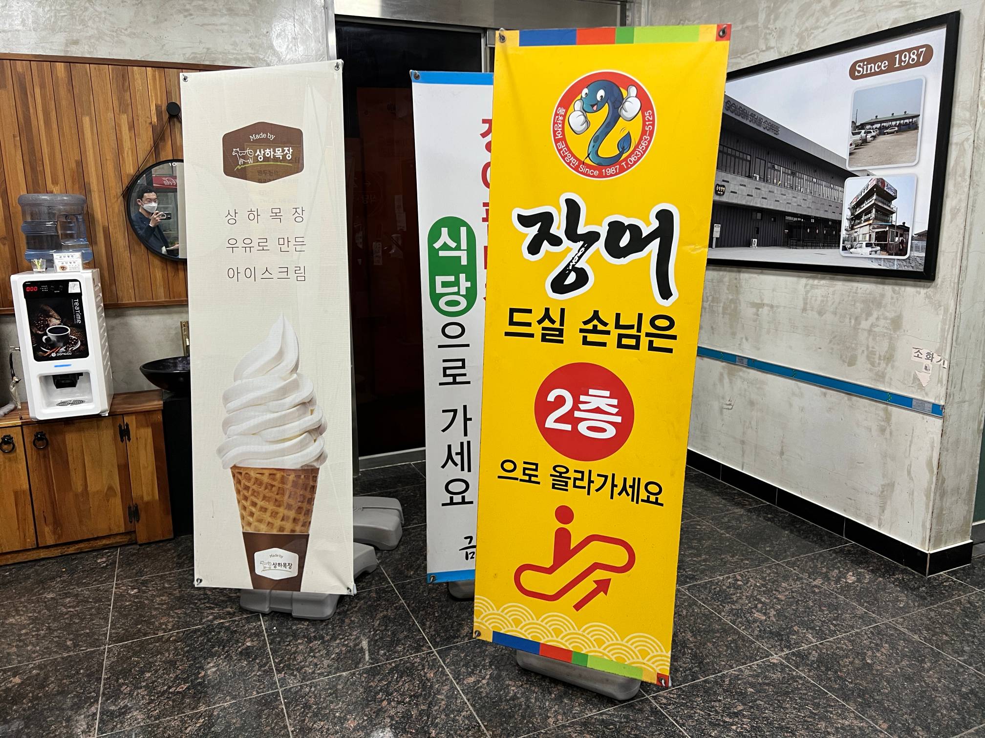 장어 드실 손님은 2층으로 가라는 입간판이 세워져 있다.
