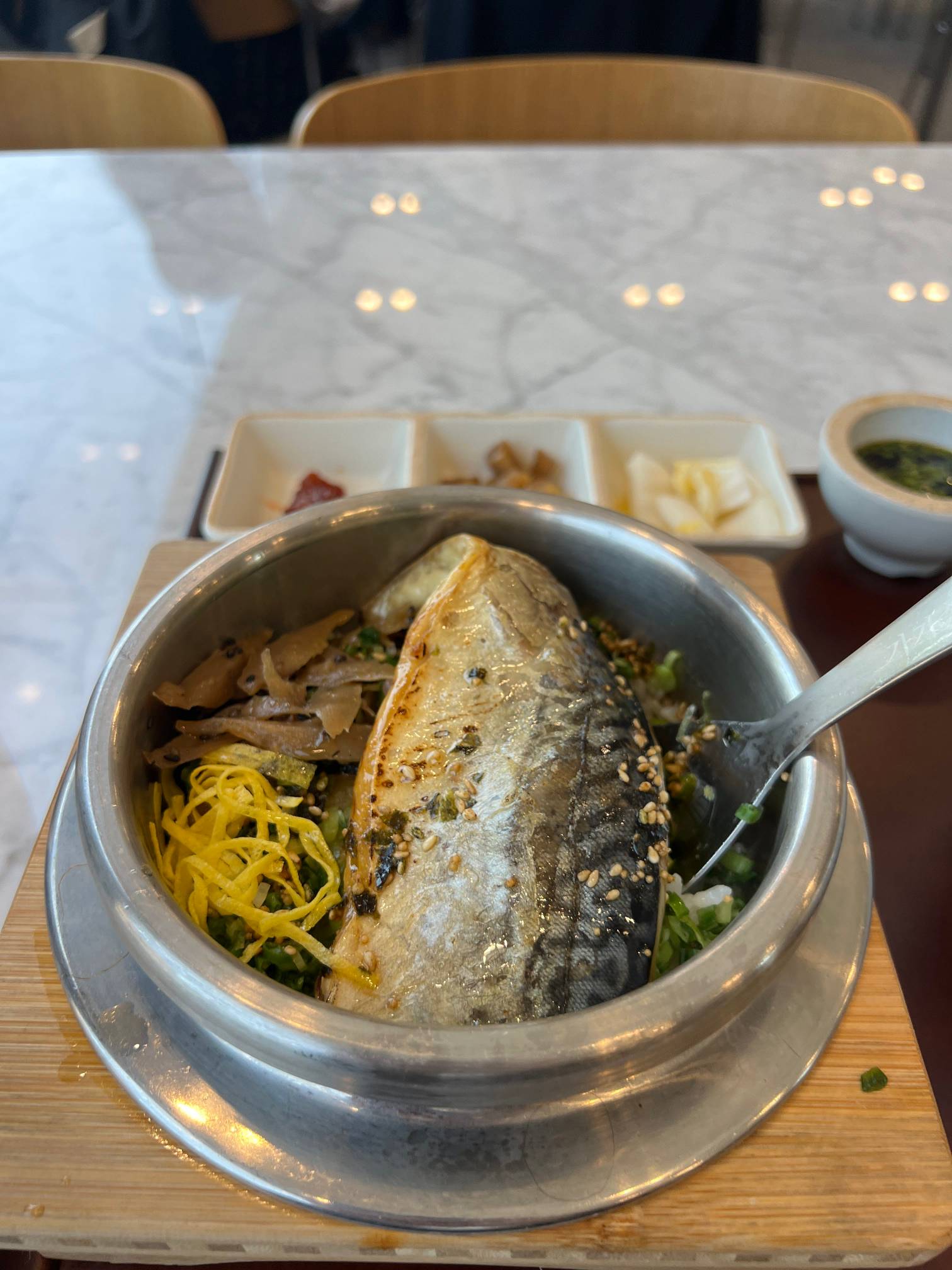 솥밥 위에 고등어 한 마리가 올라가 있는 메뉴이다.
