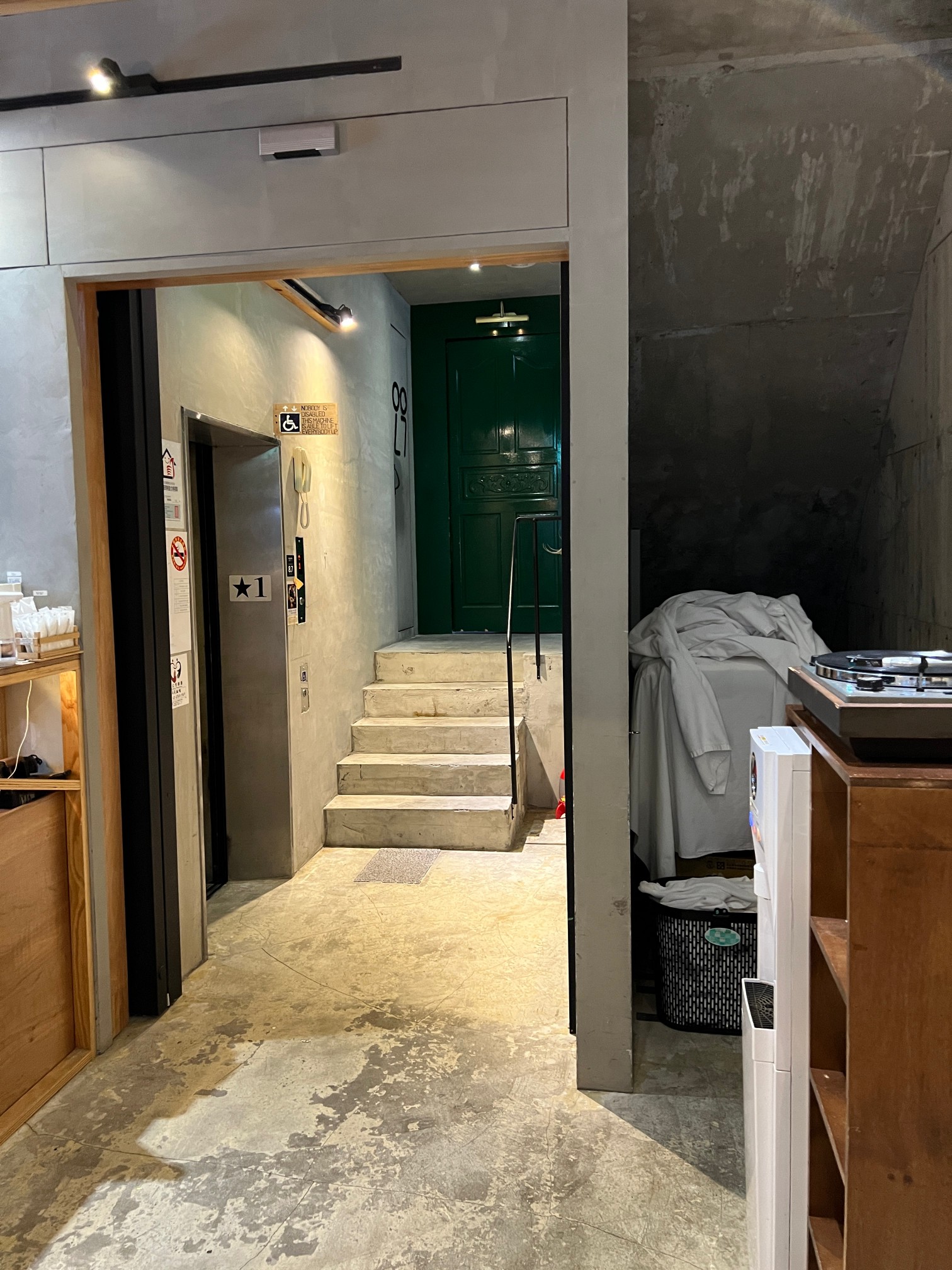 저 계단과 엘리베이터를 타고 객실로 올라갈 수 있다.