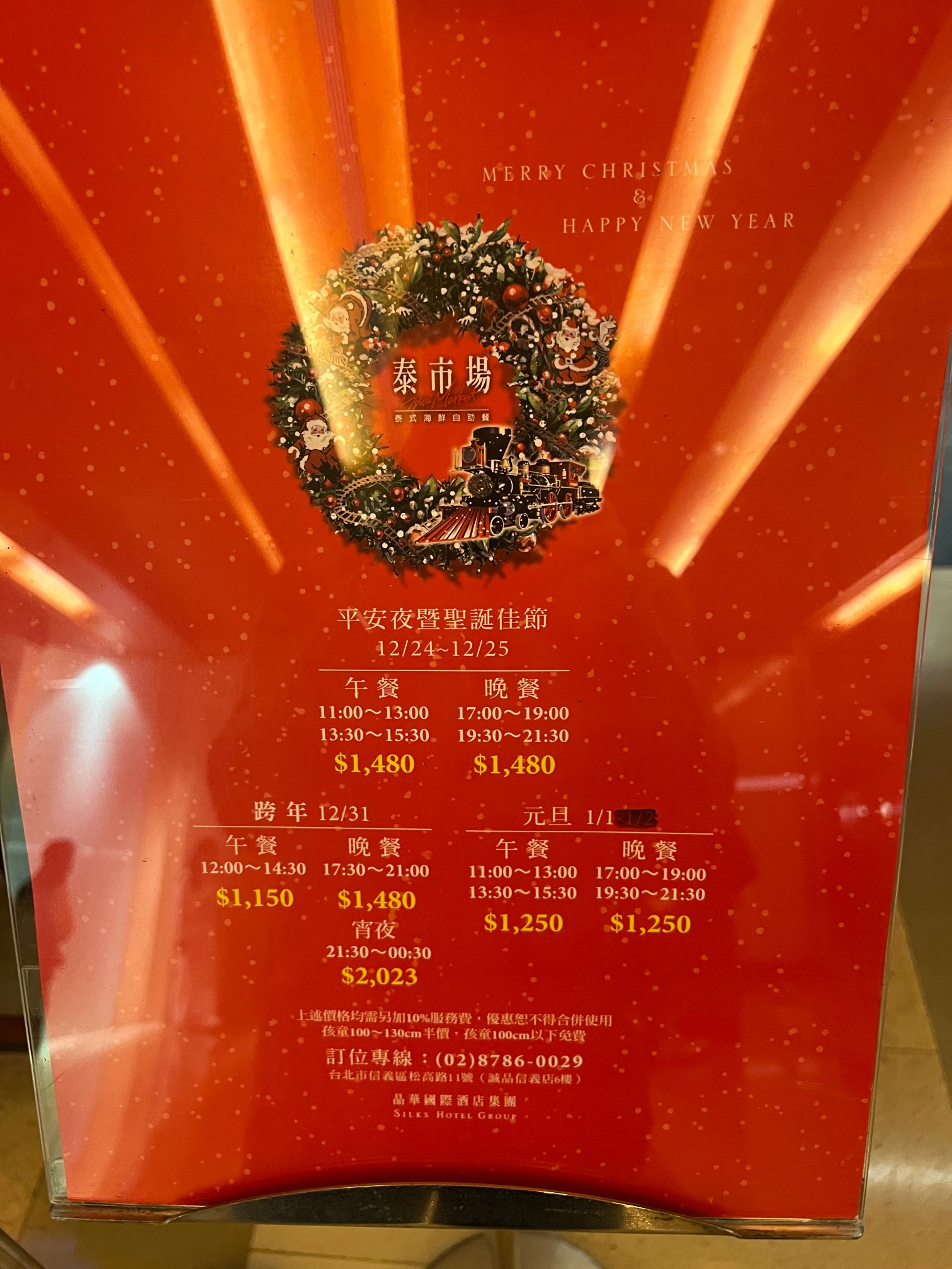 12월 24일과 25일에는 디너 타임에 1480twd이다. 대략 300twd 정도 올려받았으니 우리 돈으로 약 12,000원 정도를 더 지불하는 셈이다.