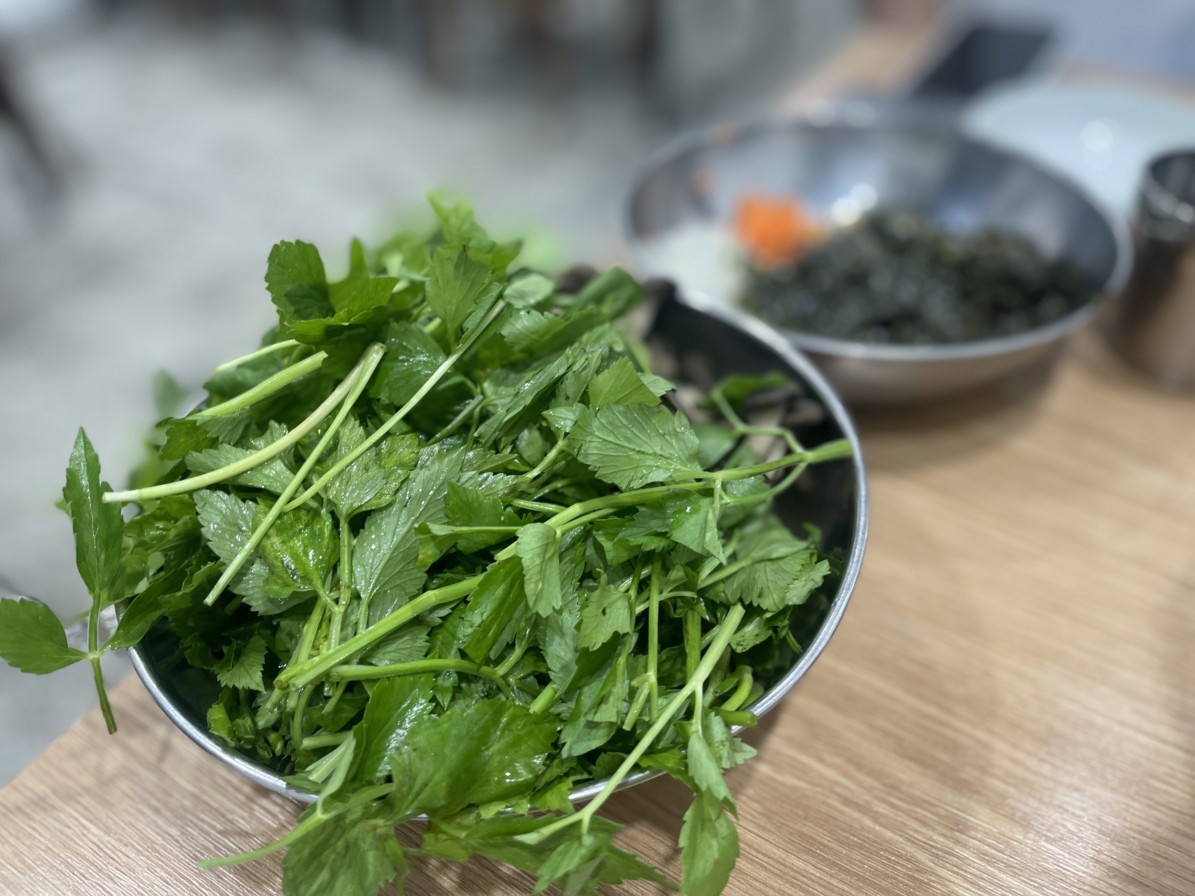 우리가 주문한 미나리 샤부샤부 국물의 모습 미나리가 듬뿍 들어 있다 !!! 버섯도!!!