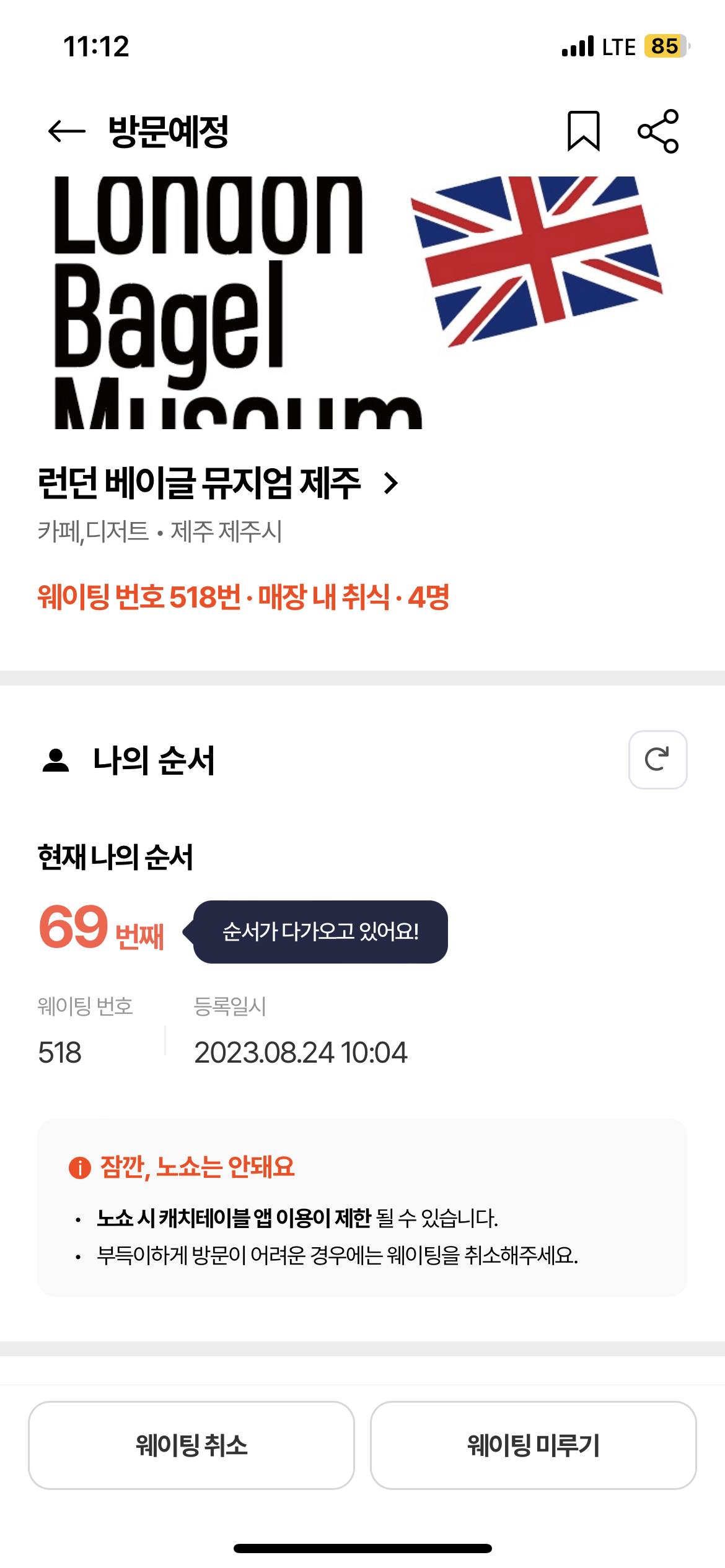 참고로 매장 근처에 있지 않은 상태로 9시 땡하고 예약하면.. 순서가 매우 빨리 빠져 웨이팅 취소가 될 확률이 높으니 9시가 조금 지나 하시거나 “웨이팅 미루기”기능이 2회까지 가능하니 이용해보세요😆