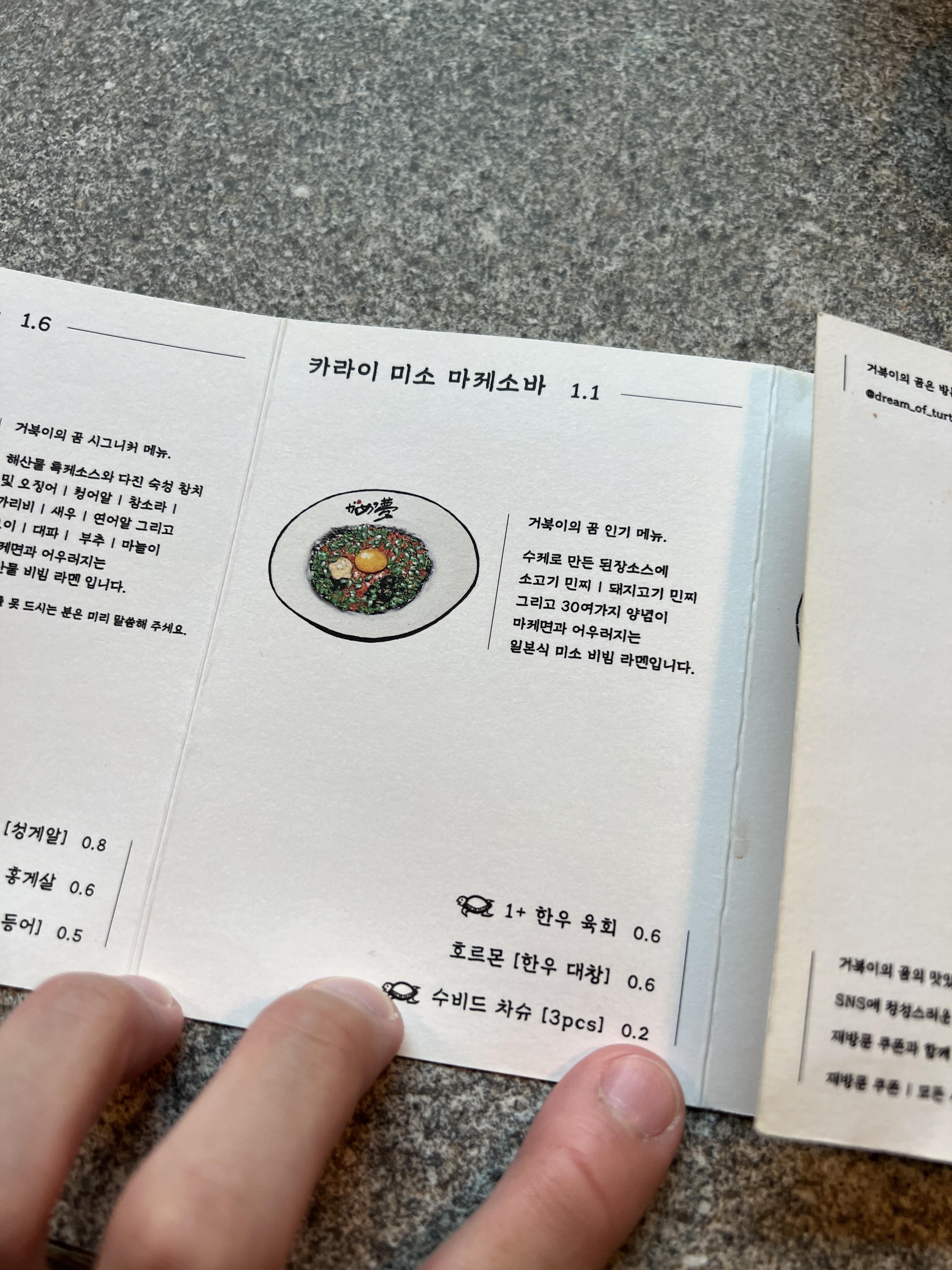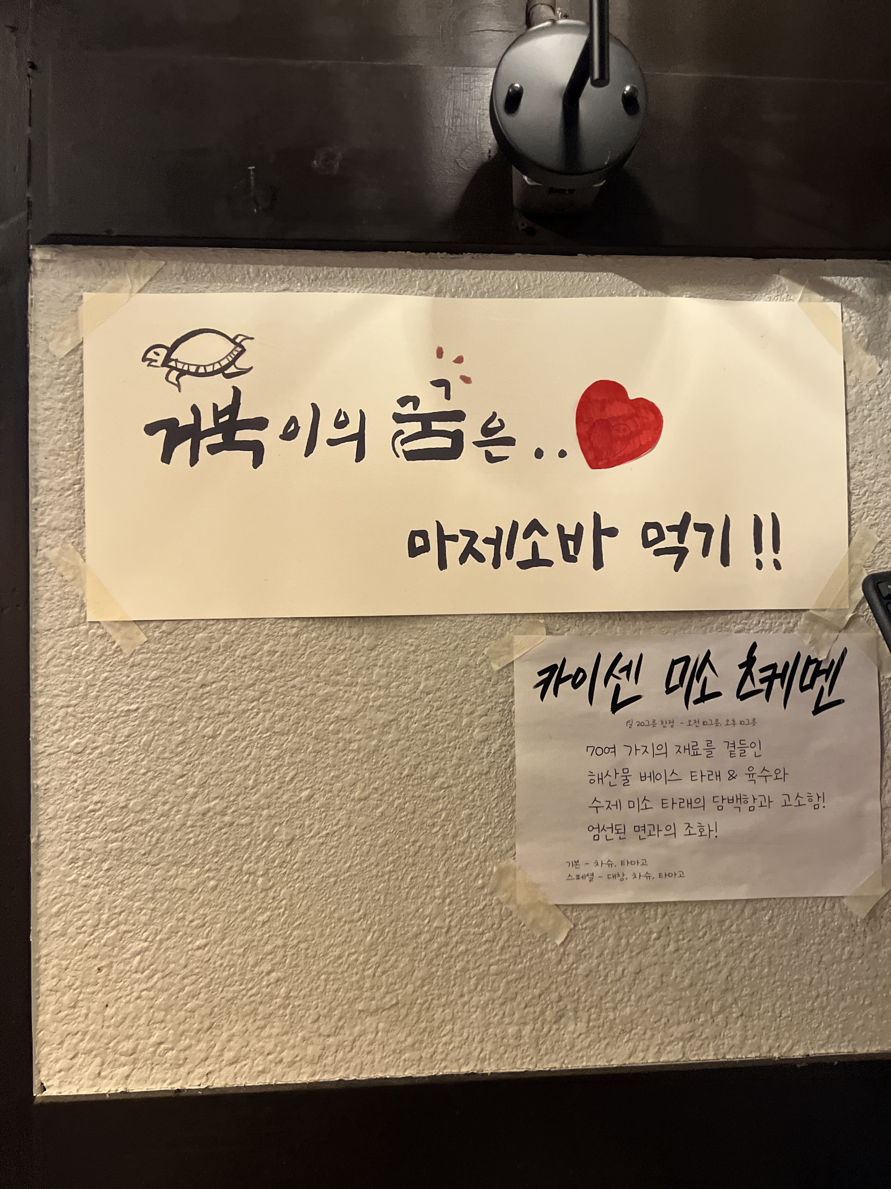 식당 이름이 ‘거북이의 꿈‘인데 사실 유래는 잘 모르겠고 암튼 마제소바 먹는 게 꿈이라고 한다.
