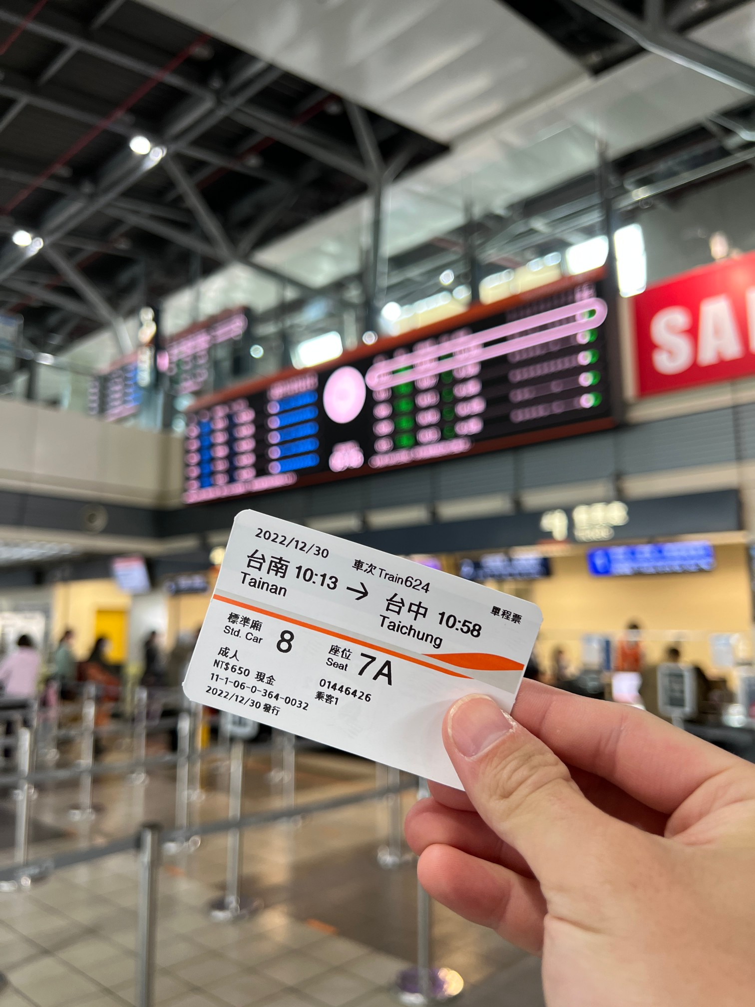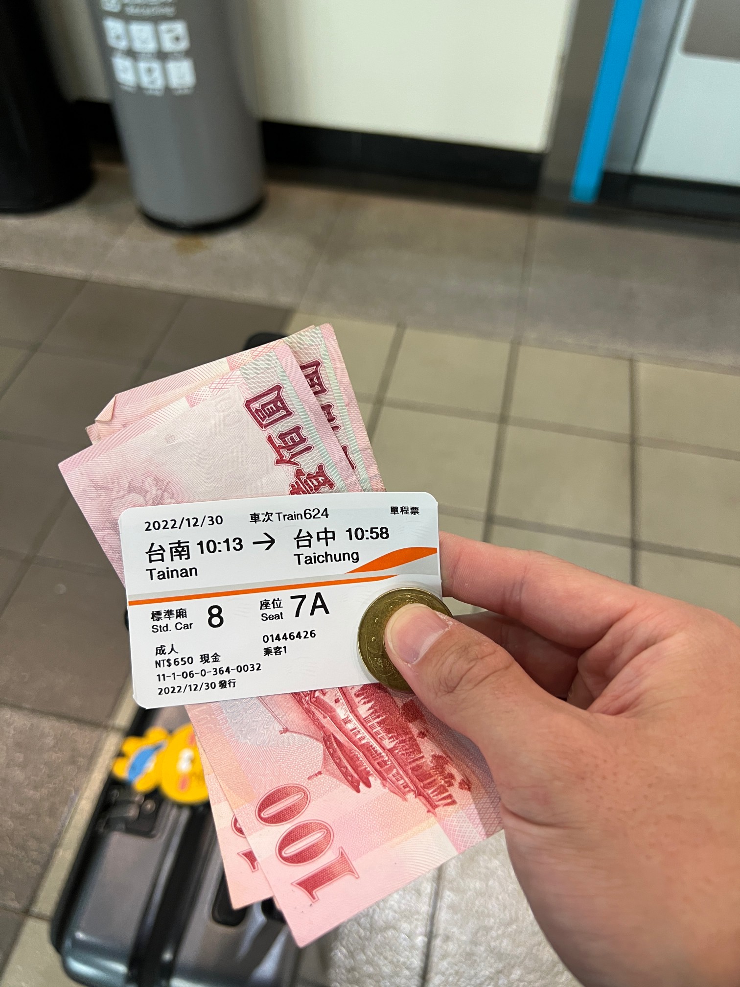대충 타이난 시내에서 타이난 고속철도역까지는 버스로 1시간, 타이난 고속철도역에서 타이중까지는 고속철도로 약 45분 정도가 걸리고 가격은 650 대만달러이다. 우리 돈으로 하면 2만원 정도.