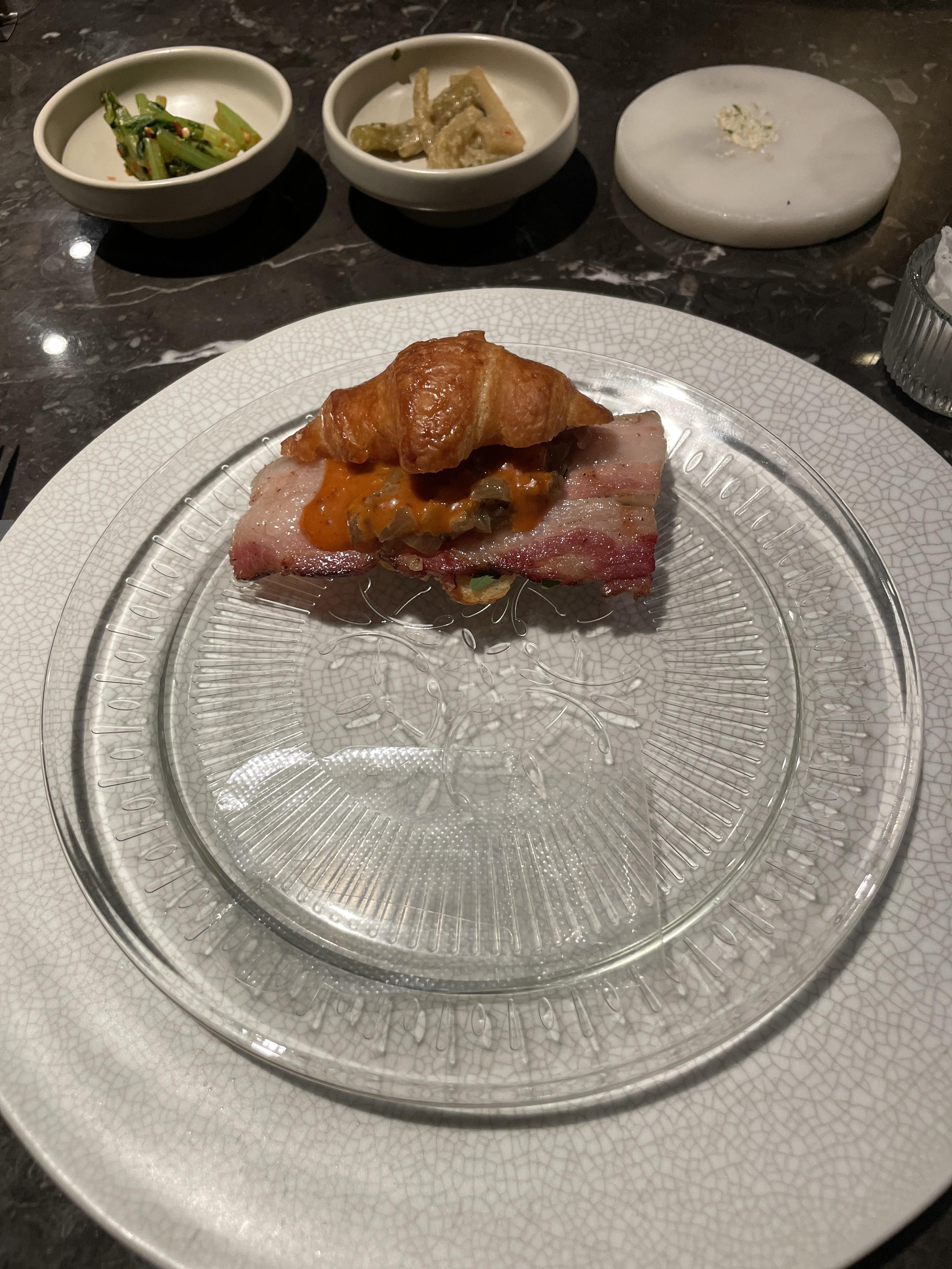 다음 메뉴 크라상 사이에 고기가 끼워져 있는 메뉴