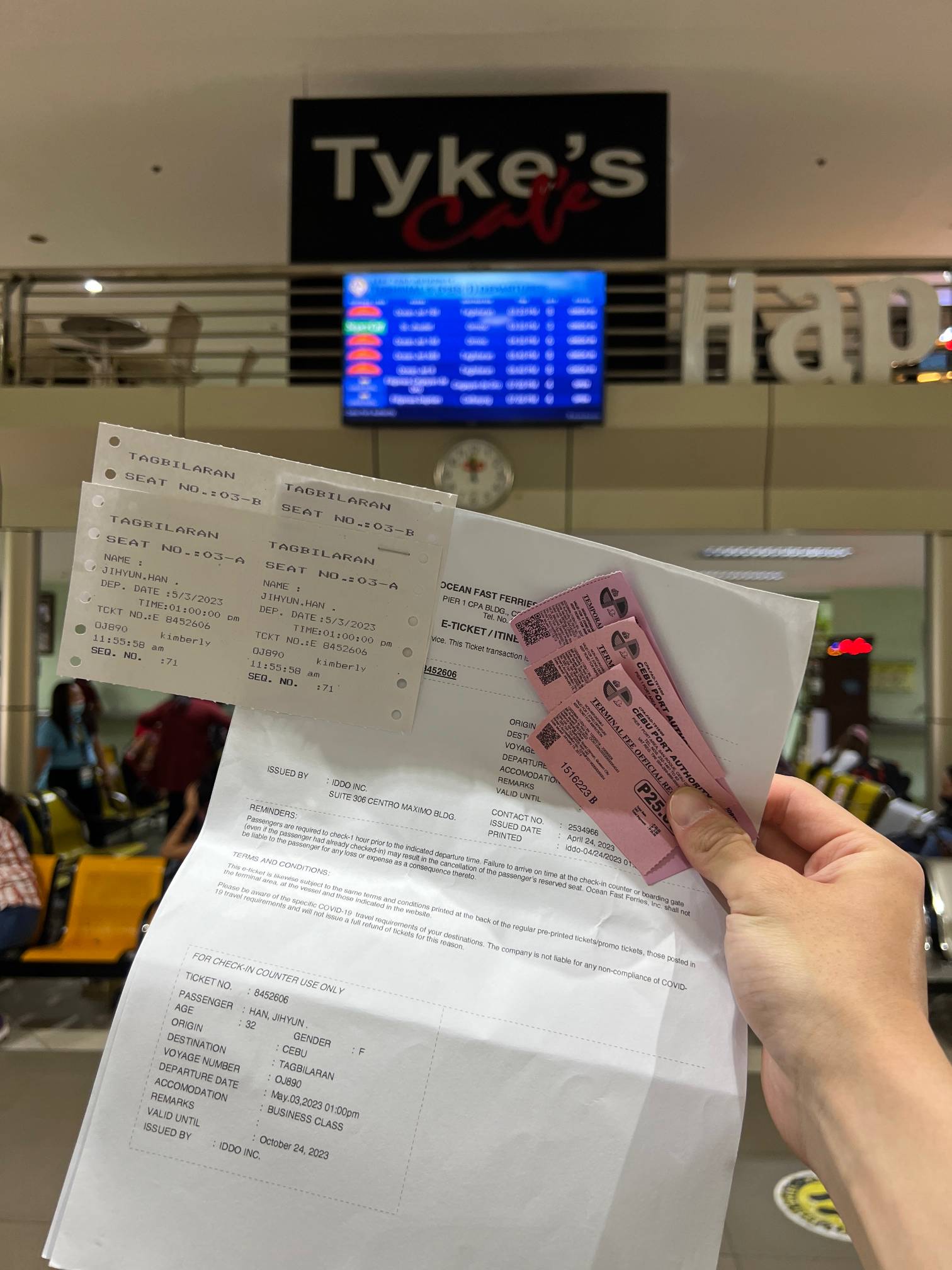 #피어1 : 그렇게 체크아웃을 하고 이제 보홀로 이동하는 날. 나는 미리 와그에서 세부 피어1에서 보홀 탁빌라란 항구로 이동하는 오션젯 페리를 미리 예약했다. 자리는 일반석과 비즈니스 자리가 있는데 비즈니스 자리 가격은 1인 편도 약 3만원 정도이다. 개인적으로는 가격 차이가 그리 많이 나지 않으니 무조건 비즈니스로 예약하는 걸 추천. 비즈니스로 해야 자기 캐리어를 직접 휴대할 수 있고, 좌석도 훨씬 넓고 편하다.