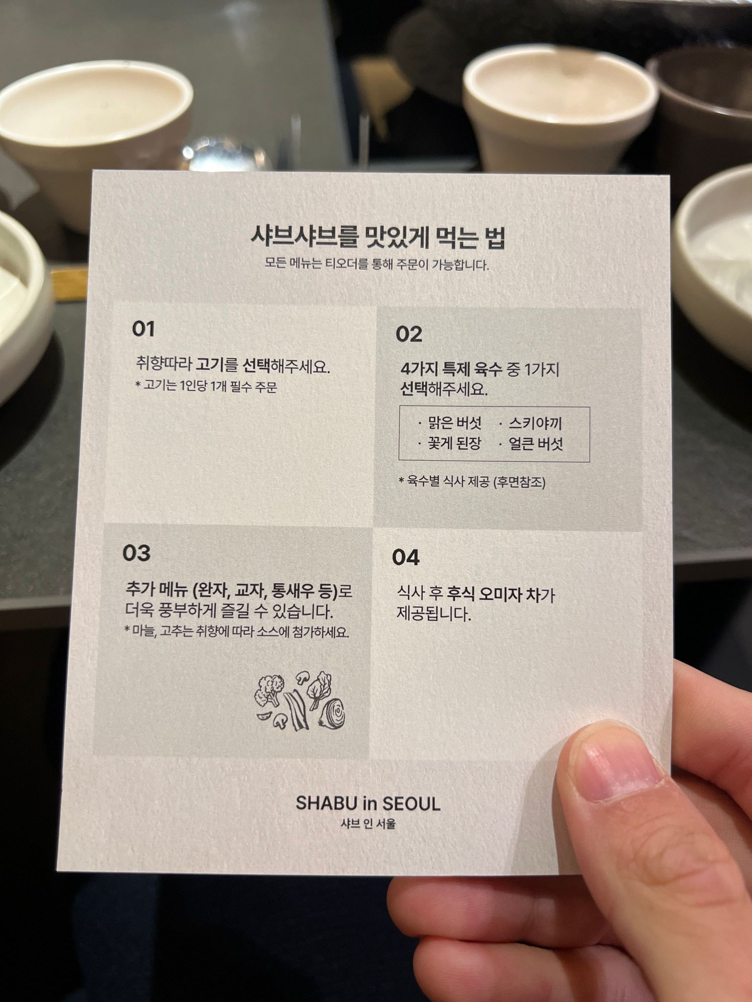 용리단길에 있는 식당들은 웬만한 곳은 다 가본 것 같은데 샤브인서울은 이제서야 처음으로 가봤는데 손님 대접하기에도 괜찮고, 청첩모임 하기에도 괜찮은 것 같은 식당이라서 이렇게 추천한다.
