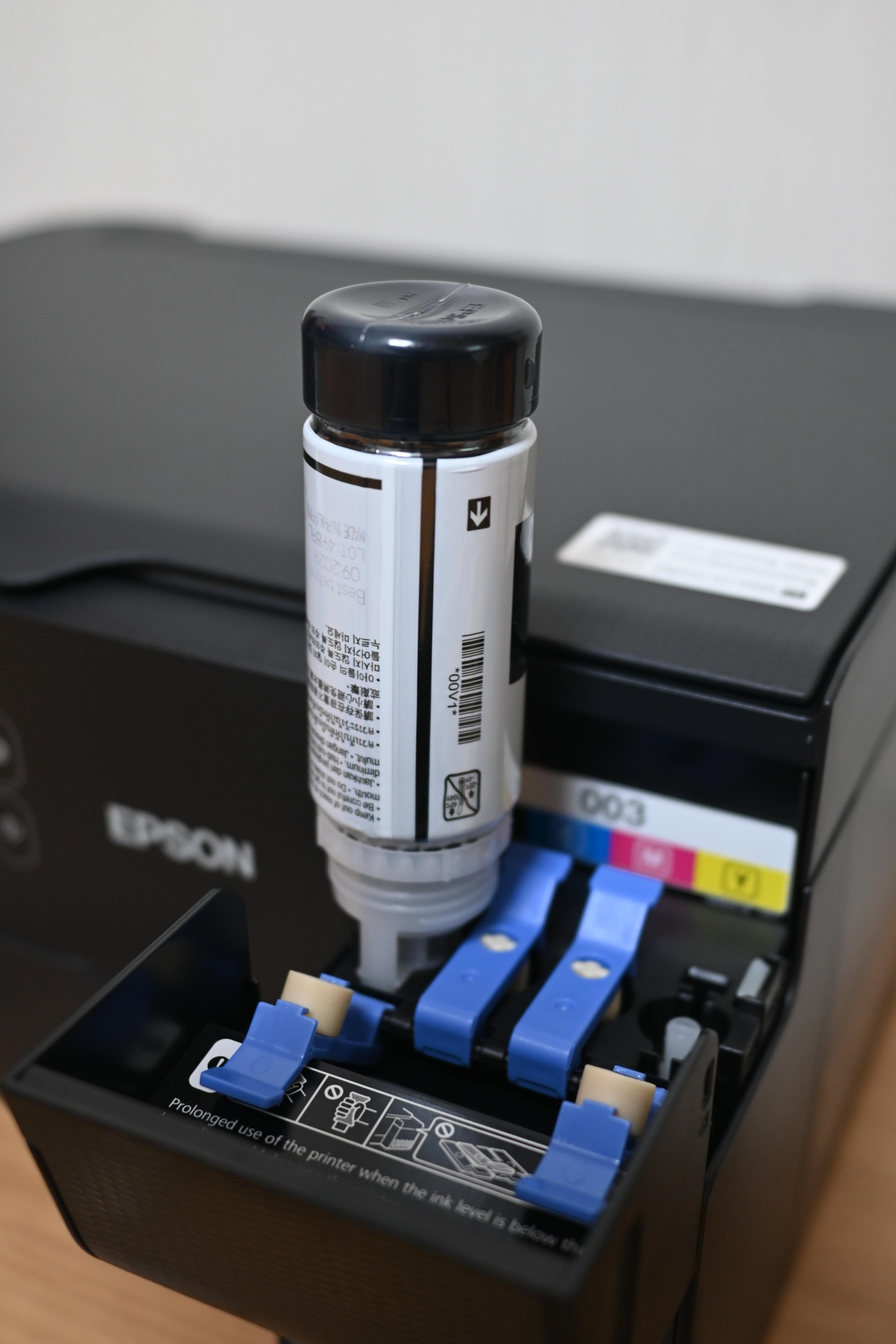 저 뚜껑을 열고 입구에 맞춰서 잉크통을 꽂아주기만 하면 매우 편리하고 깔끔하게 잉크를 리필할 수 있다.