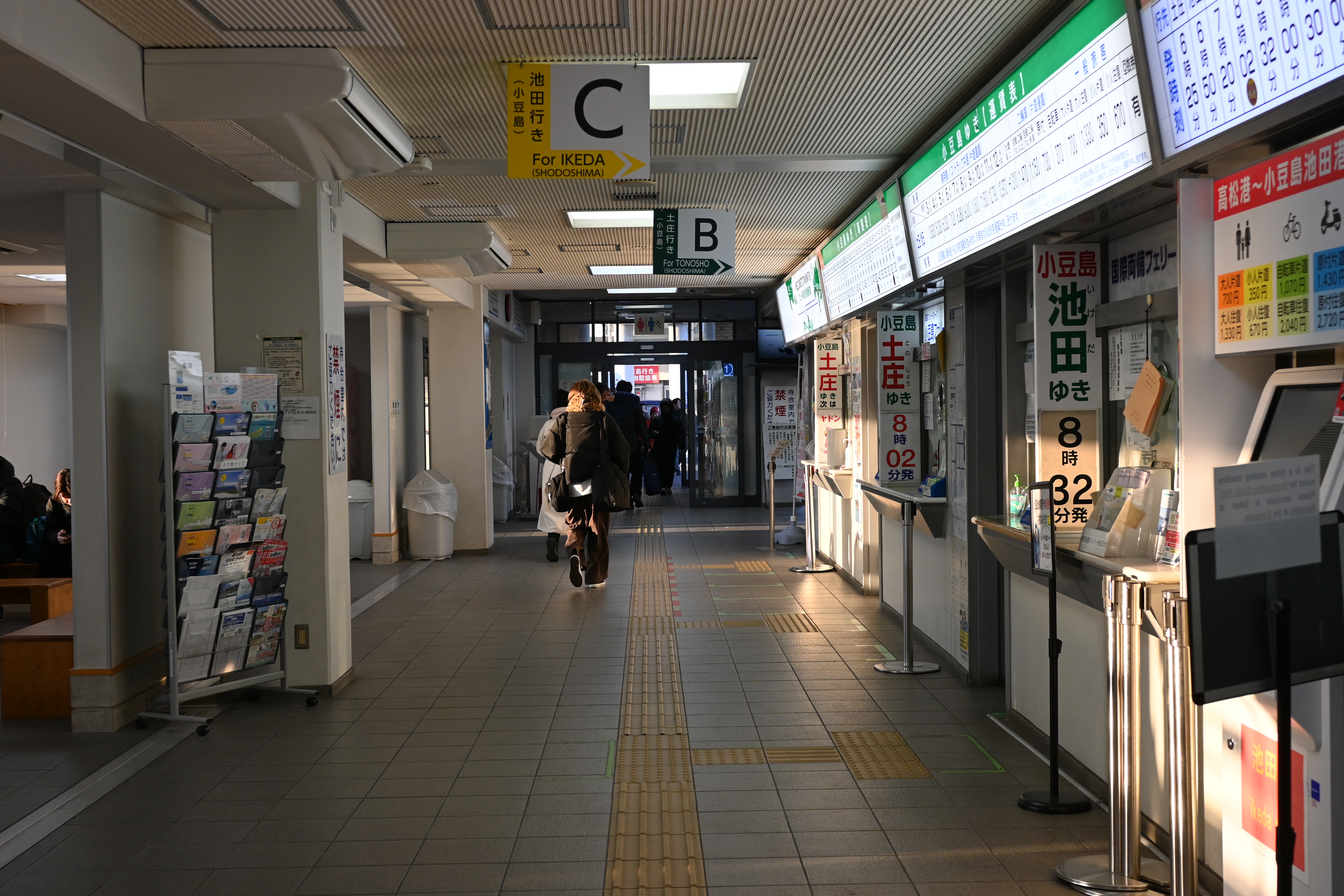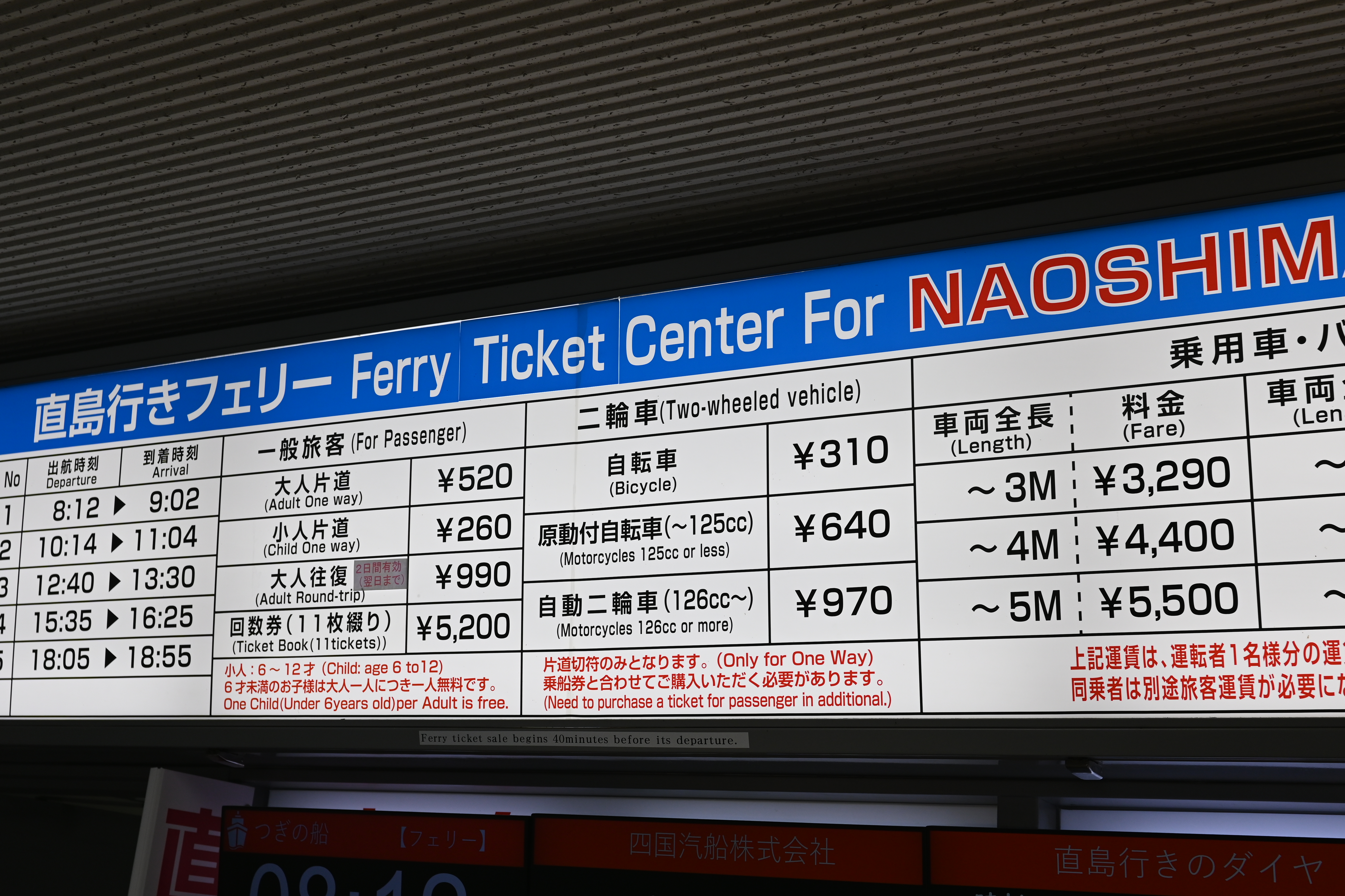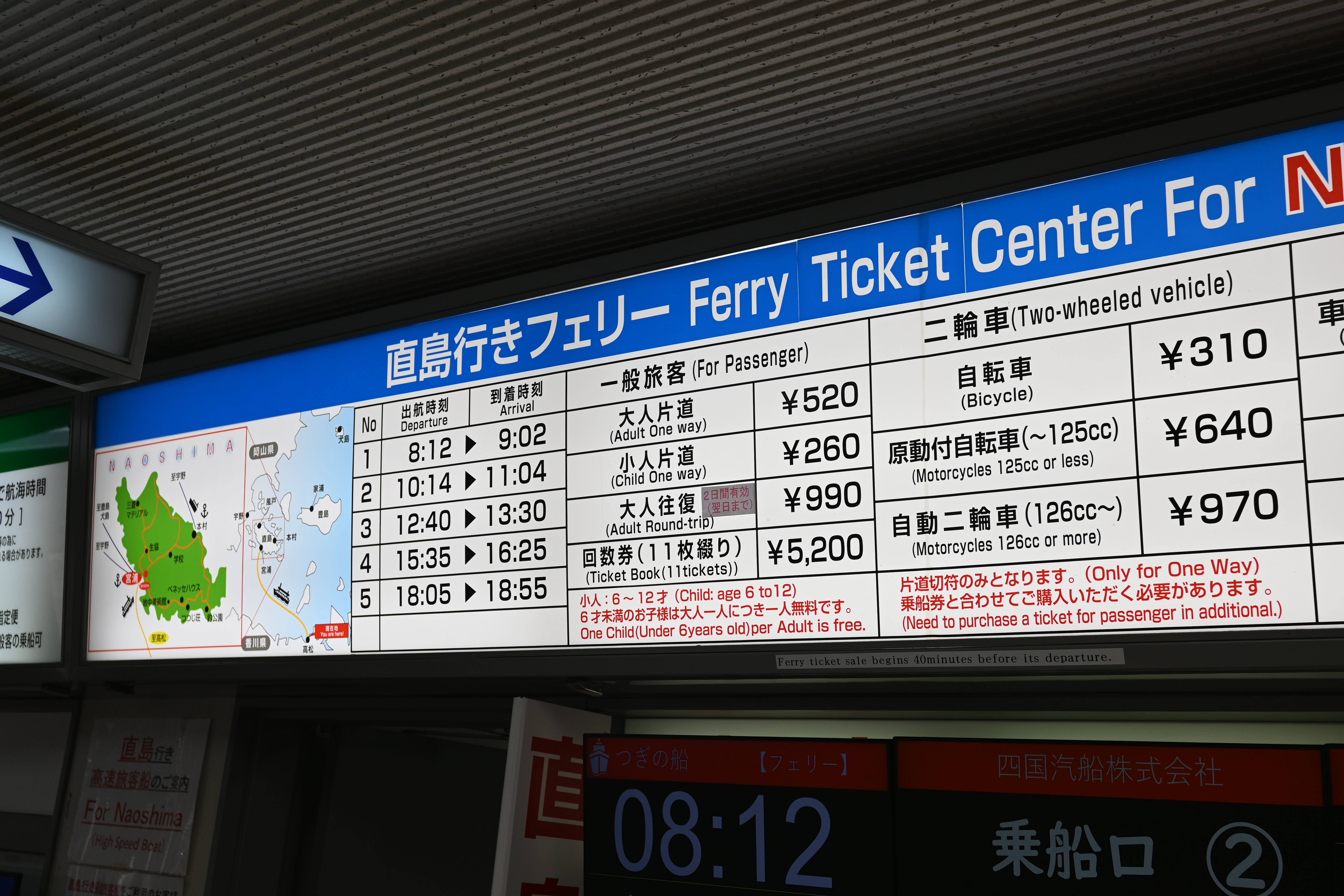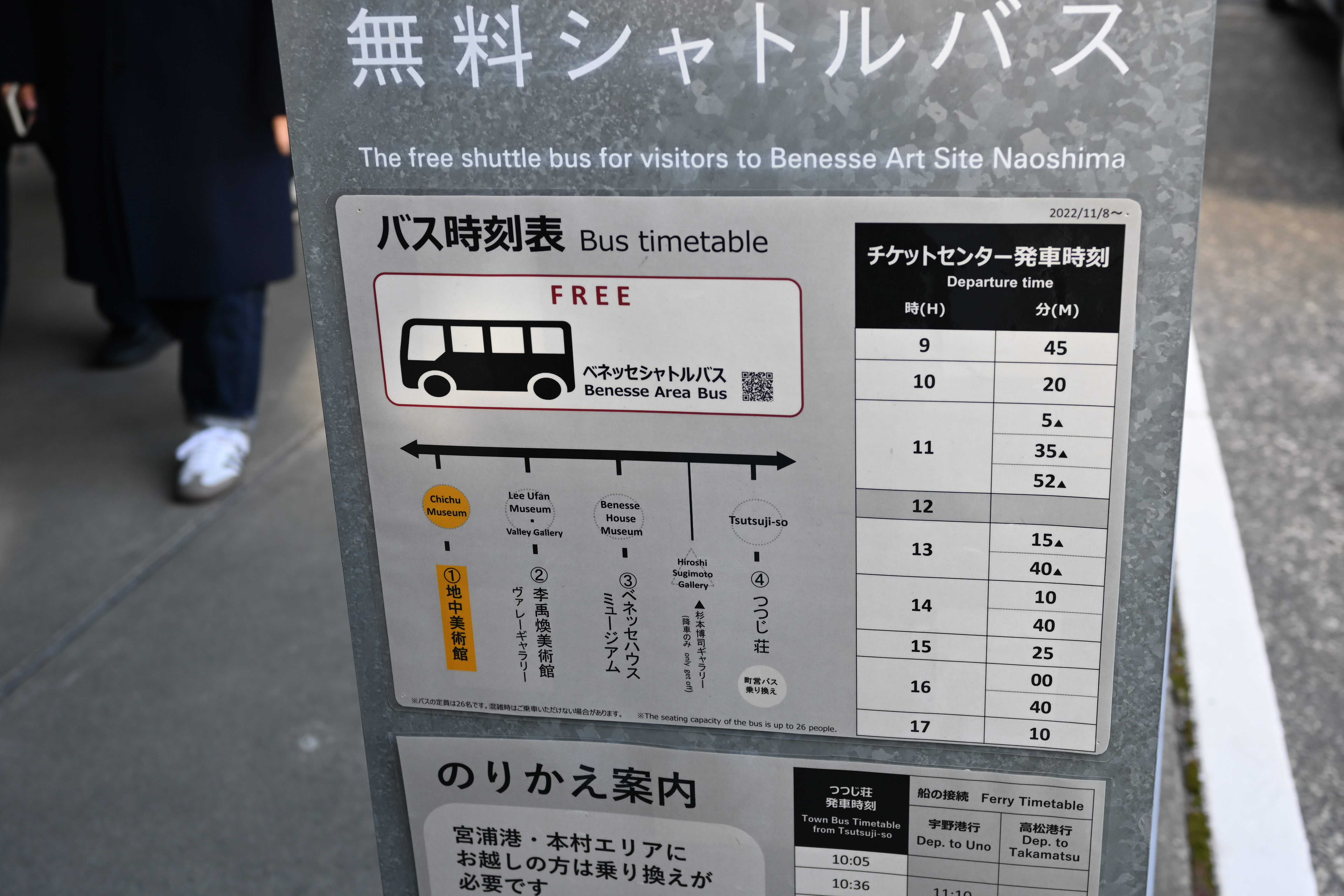왕복 페리 가격은 990엔인데, 하루에 배가 한정적이니 시간 일정을 제대로 세워야 한다. 나는 8시에 다카마쓰항에서 출발해서 오후 5시에 나오시마에서 나오는 배를 이용했는데 이 정도가 나오시마에 있는 미술관들 하나씩 다 둘러보기에 충분한 시간인 것 같다. 어차피 5시 바로 앞 시간이 오후 2시 정도라서 타기도 힘들다.