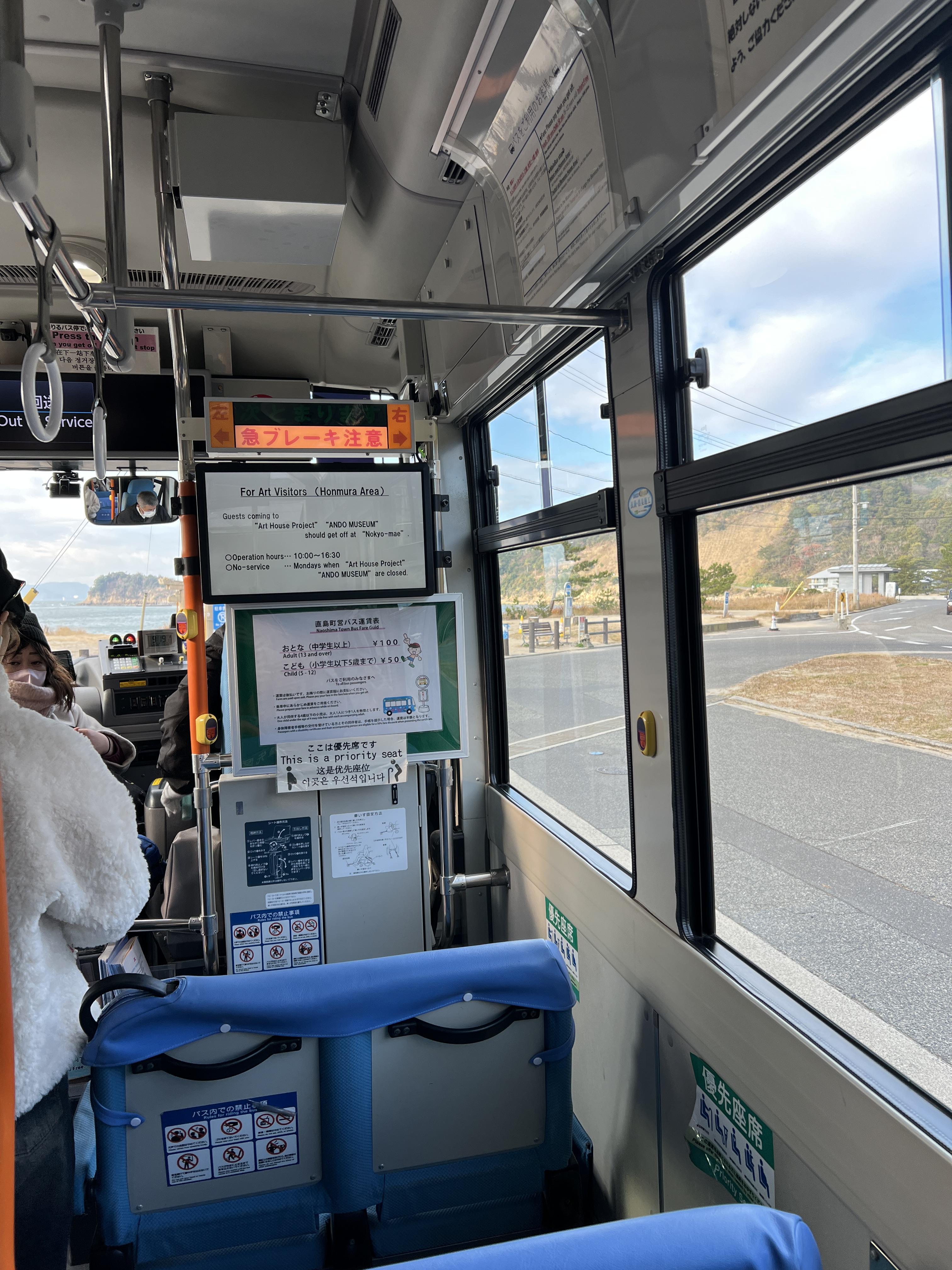 나는 일단 지중미술관을 오전 10시 오픈 시간으로 예약을 했기 때문에 지중미술관으로 바로 이동을 해야 하는데, 지중미술관으로 가기 위해서는 이 100엔 버스를 타고 '츠츠지소'라는 곳까지 한번에 이동한 뒤에, 그곳에서 미술관들을 데려다주는 무료 셔틀로 갈아타야 한다. 처음에는 좀 복잡한데 막상 사람들 따라다니면 어렵지는 않다.