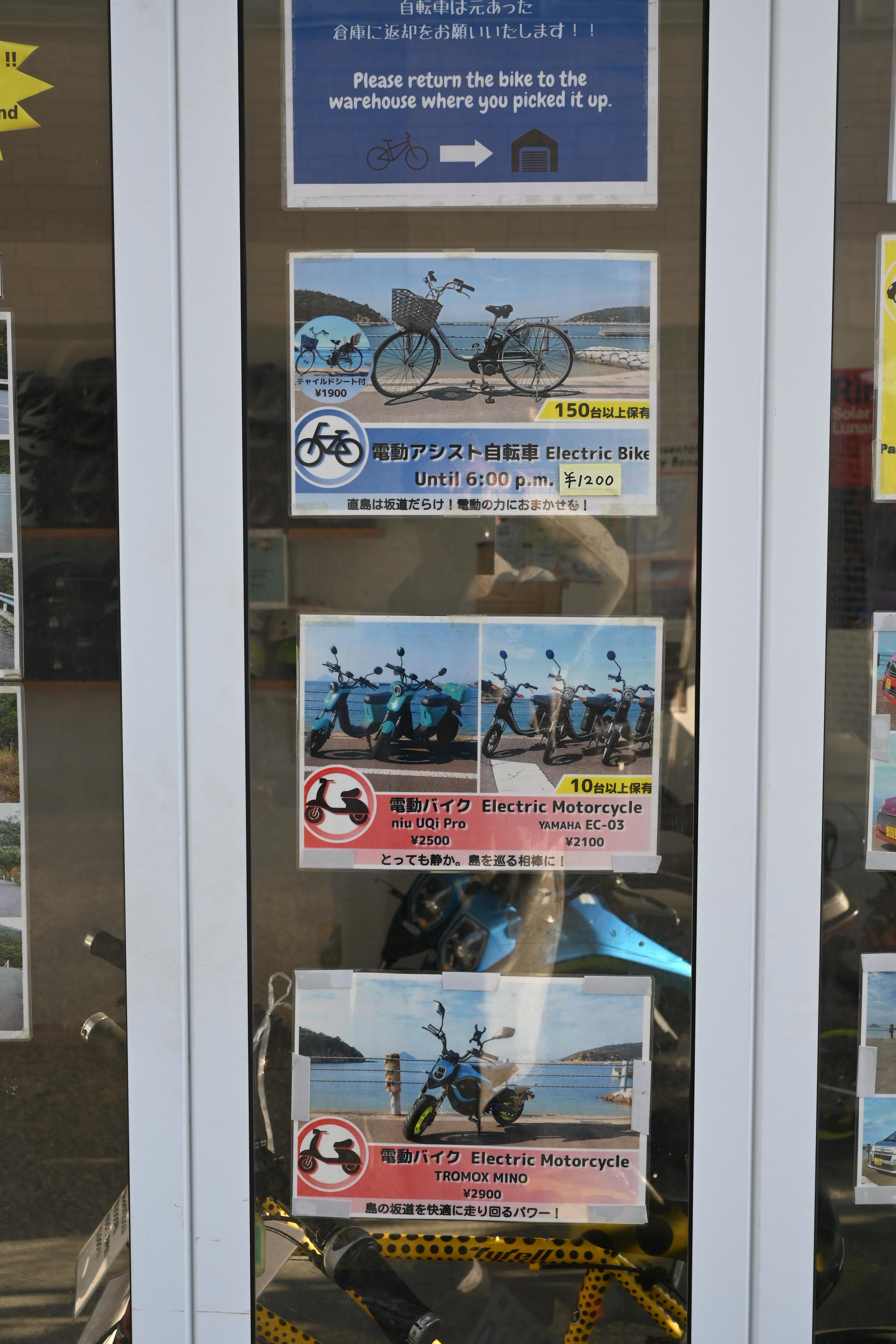 스쿠터는 2500엔인데 개인적으로 자전거 타고 다니기에는 섬이 좀 큰 느낌도 있어서 스쿠터를 대여하는 것도 괜찮은 것 같다.