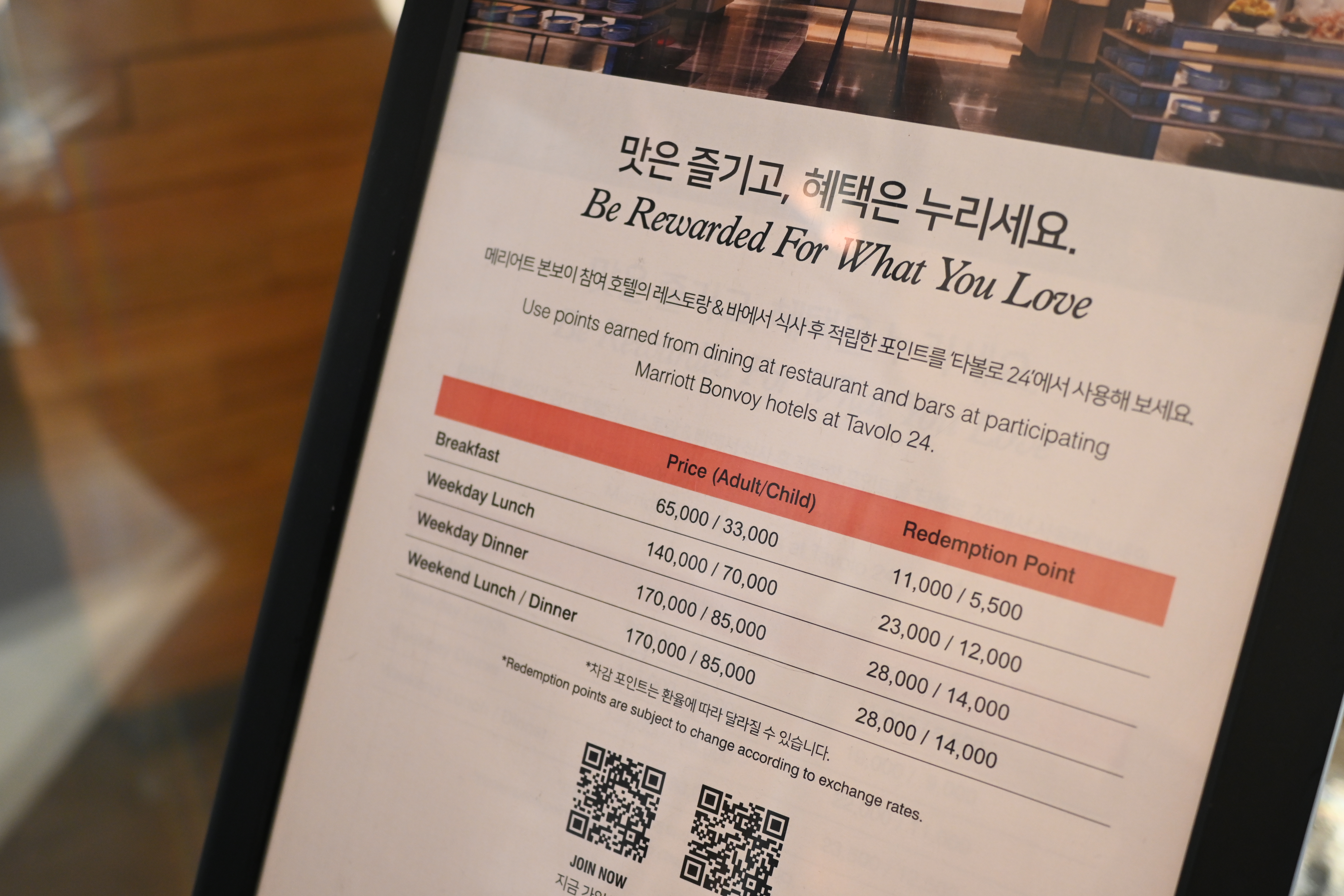 조식 정가는 65,000원인데 메리어트 본보이 카드로 5만원 혜택을 받을 수 있으니 15,000원에 먹는 셈이다.