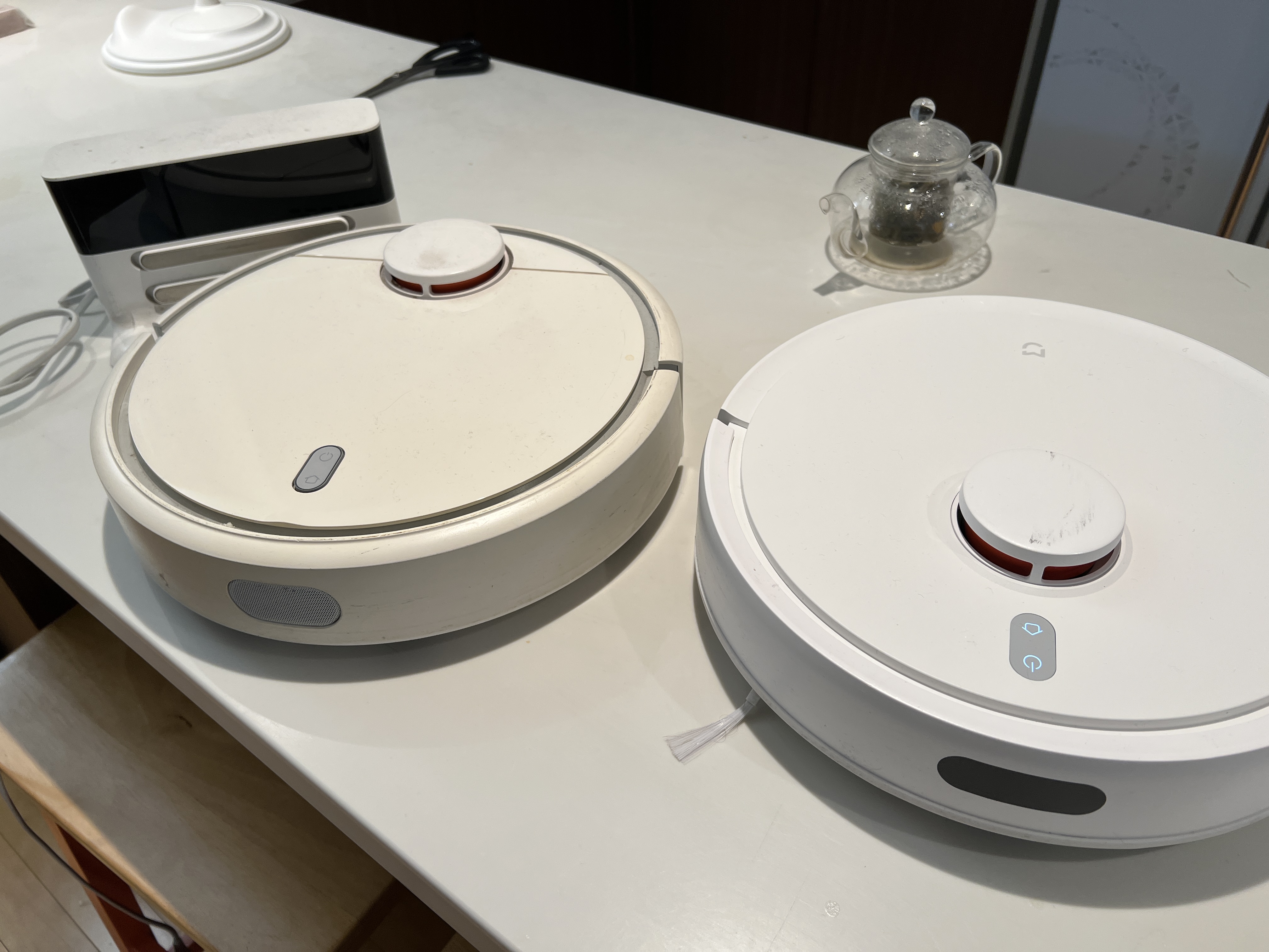 왼쪽에 있는 게 2016년부터 사용한 제품인데, 뭐 이때나 지금이나 로봇청소기 디자인에서는 크게 달라진 건 없는데, 확실히 이번에 구매한 신형 제품이 좀 더 깔끔하고 견고한 느낌이 든다.