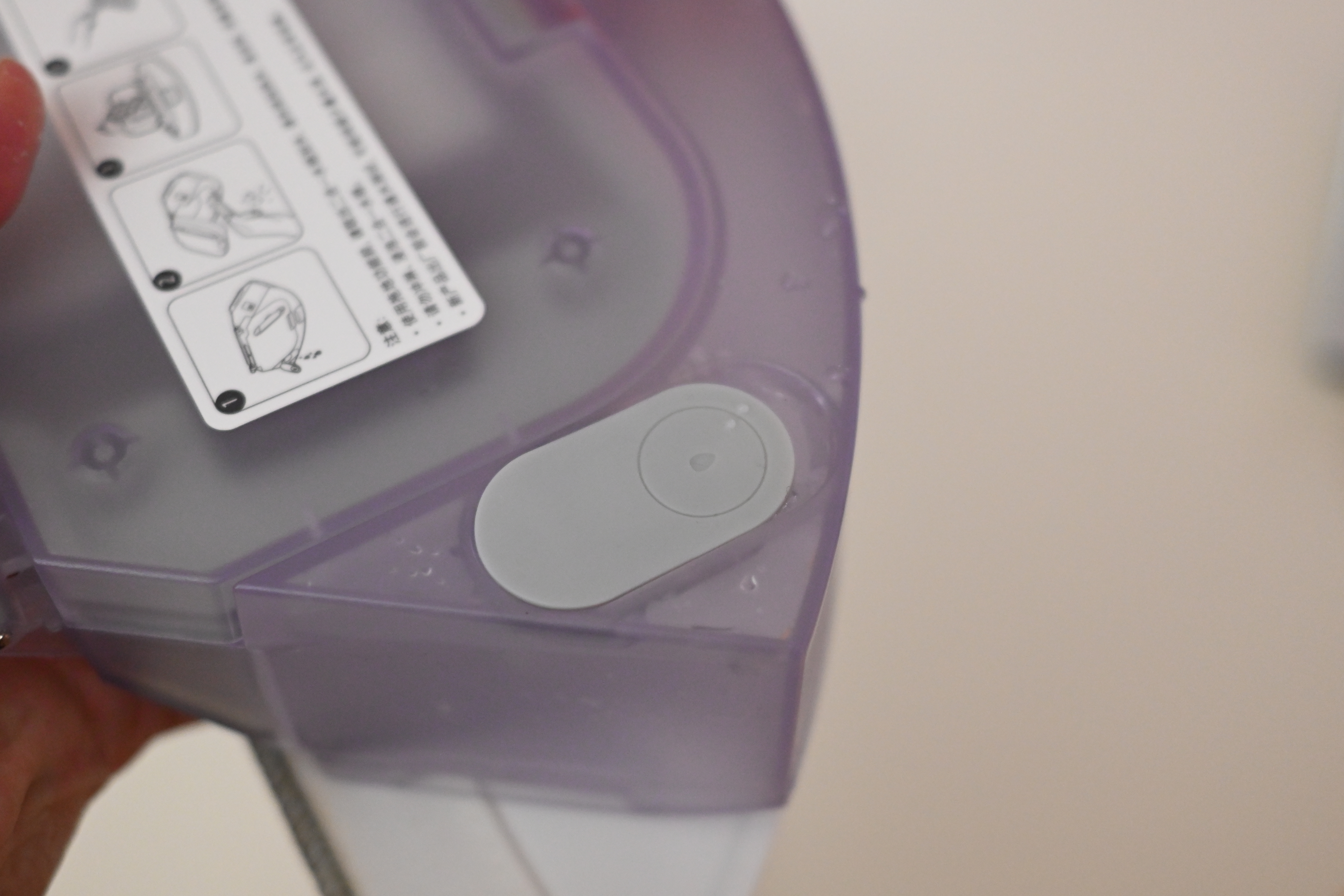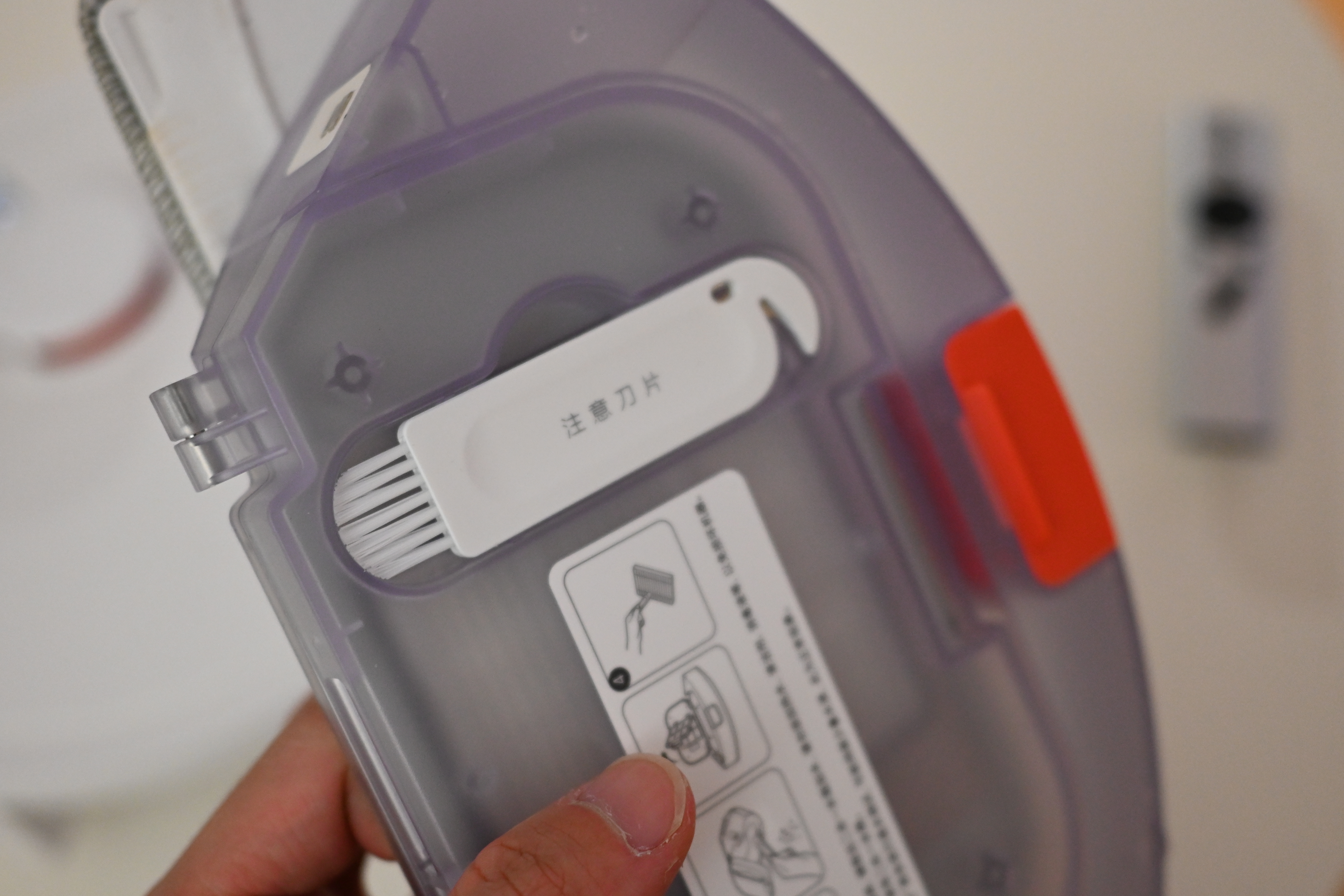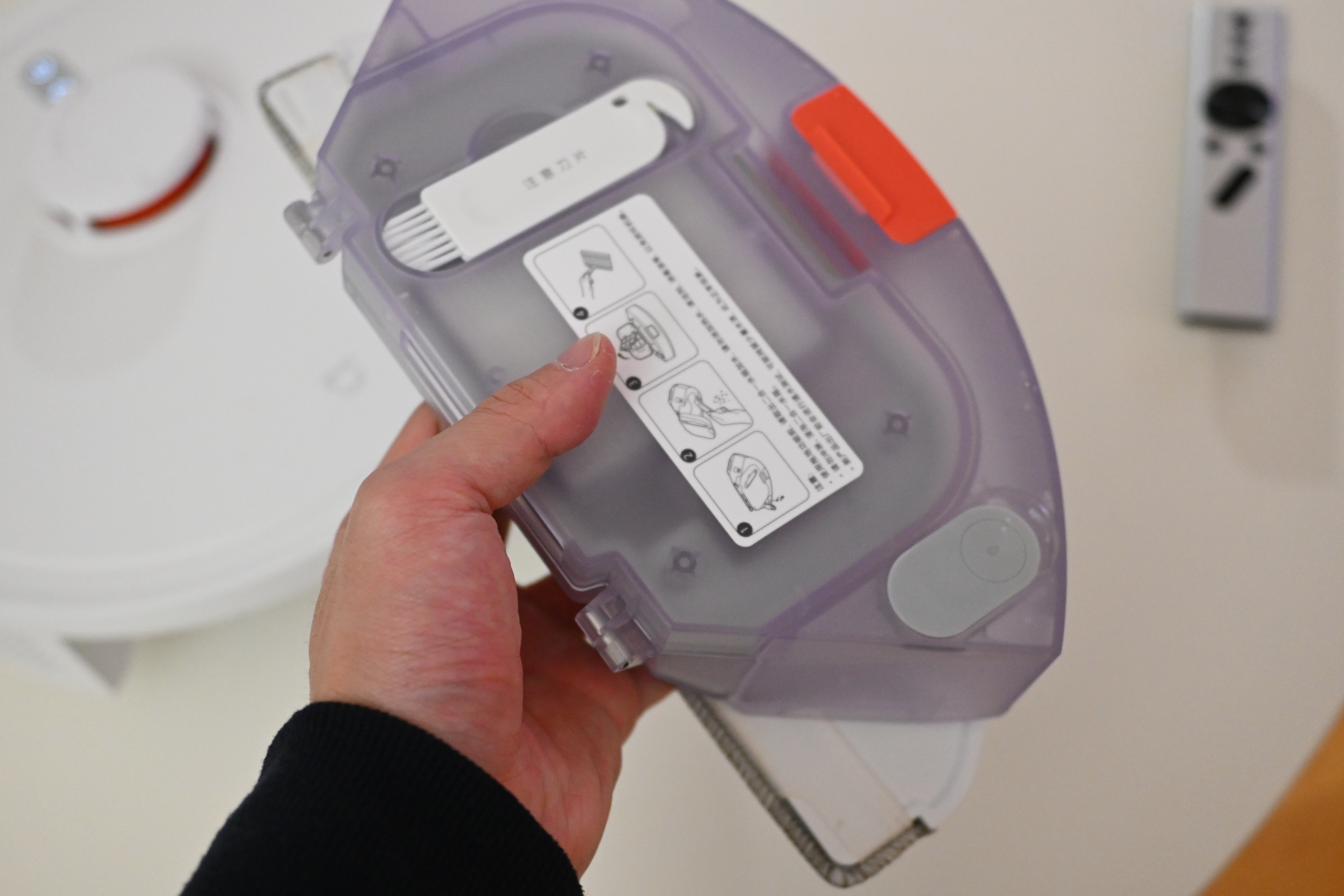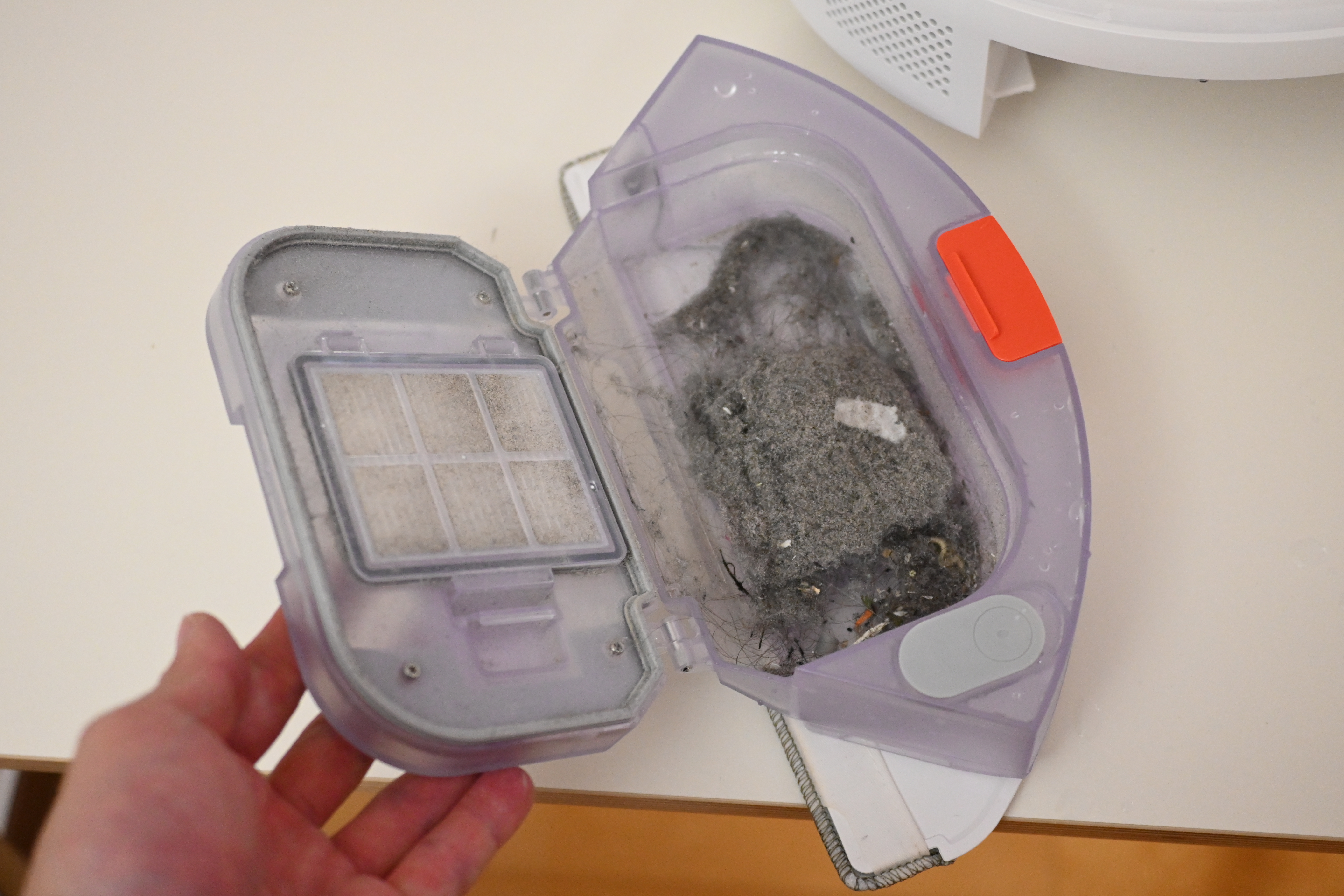 먼지통을 분리하면 이런 모습인데, 먼지통과 물통이 하나로 합쳐진 형태이다. 저 오른쪽에 있는 고무 마개를 열어서 물을 리필해주면 된다.