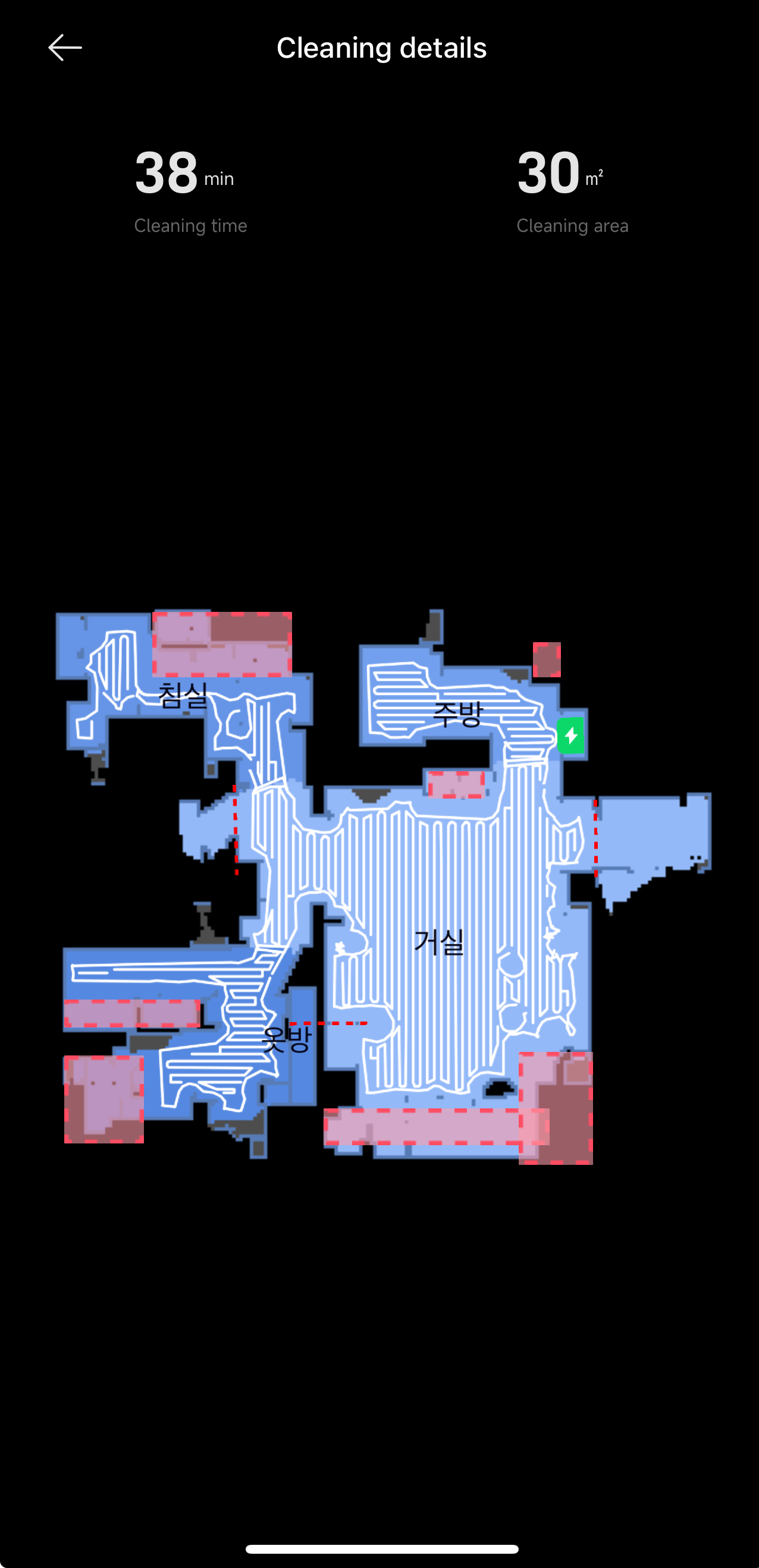 그리고 실제로 로봇청소기가 청소를 한 구역도 앱으로 확인할 수 있는데, 청소 금지구역을 알아서 잘 피해서 청소한 것을 확인할 수 있다.