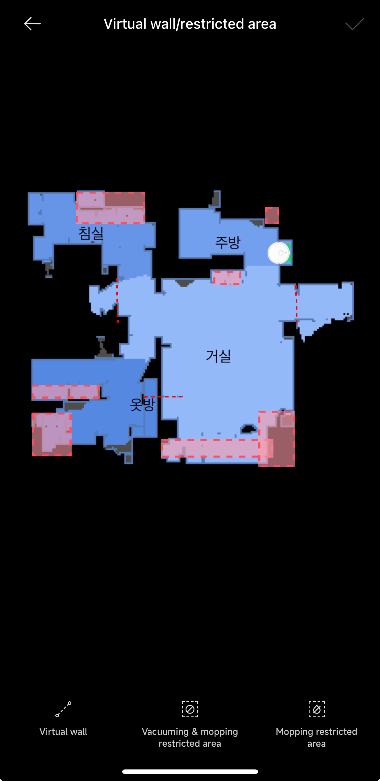 간혹 로봇청소기를 돌리다보면 로봇청소기가 헤매다가 못 나오는 구역, 화장실이나 신발장과 같이 빠져버리는 구역, 바닥에 잔짐들이 많아서 로봇청소기가 청소하기에 적합하지 않은 구역 등이 있기 마련인데, 그런 공간들을 저렇게 청소 금지 구역으로 지정해두면 된다.